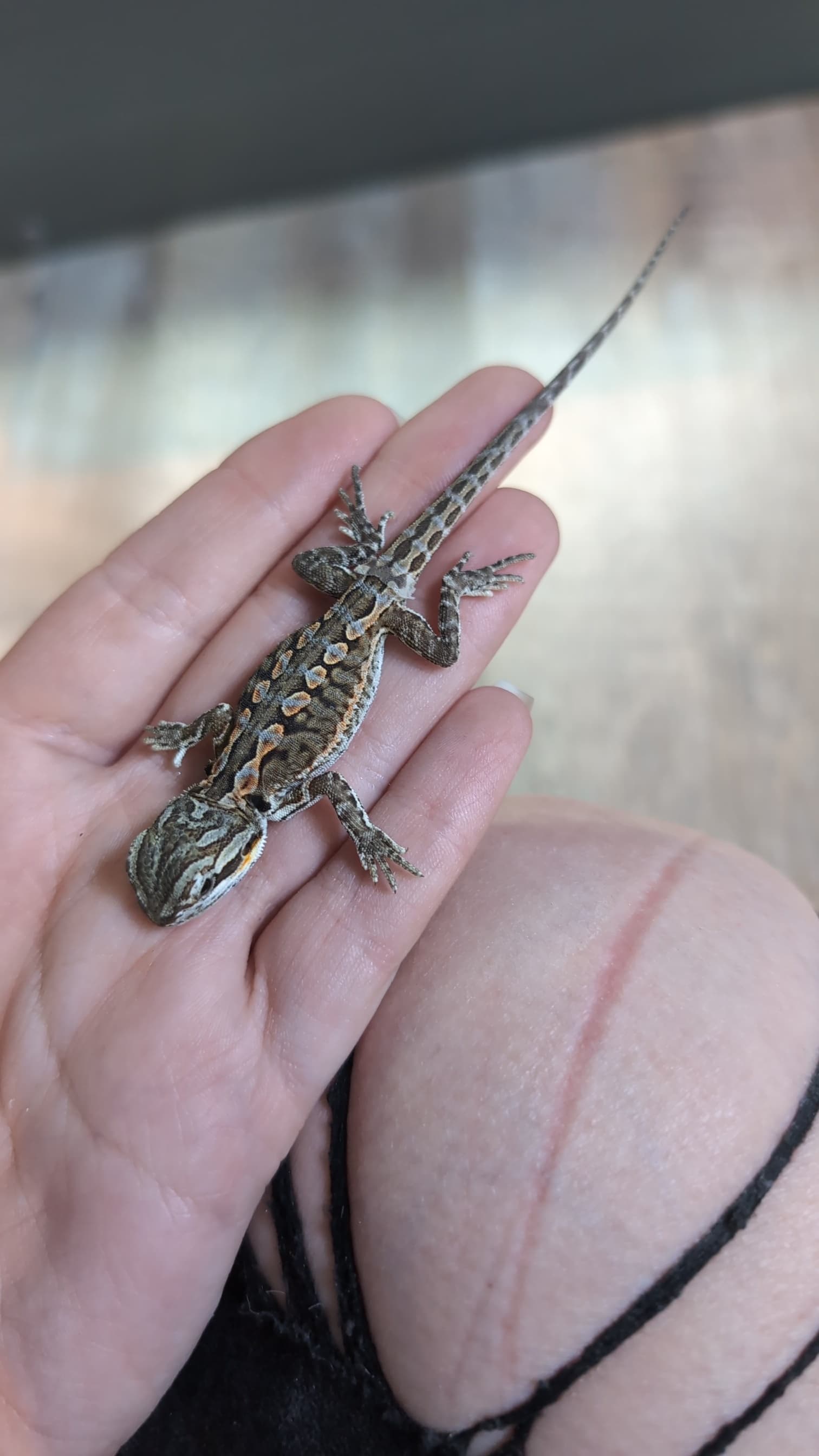 Aug 8 - Hatchling emerged overnight and was left to rest in the incubator. Fed 3x xxxs mealworm, drank water, moved into hatchling enclosure in the PM with salad offered. Very active & alert.