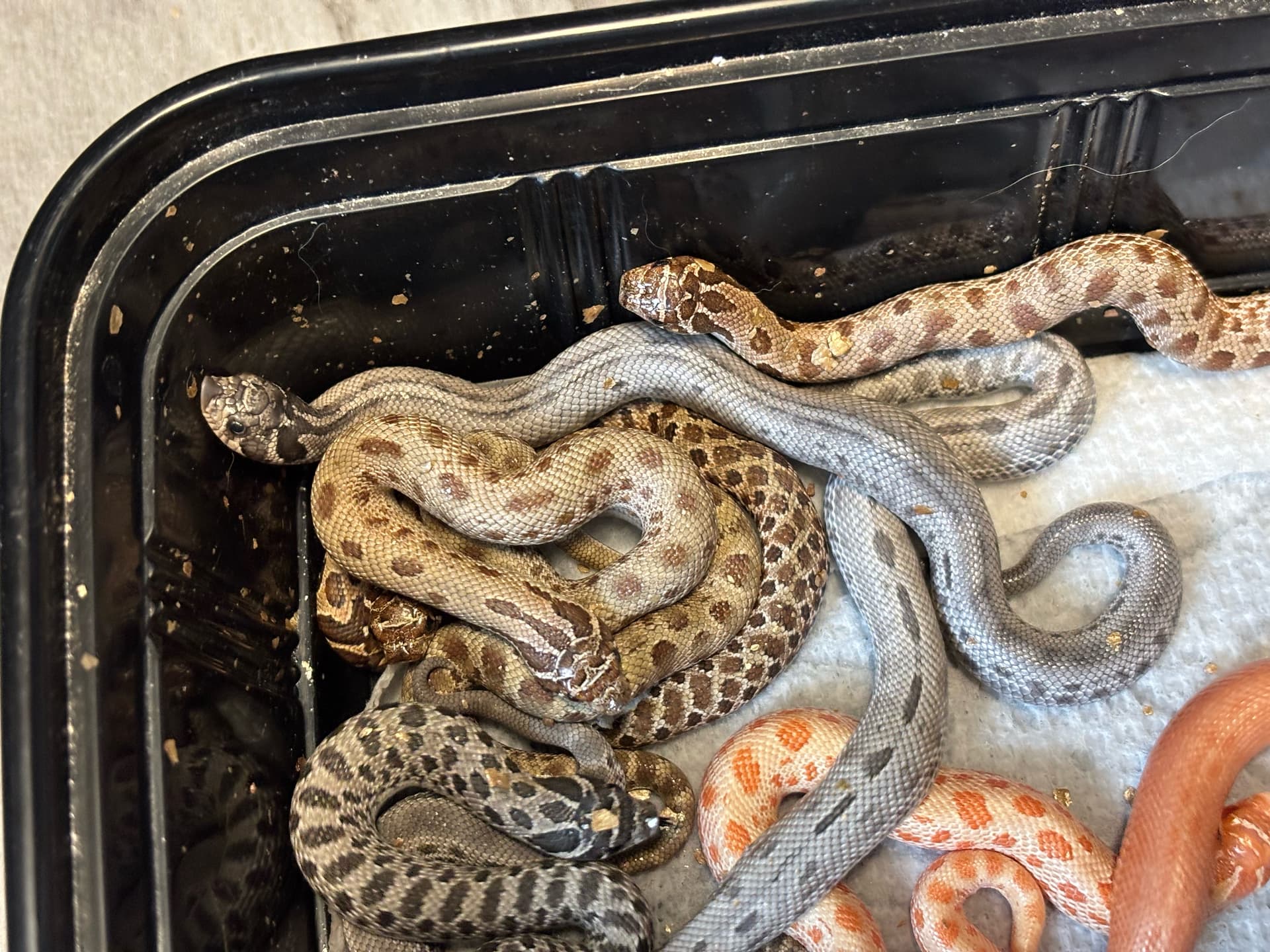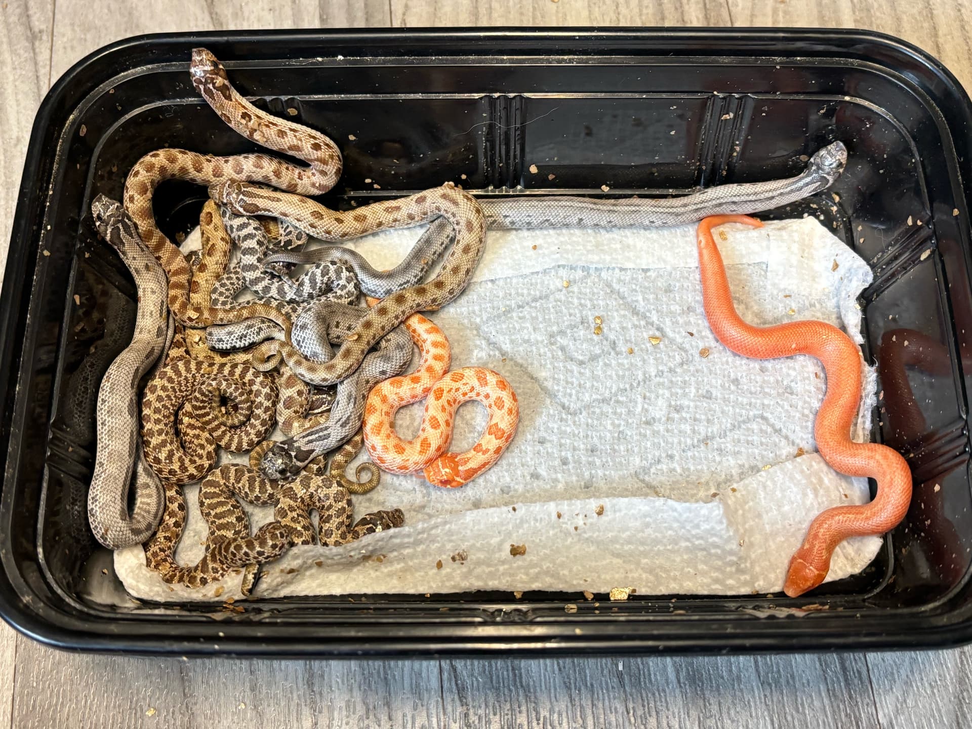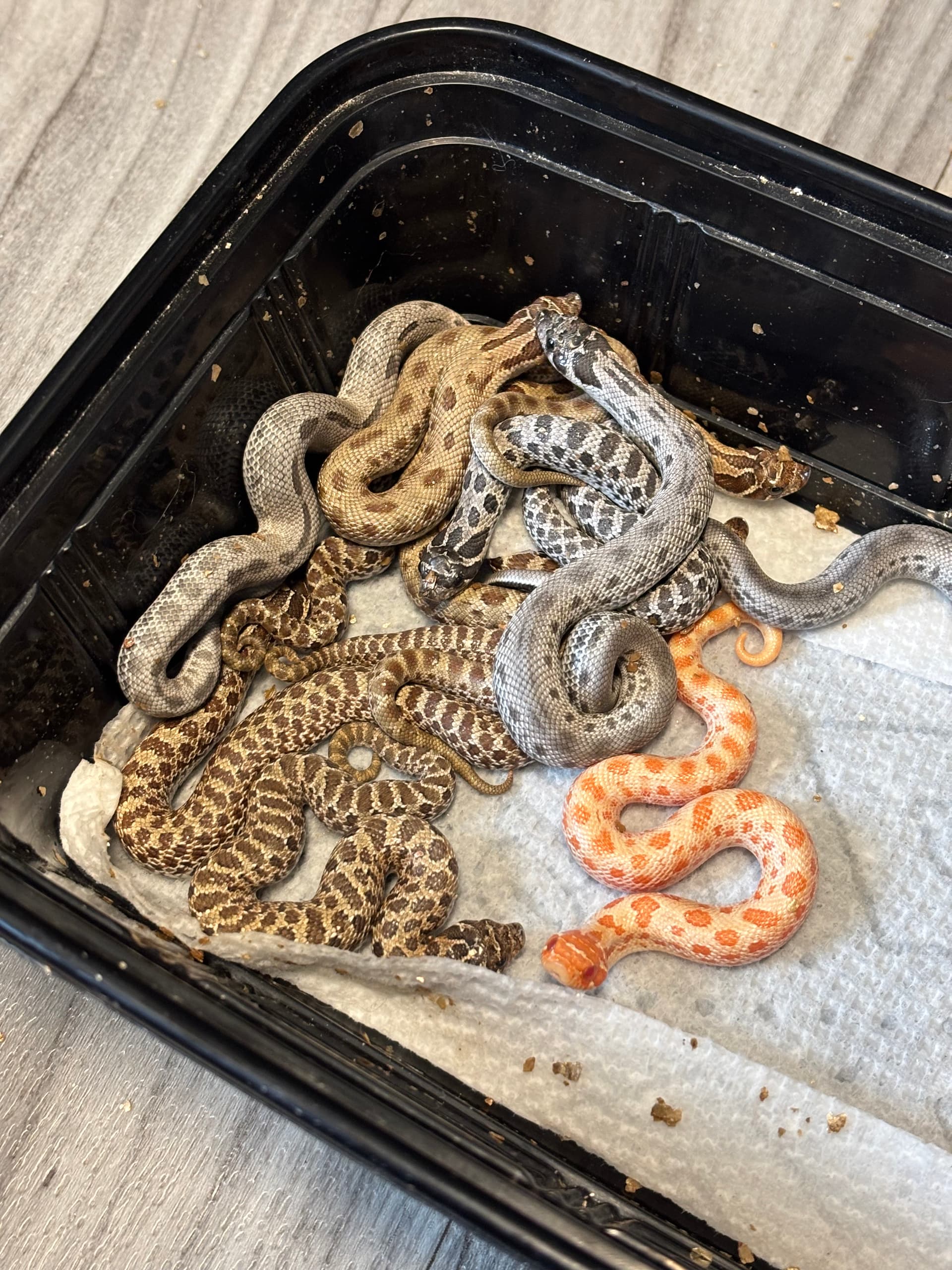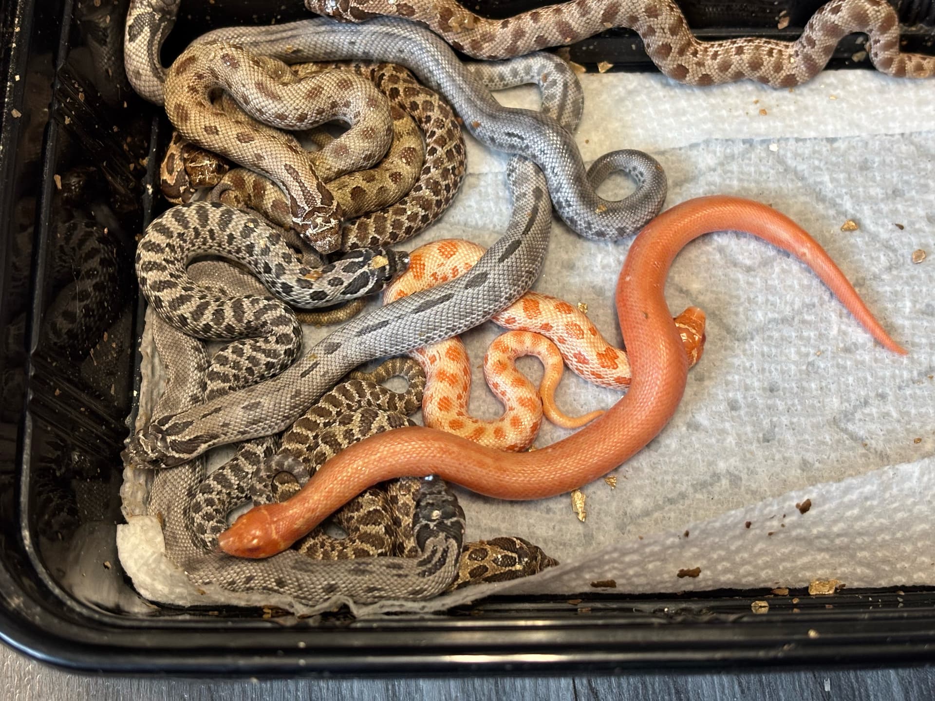 Okay! I think I info dumped enough so here is a bunch of pictures! Final count is 2 axanthic condas, 1 axanthic, 1 axanthic cinnamon, 1 albino conda, 1 albino cinnamon, 3 normal condas, 3 normals. All twelve are male so either I am incredibly unlucky or something funky is going on (sex linked?)