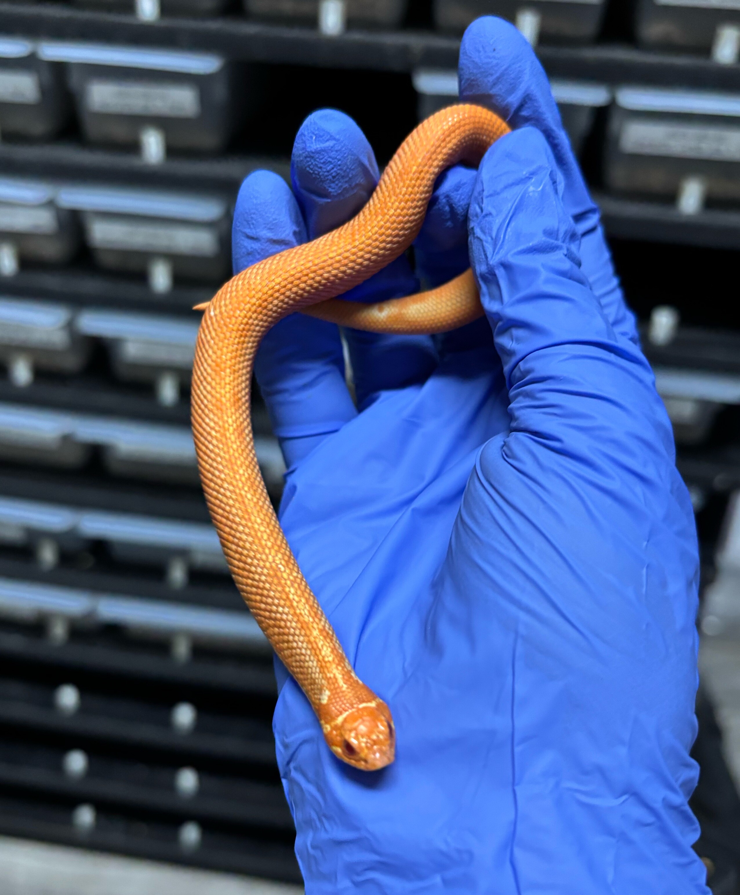 I believe it is only expressing with Conda and the two together are creating an overall patternless snake, much like a homozygous conda (superconda). This also makes sense to me since only the mom has conda and I believe, but have not proven, that this new gene is coming from the father. Statistics wise if this gene were acting on it’s own I would think I’d see more of them rather than the scattering and low numbers I have as of yet.