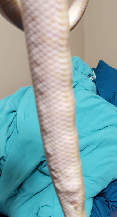 She’s more on the slender side since her spay almost a year ago. The timing and look is exactly like it was when I brought her in when she was egg bound originally. She definitely has the teardrop-esque figure of a gravid corn, and the lumps are only between her surgical incisions (a.k.a. her reproductive tract area) but not down to her cloaca. She’s also in blue despite having shed when I was out of the country. The whole thing isn’t making sense.