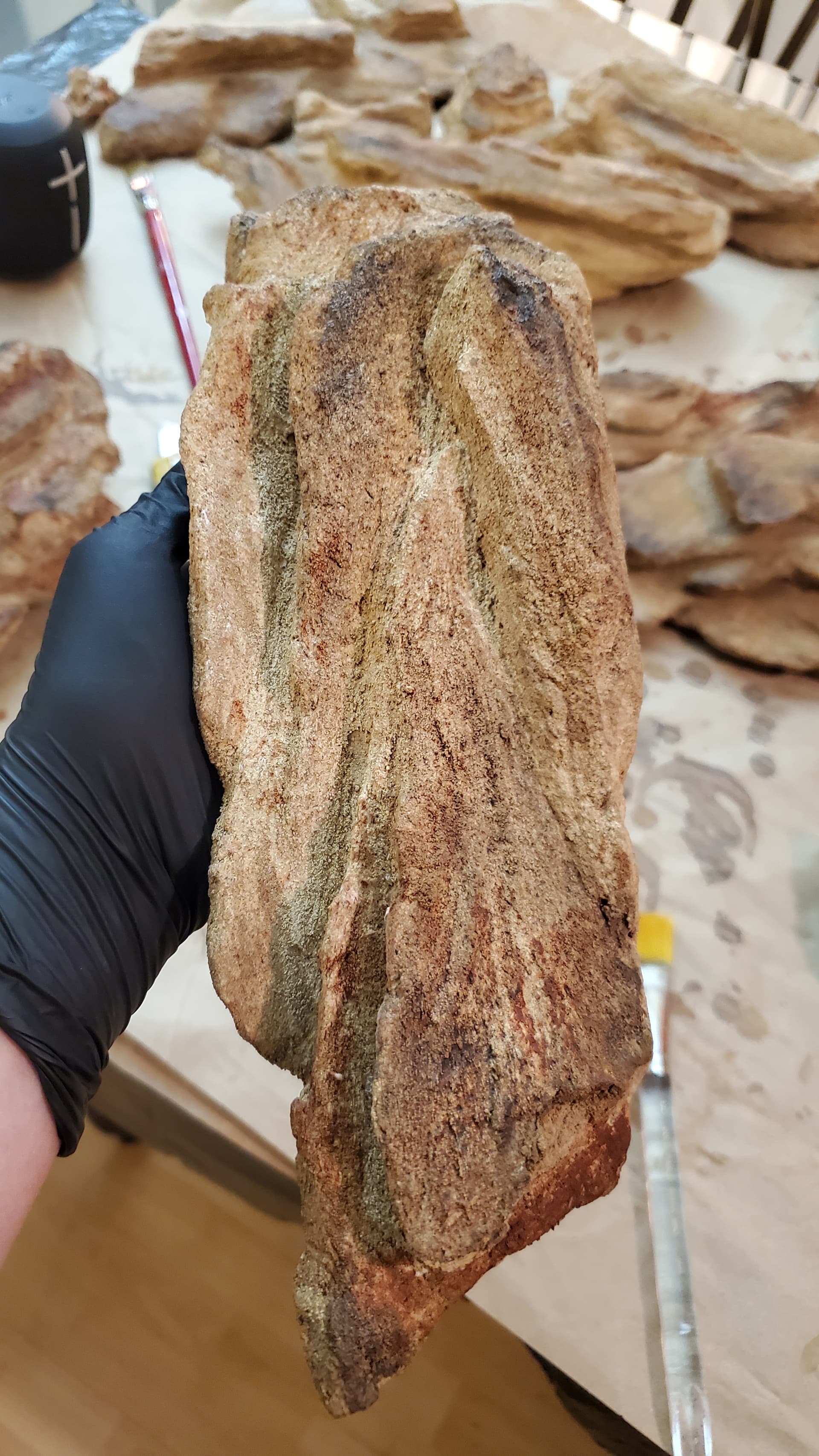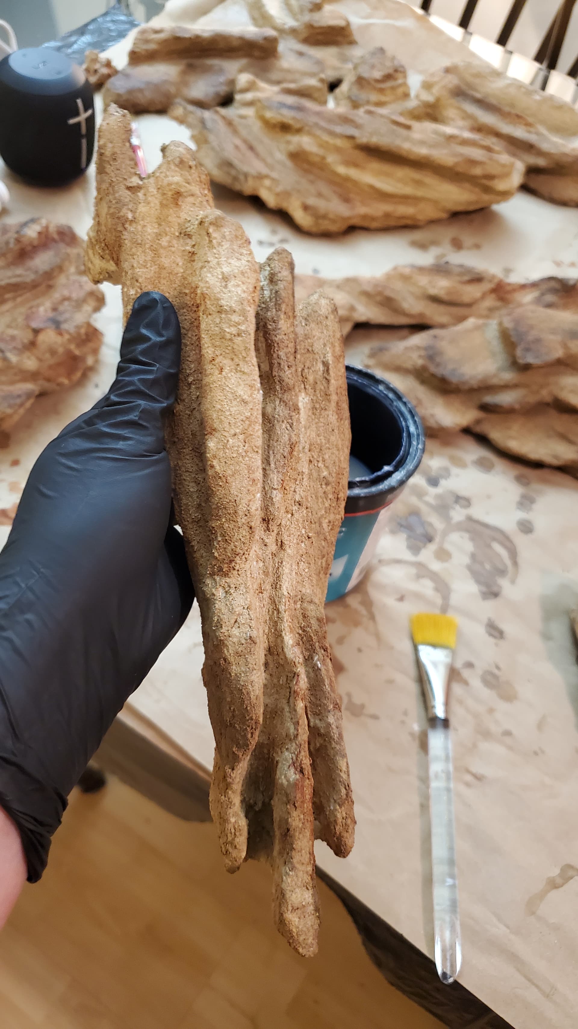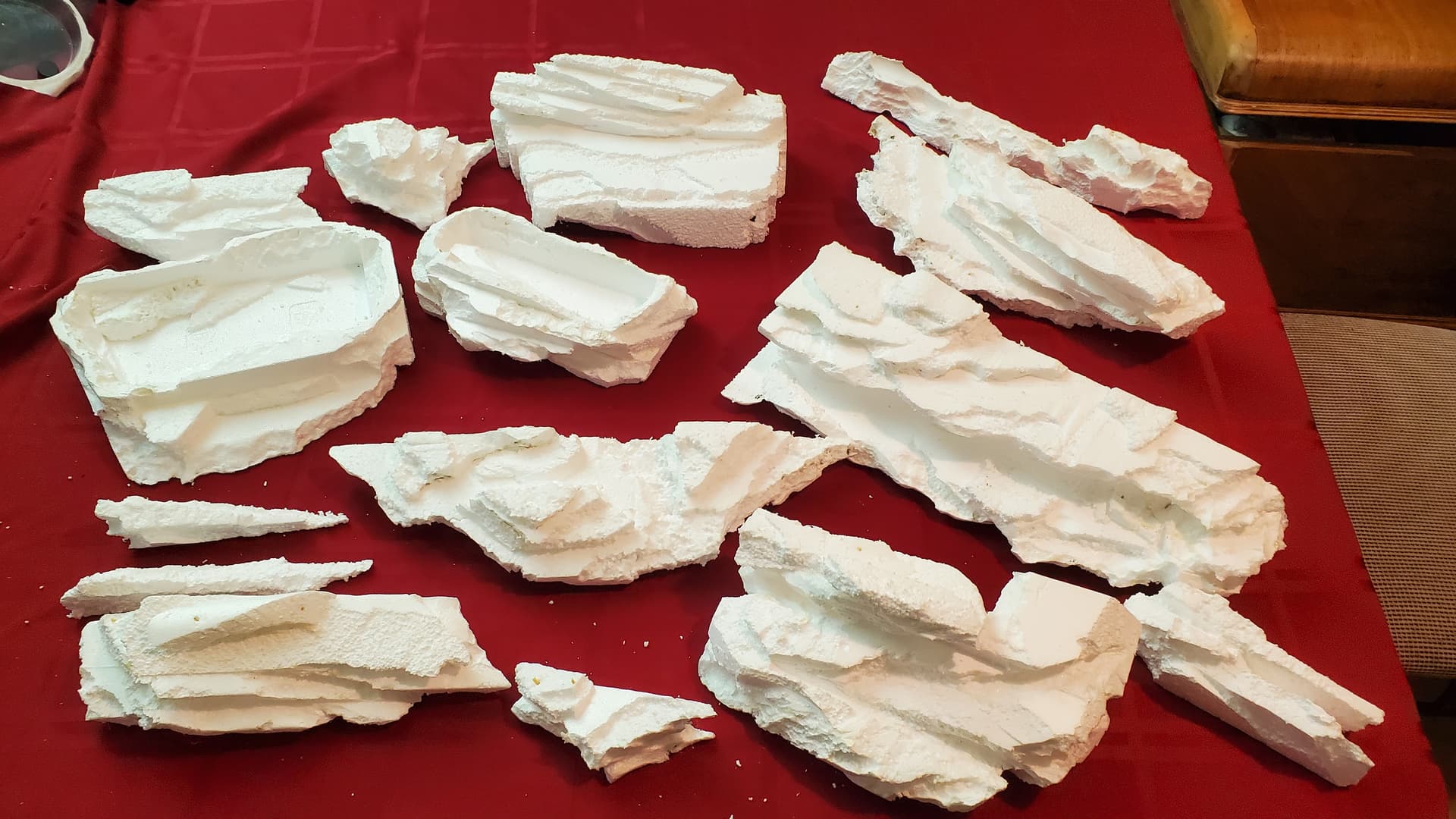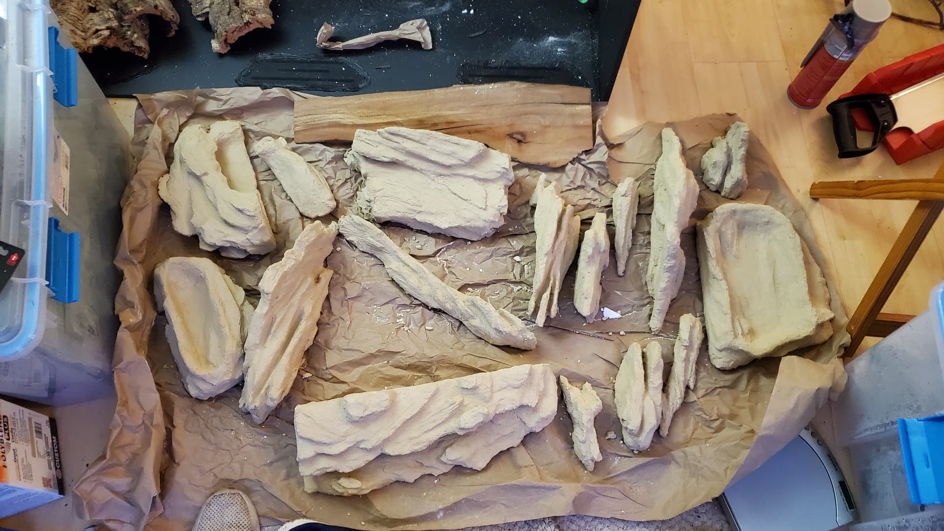 Trying to riff off of the shape of the rocks I had brought home, I carved a whole bunch – two batches, I didn’t photograph the first batch – out of styrofoam. My living room was a bit of a mess after that. (This is foreshadowing.)