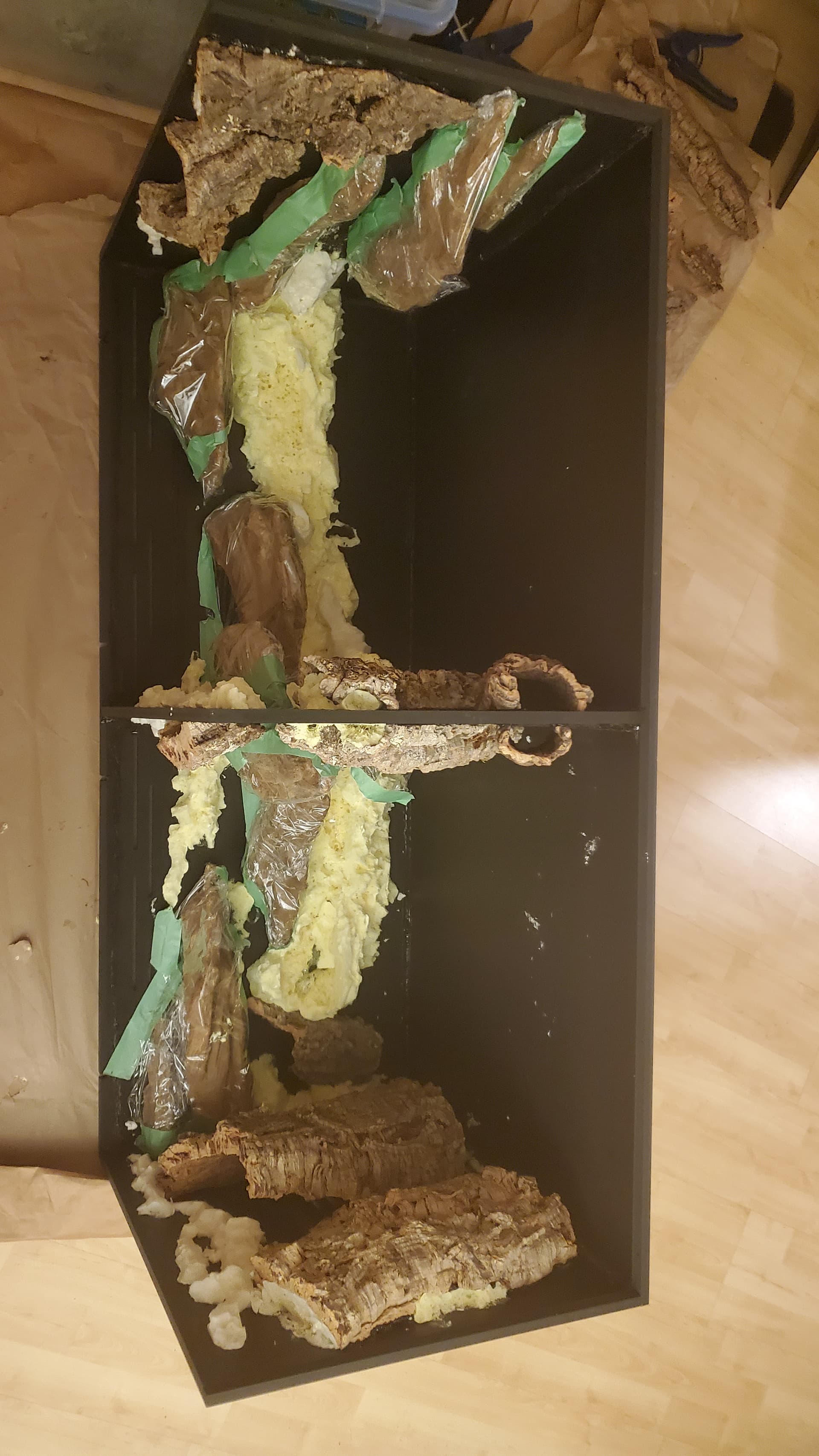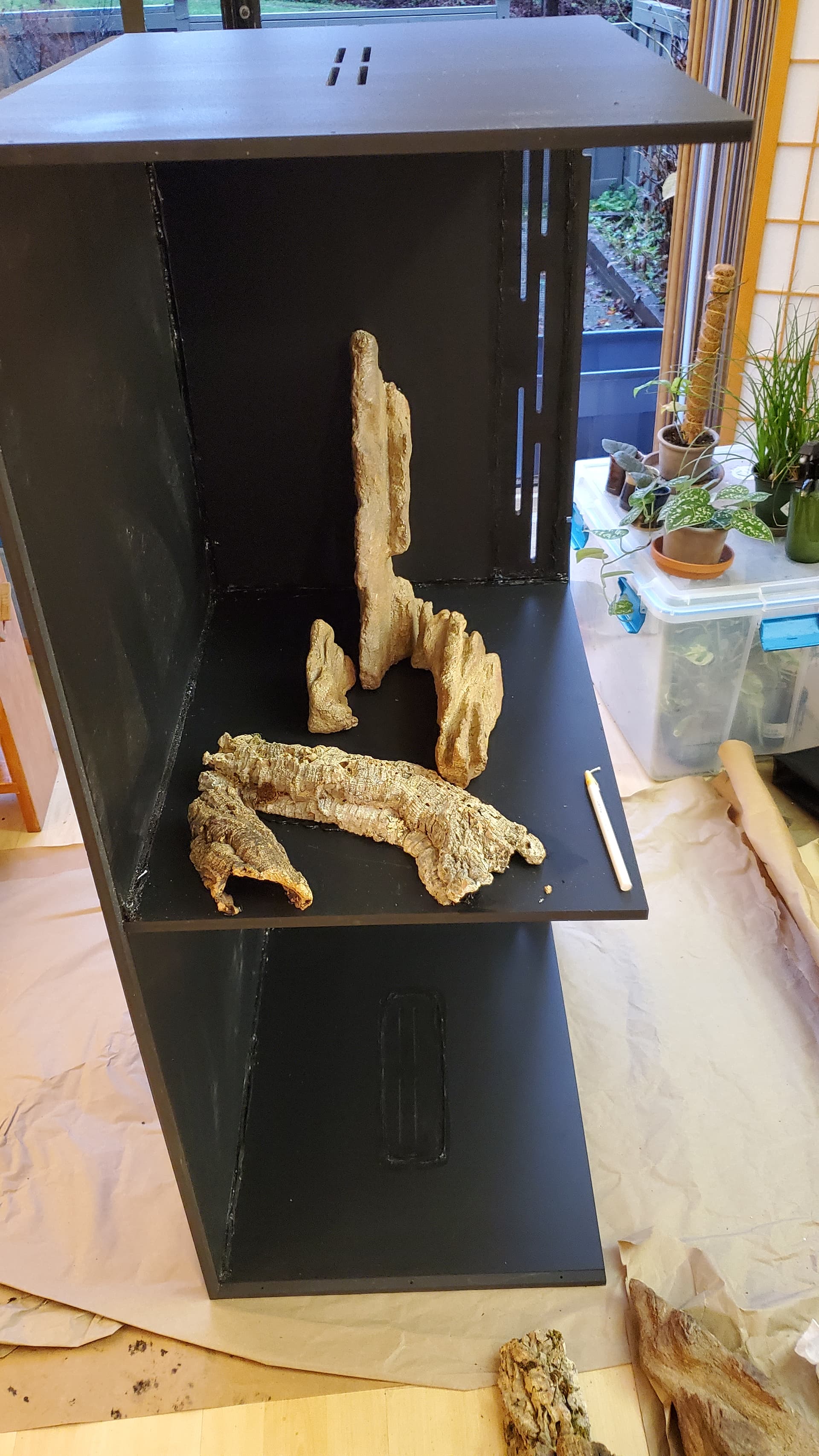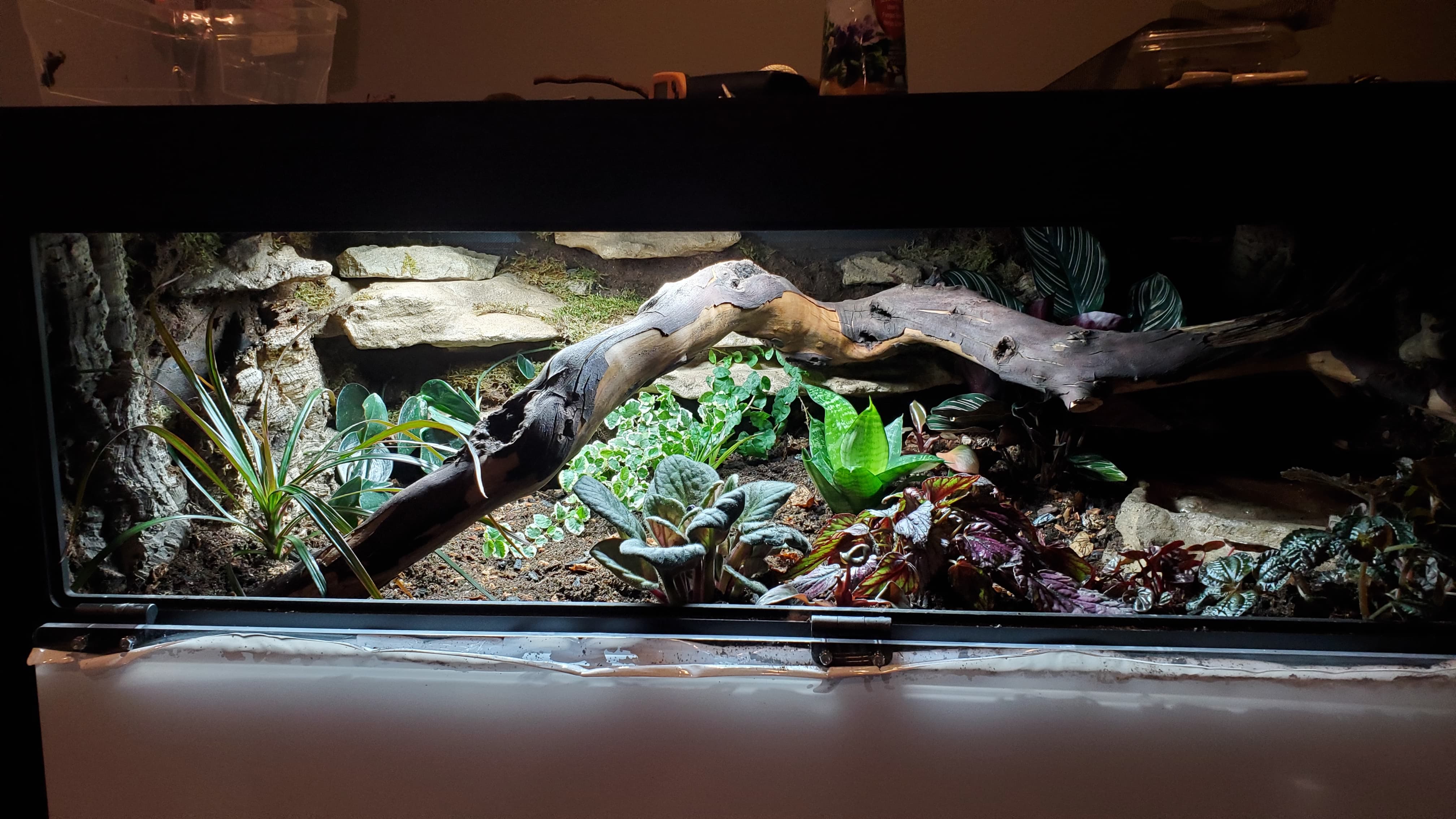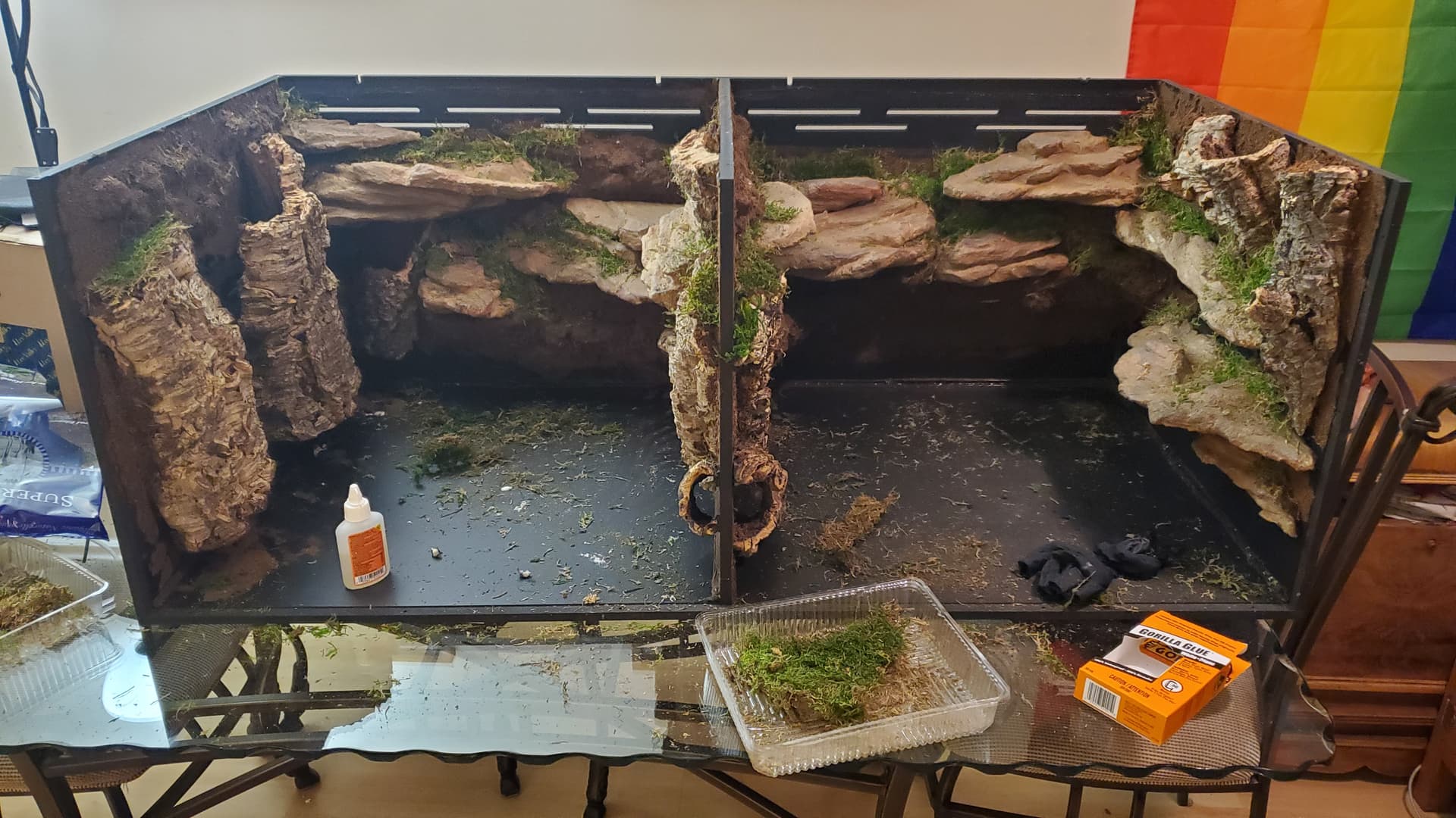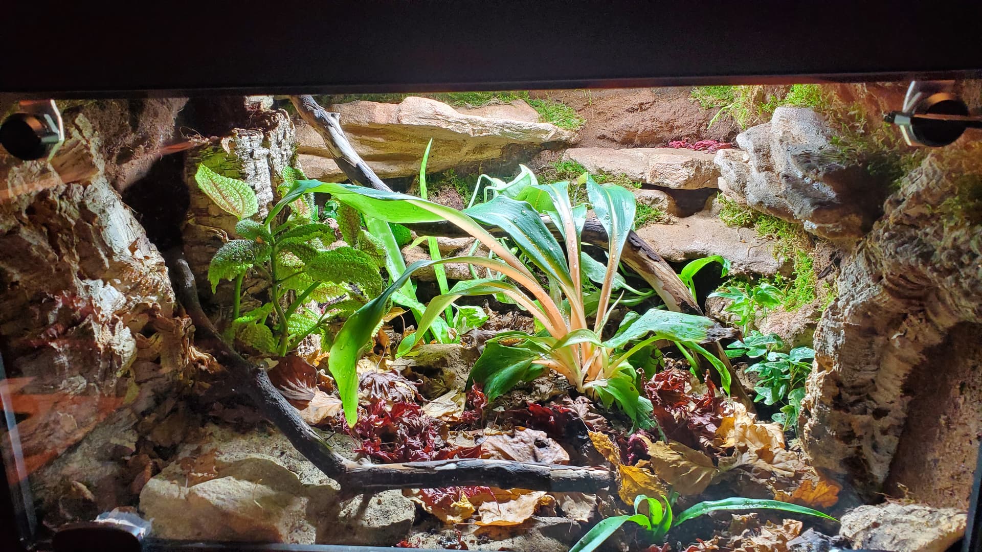 I’m pretty happy with it. There are a ton of nooks and crannies for her to enjoy and explore, a solid heat gradient, and later, after things settle a bit, I tucked a couple of little coconut hides in unobtrusive spots.