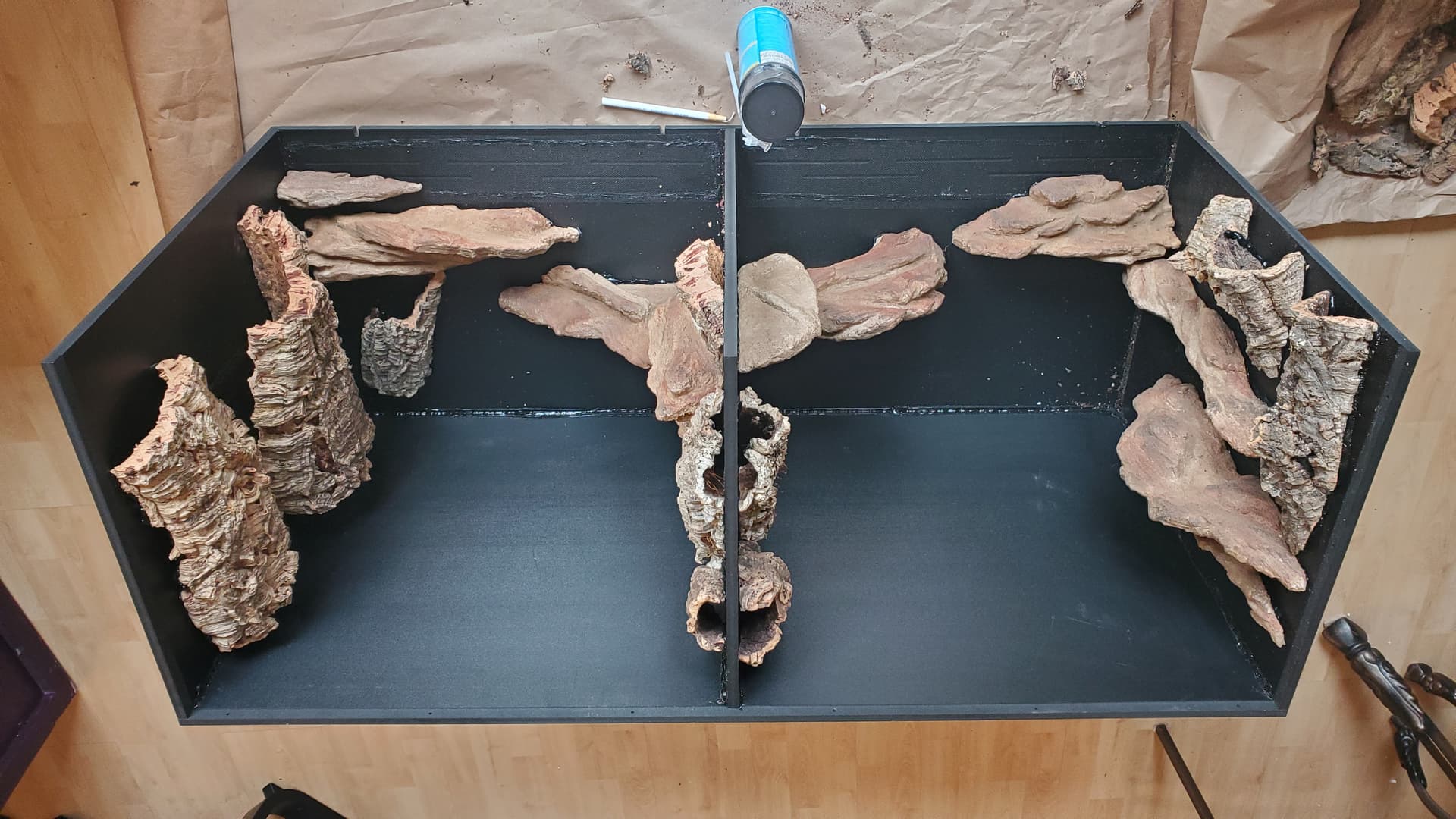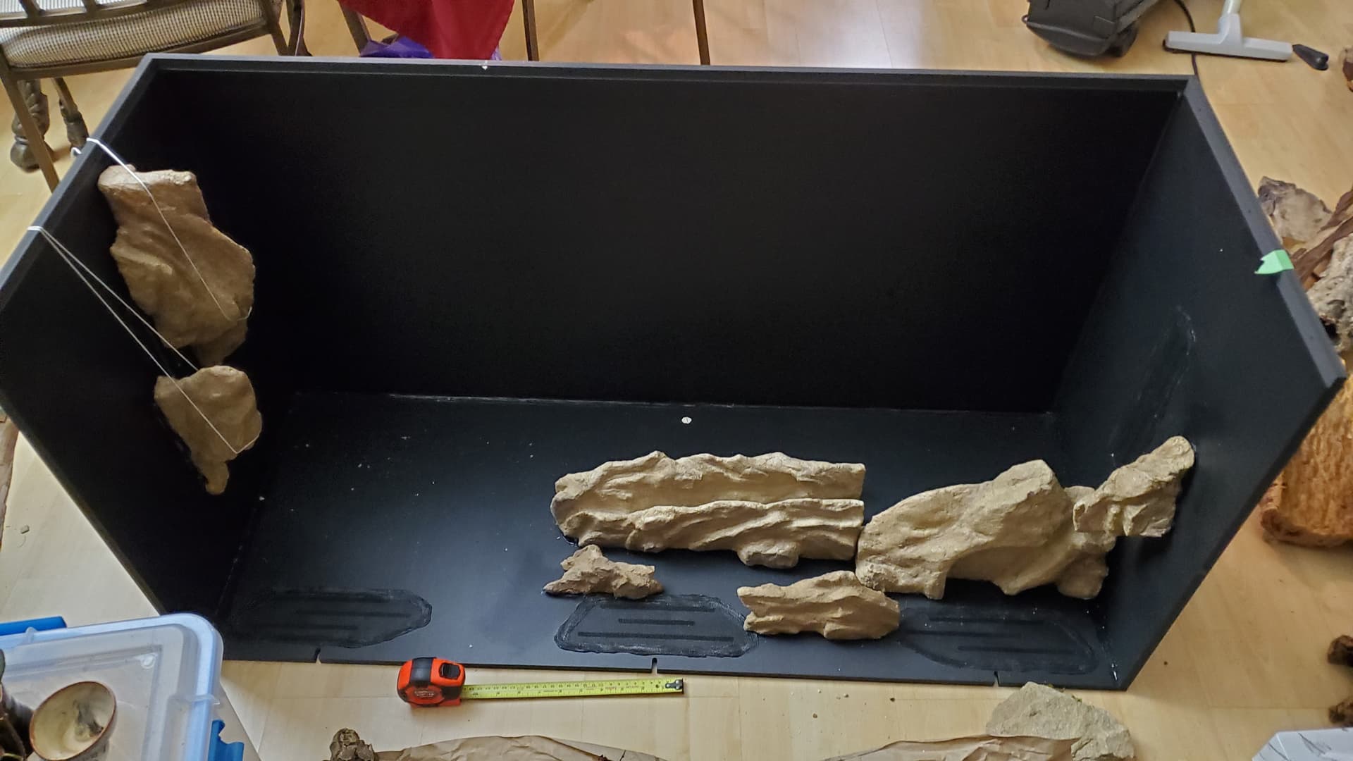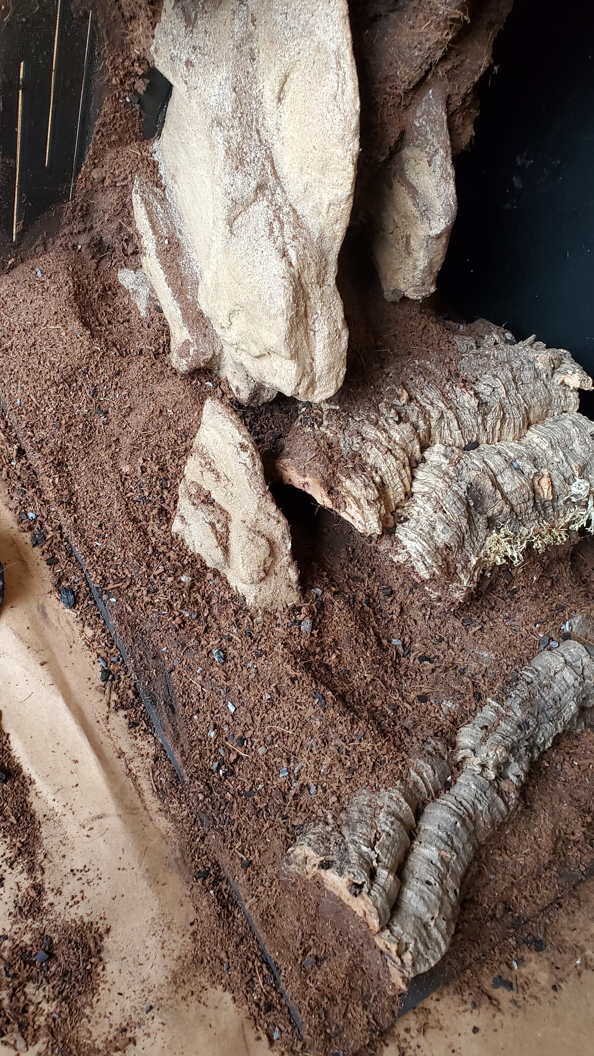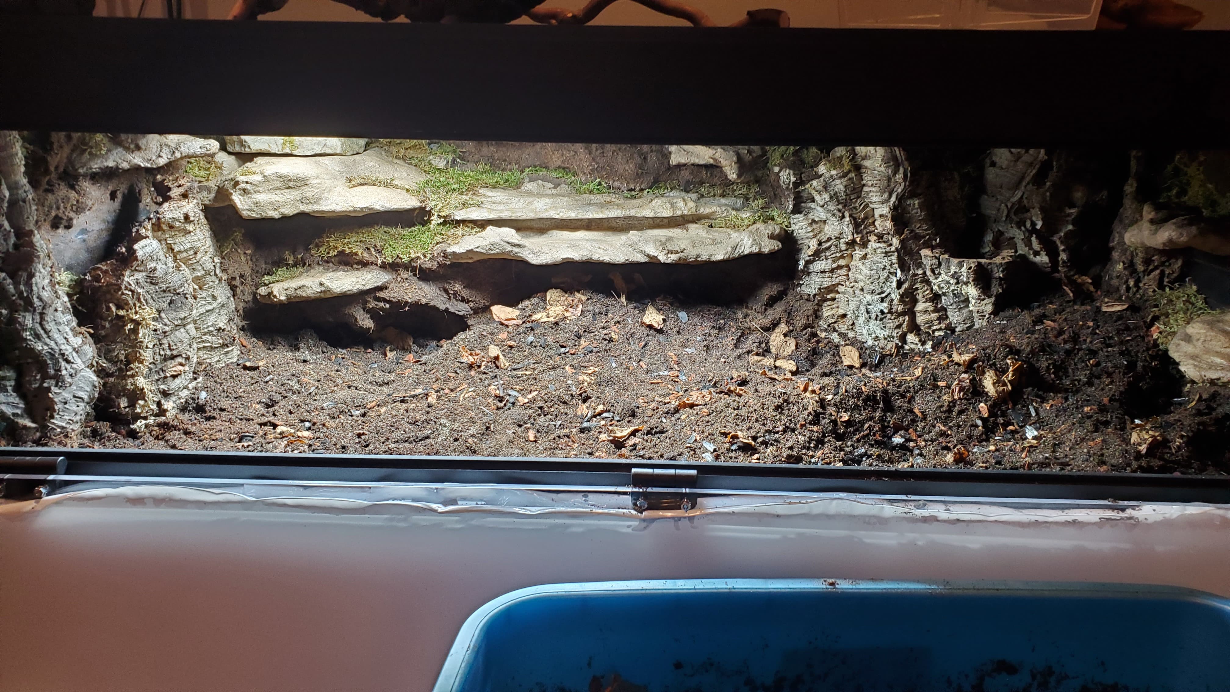 I’m pretty happy with it. There are a ton of nooks and crannies for her to enjoy and explore, a solid heat gradient, and later, after things settle a bit, I tucked a couple of little coconut hides in unobtrusive spots.