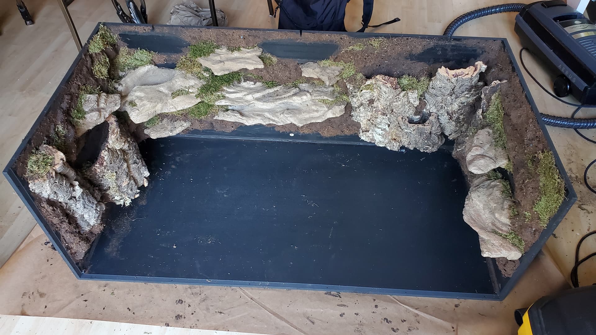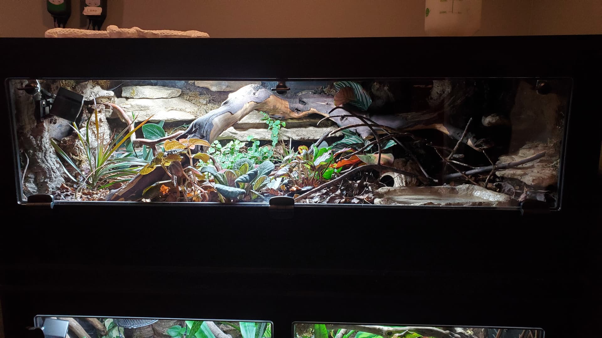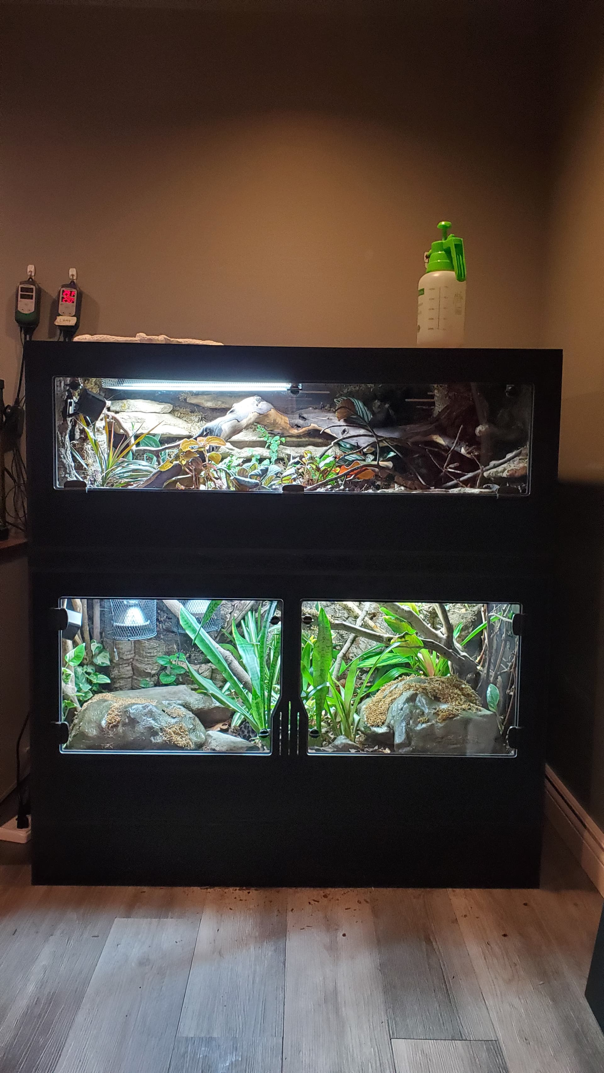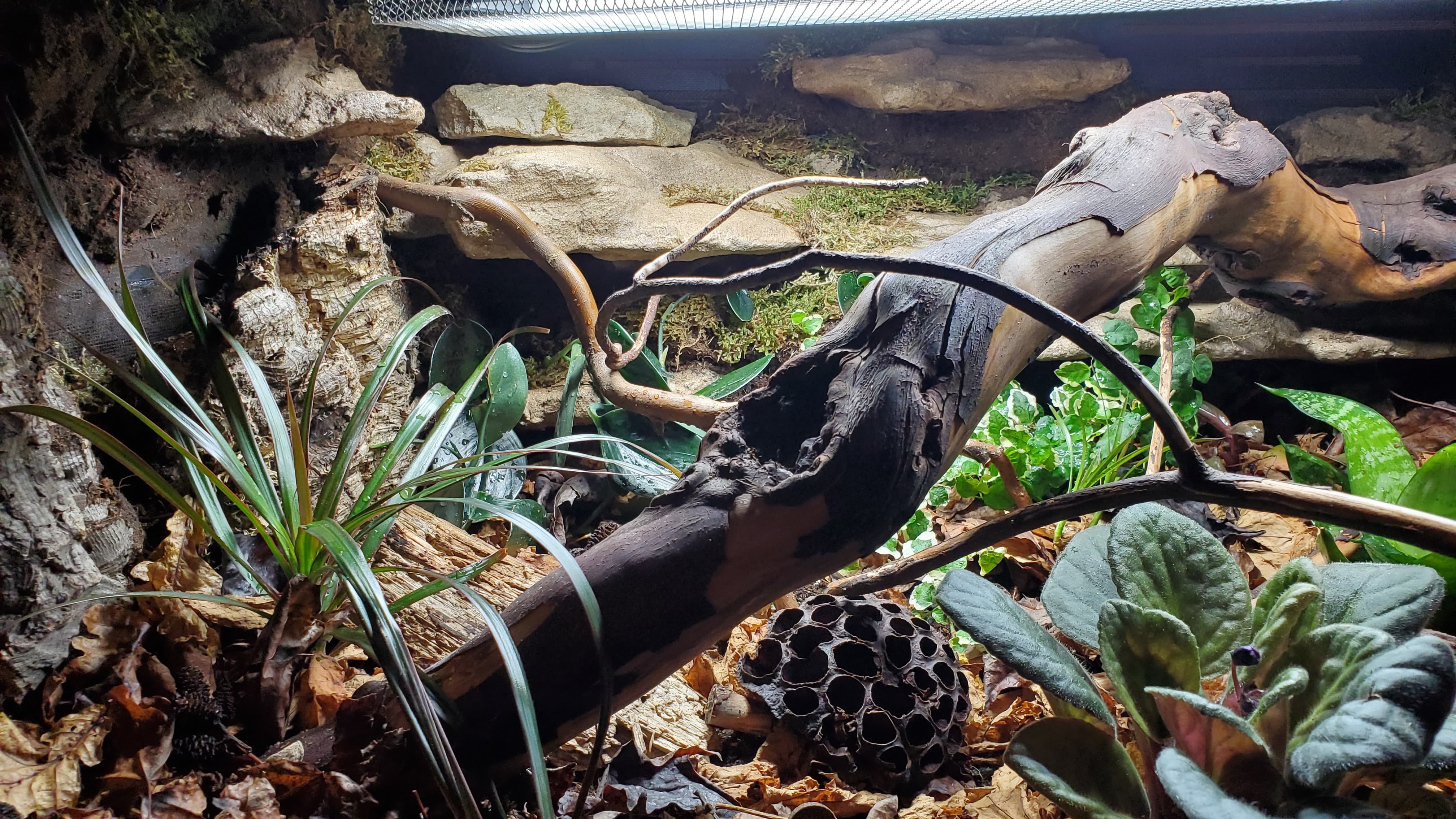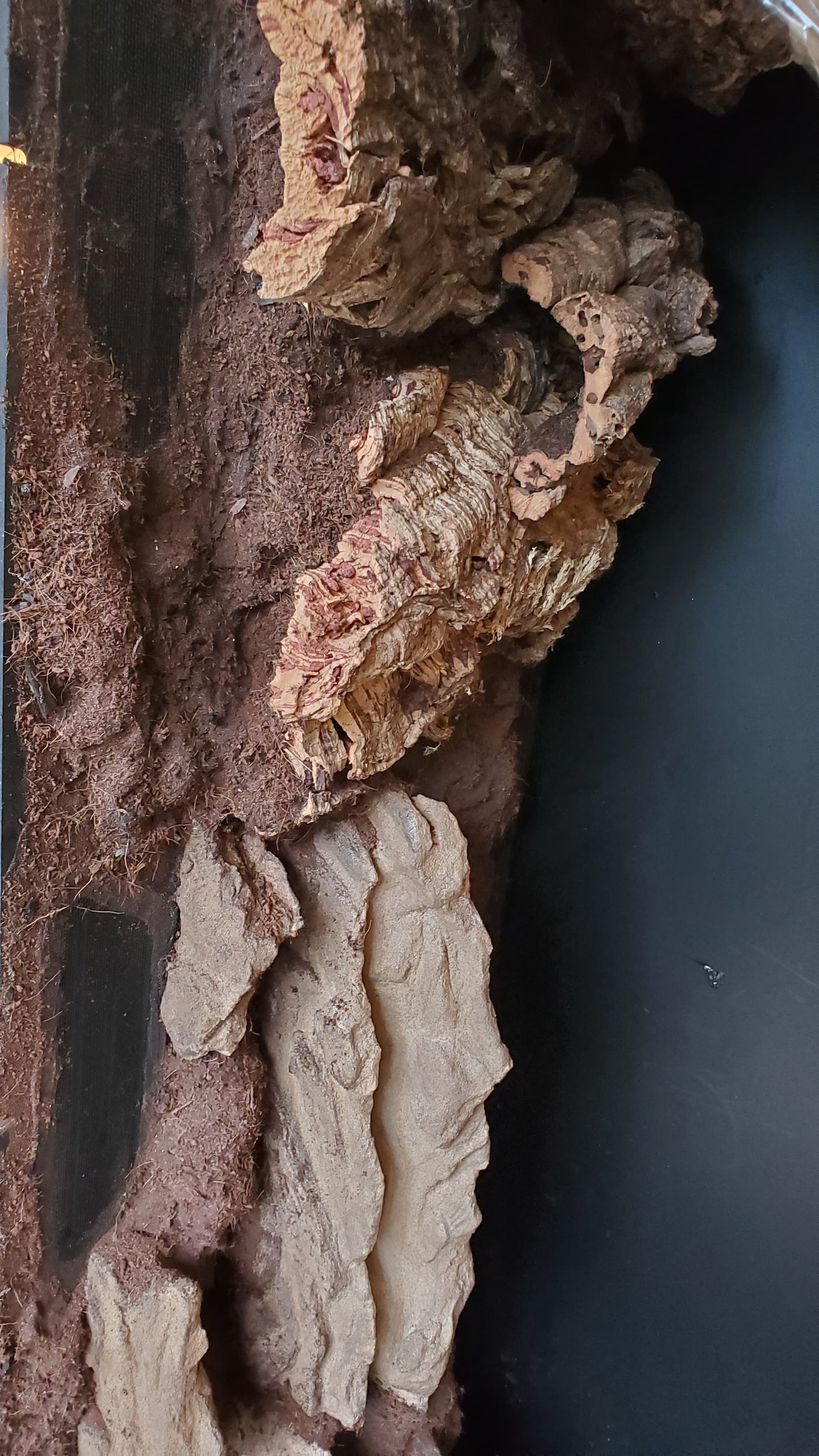 I’m pretty happy with it. There are a ton of nooks and crannies for her to enjoy and explore, a solid heat gradient, and later, after things settle a bit, I tucked a couple of little coconut hides in unobtrusive spots.
