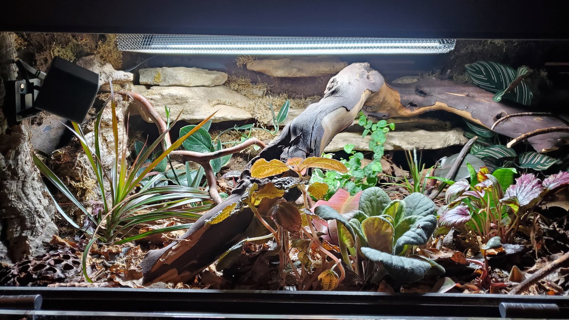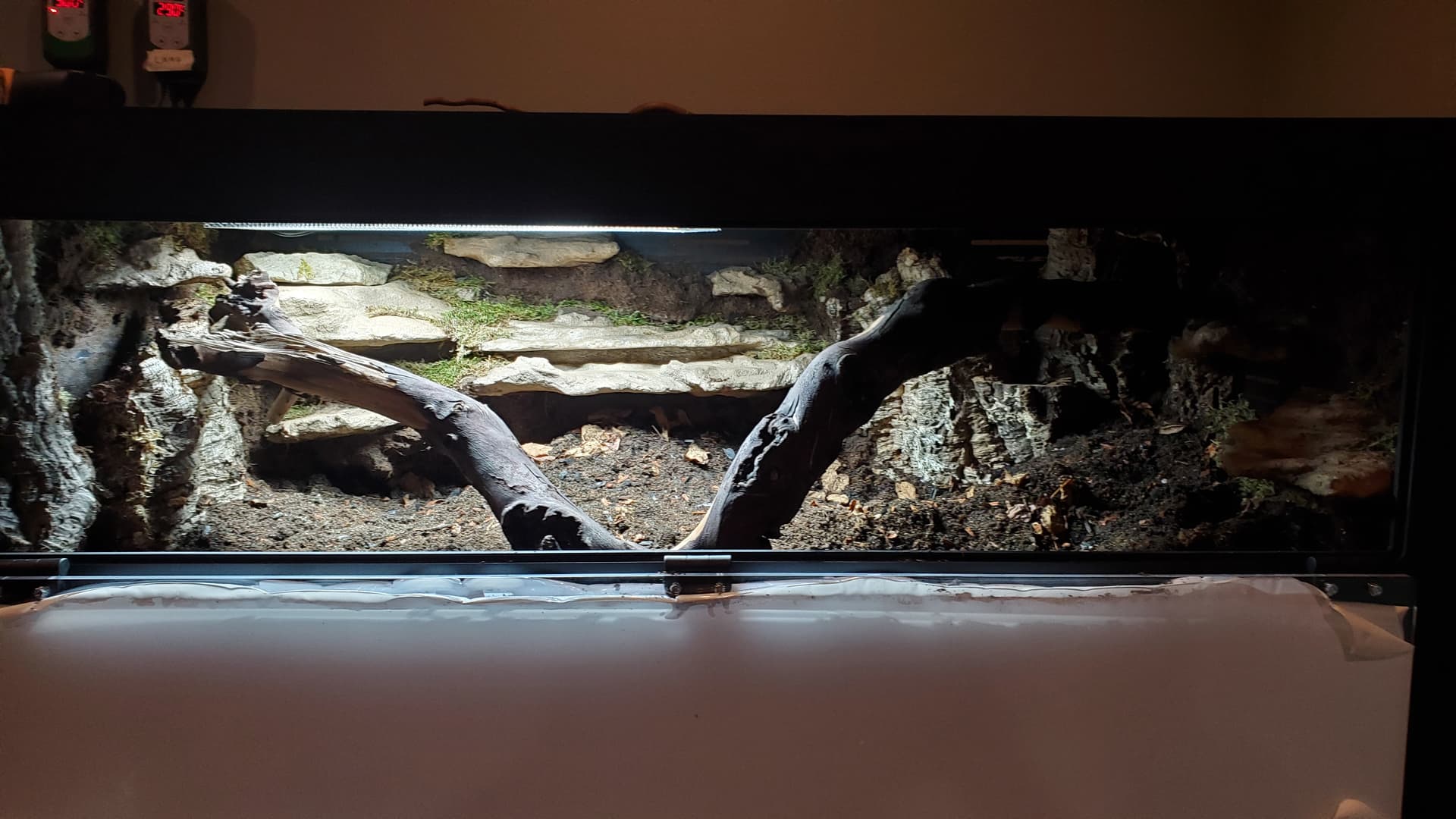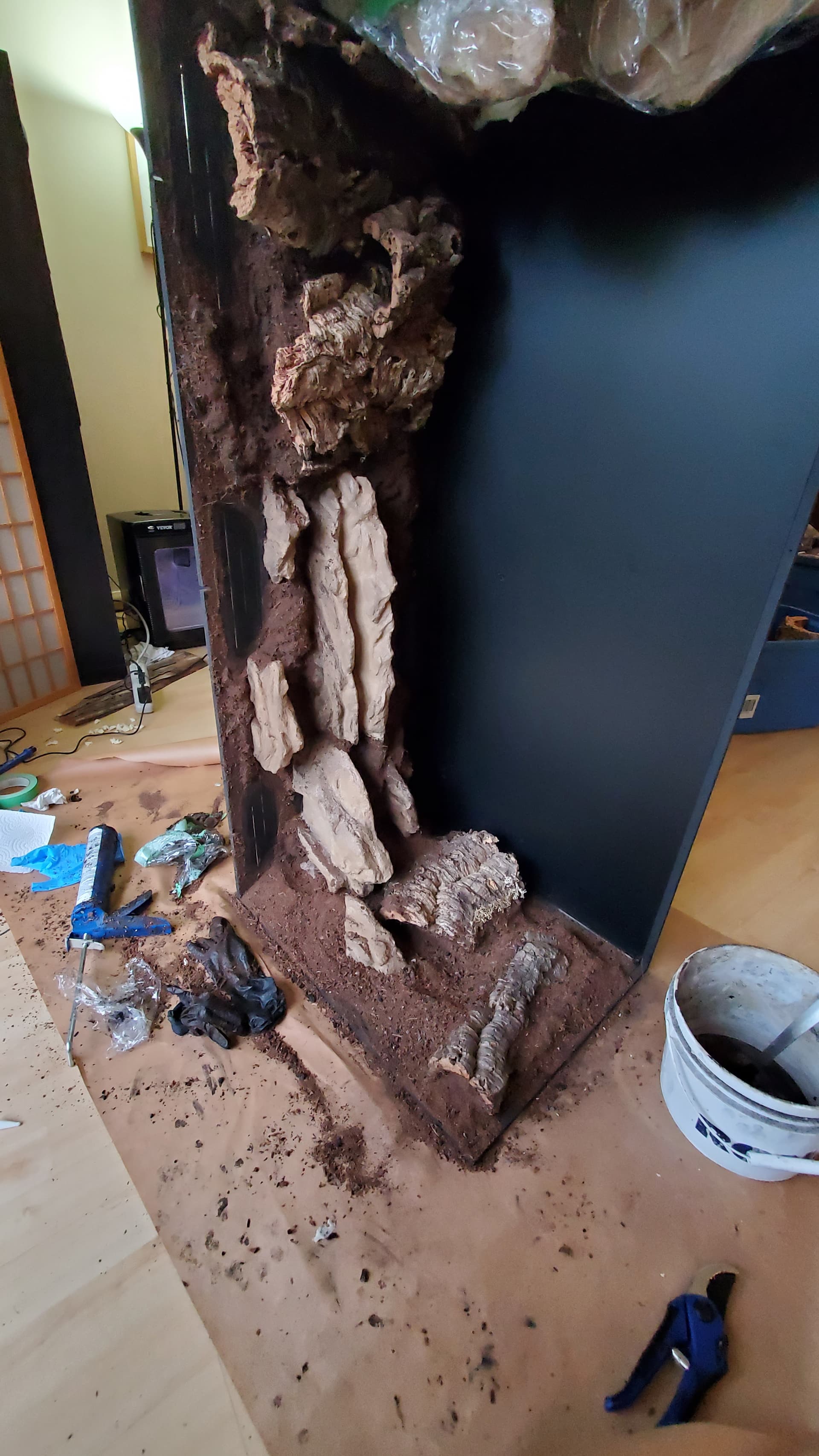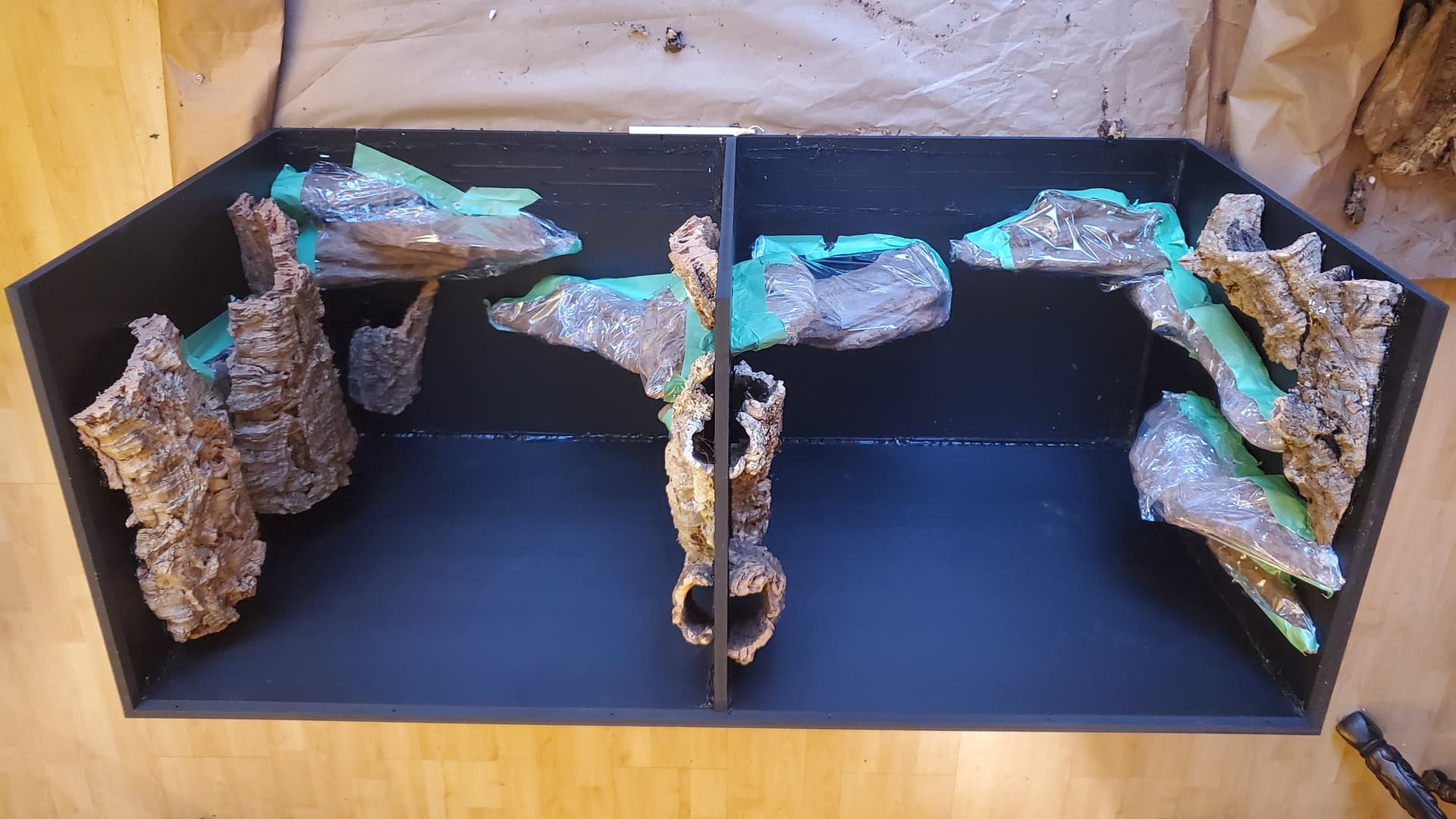 I’m pretty happy with it. There are a ton of nooks and crannies for her to enjoy and explore, a solid heat gradient, and later, after things settle a bit, I tucked a couple of little coconut hides in unobtrusive spots.