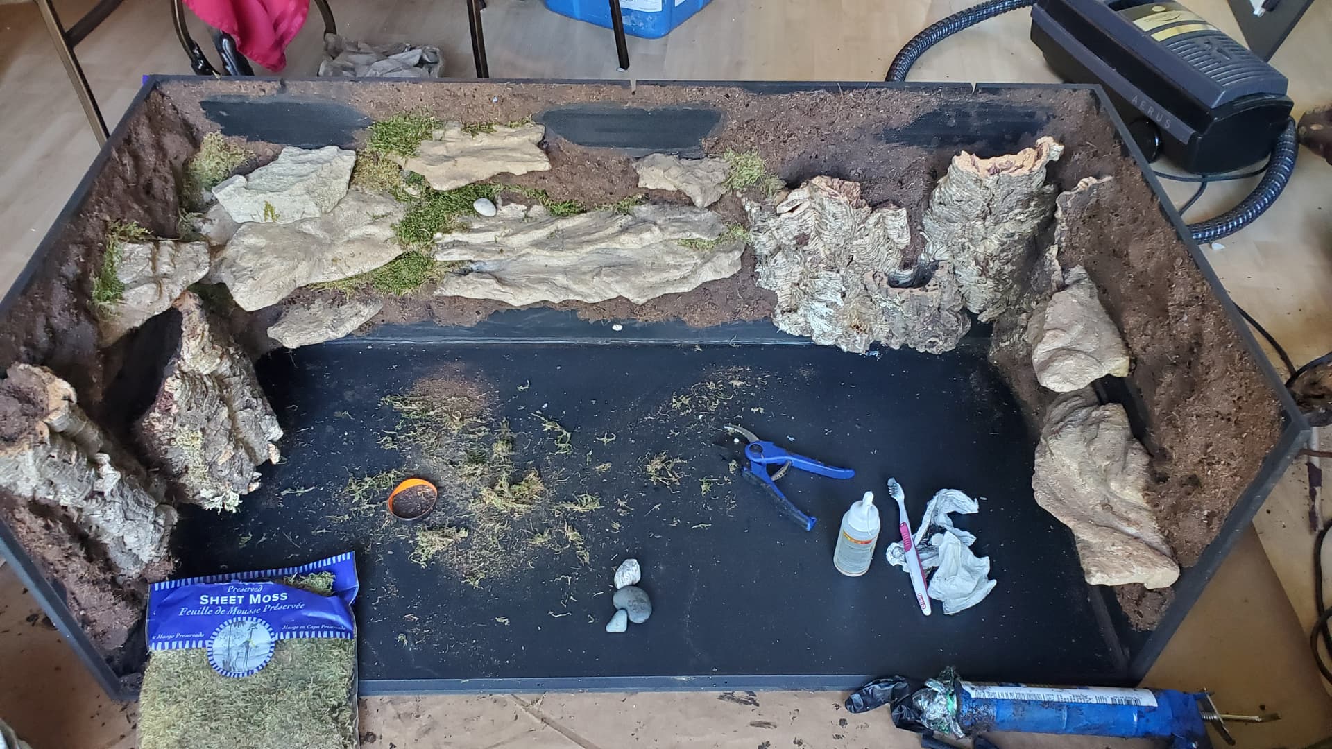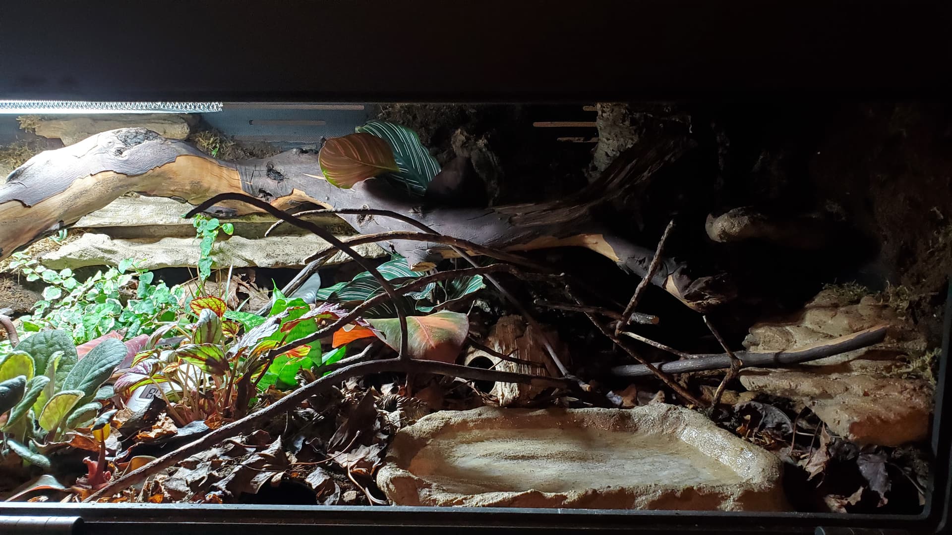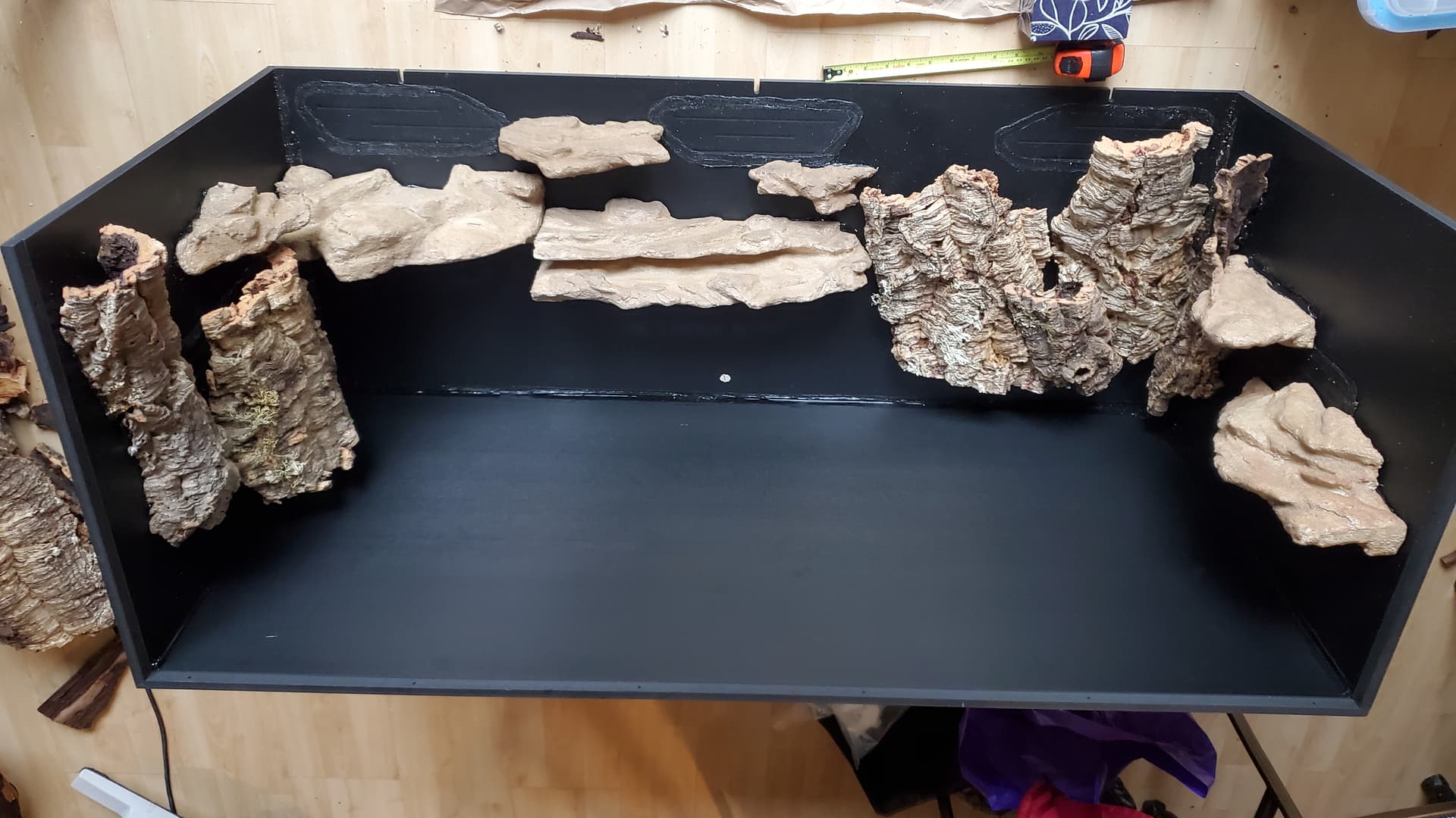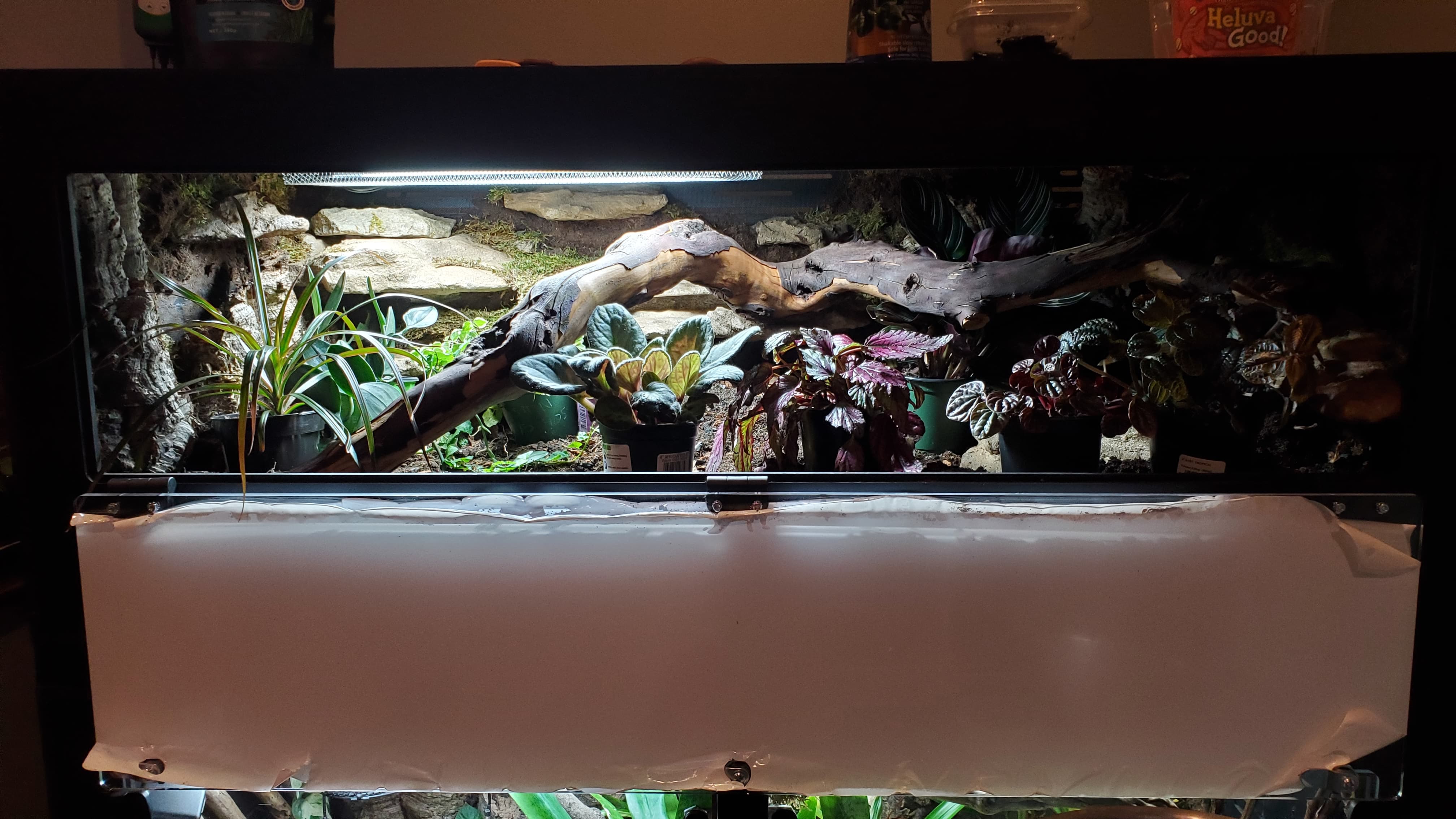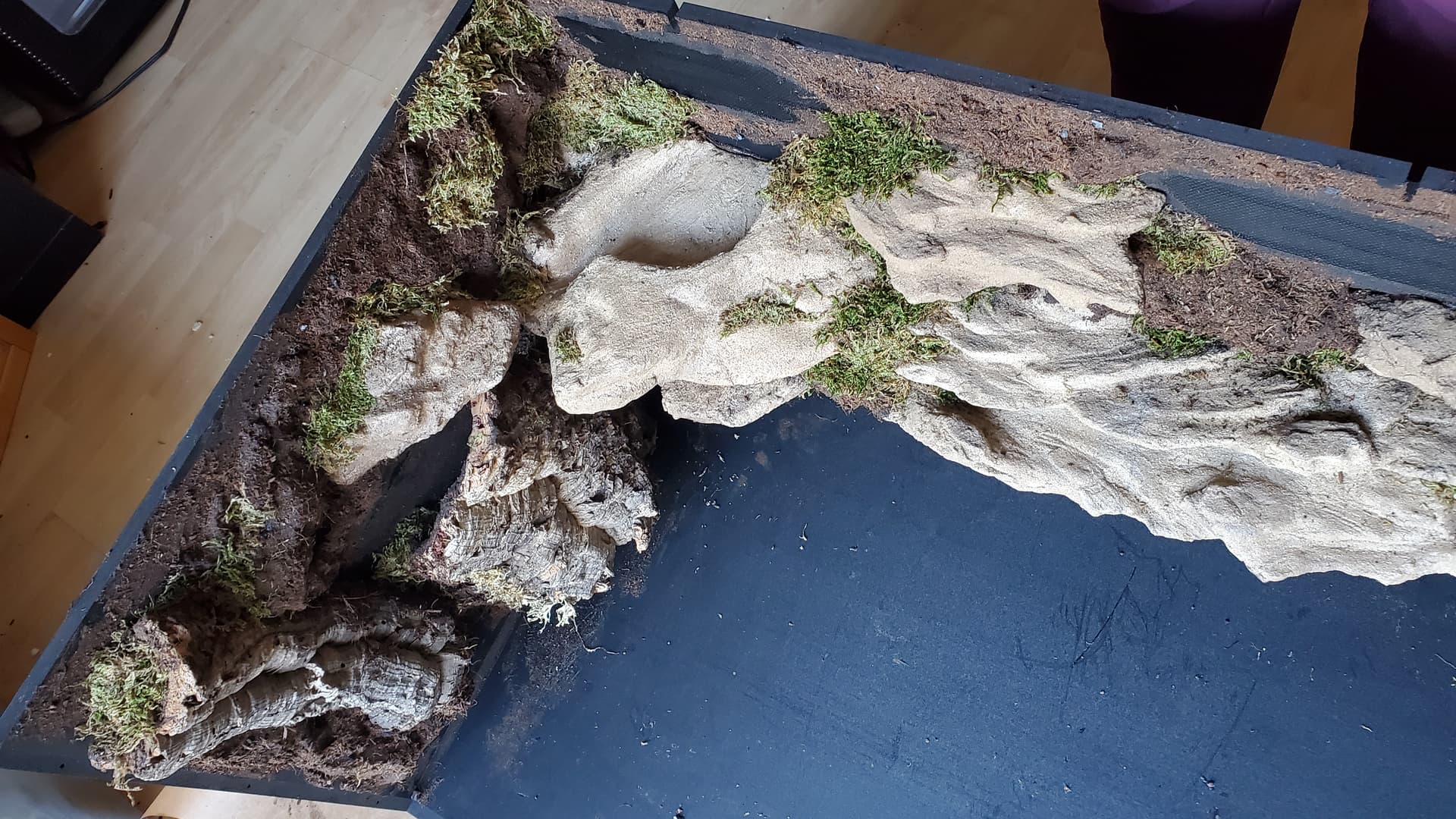 I’m pretty happy with it. There are a ton of nooks and crannies for her to enjoy and explore, a solid heat gradient, and later, after things settle a bit, I tucked a couple of little coconut hides in unobtrusive spots.