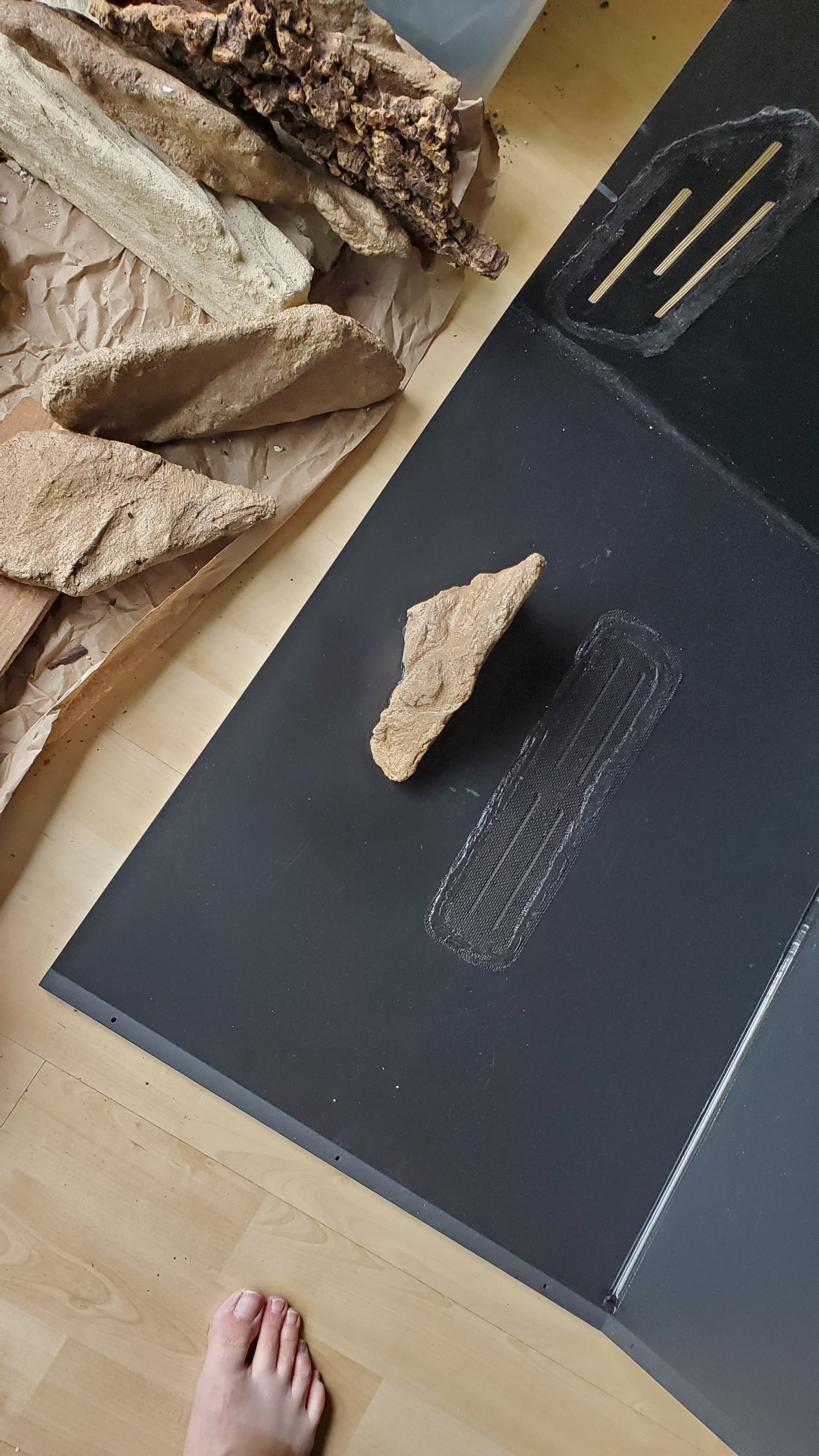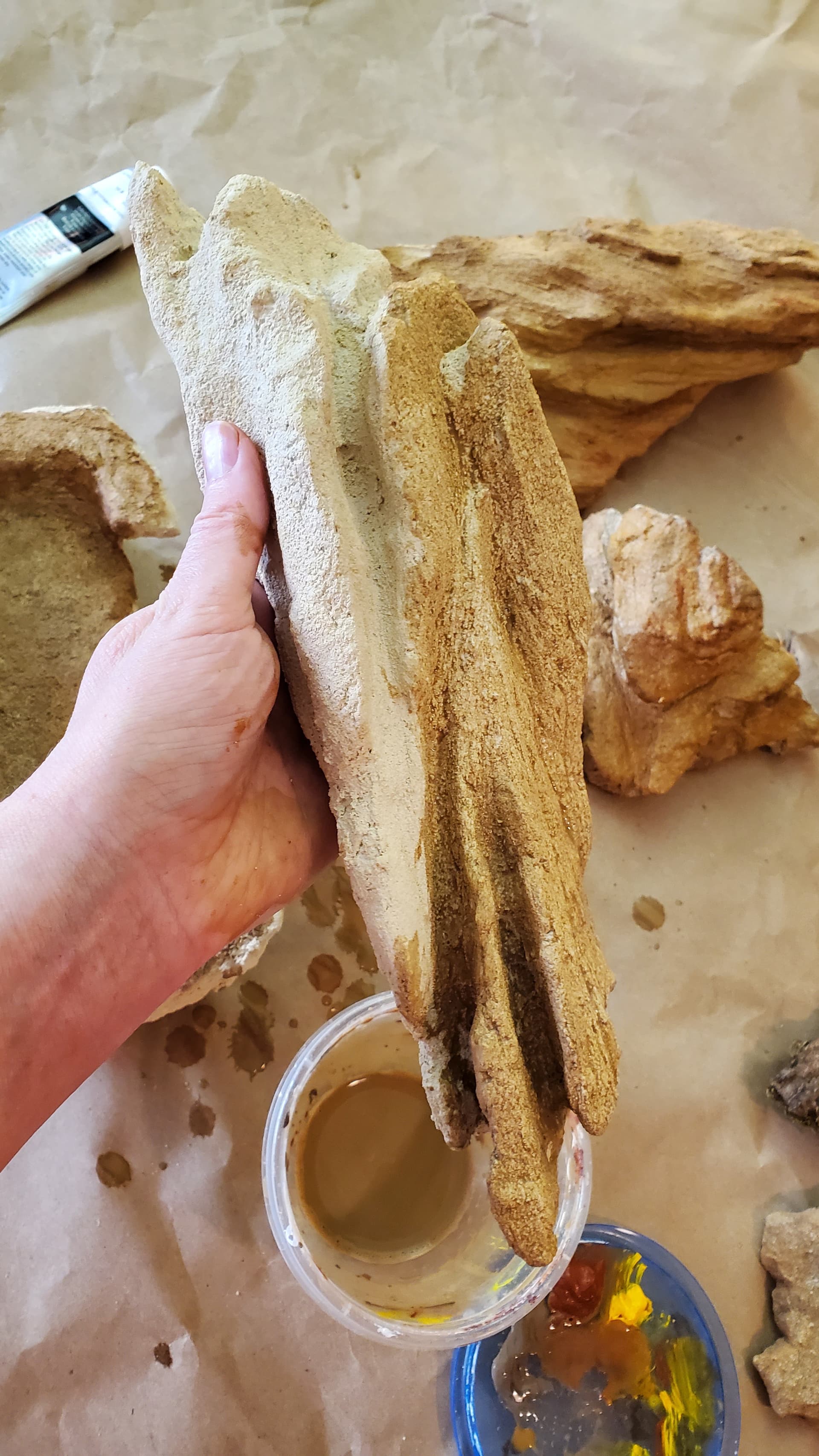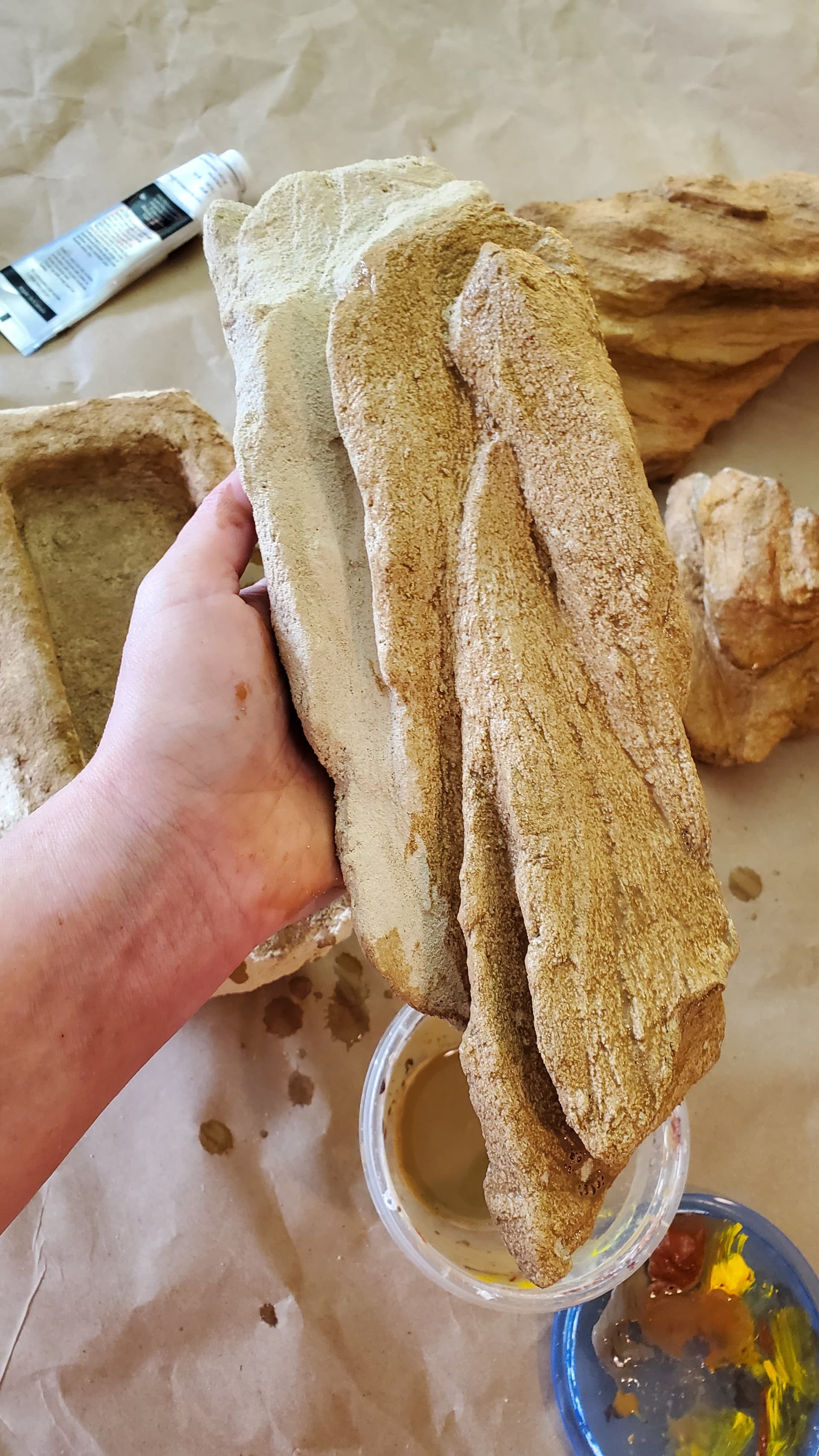 We did some of these in Hestia’s enclosure and I was mostly pleased with them, except that the polycrylic gave them this wet sheen that didn’t feel rock-like, so I decided to refine the process experimentally with this round. You can see in one of these pics that there’s a little dish with a black sock in it – that black sock is filled with superfine (actually meant for gerbil cages I think?) sand in approximately the right colour, and as we painted on the last layer of polycrylic (each rock needed three coats) we shook on a layer of this fine sand.