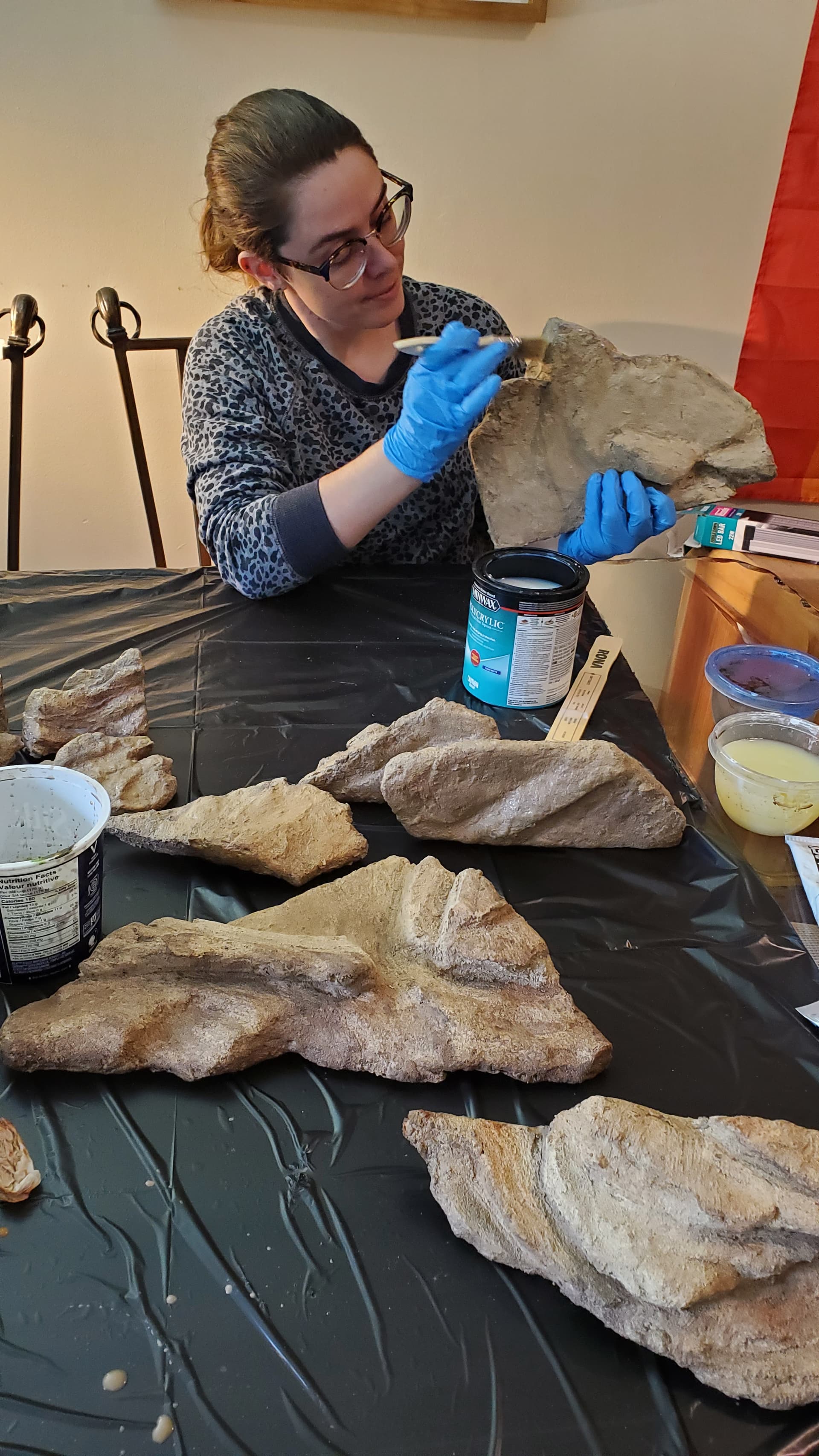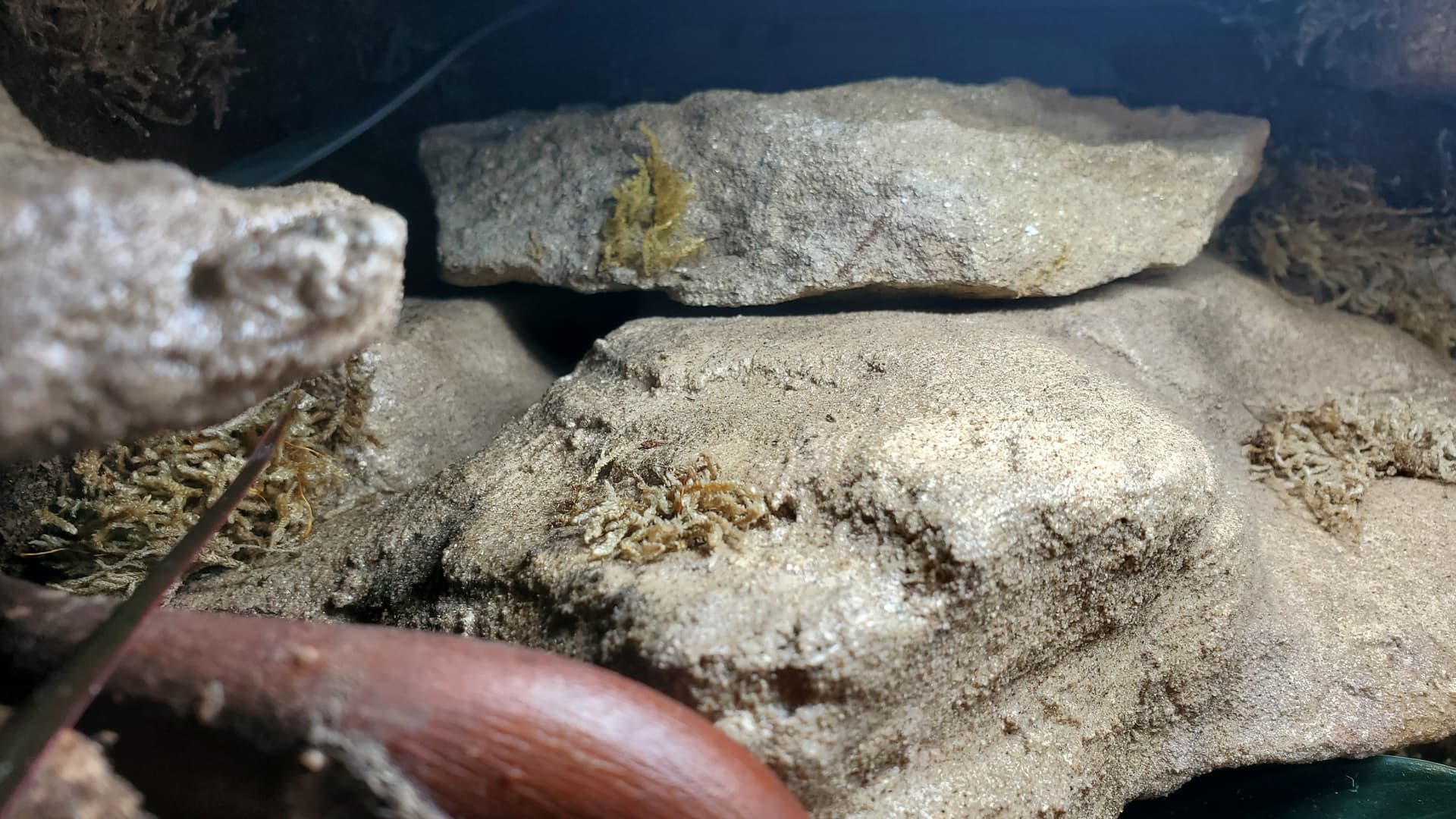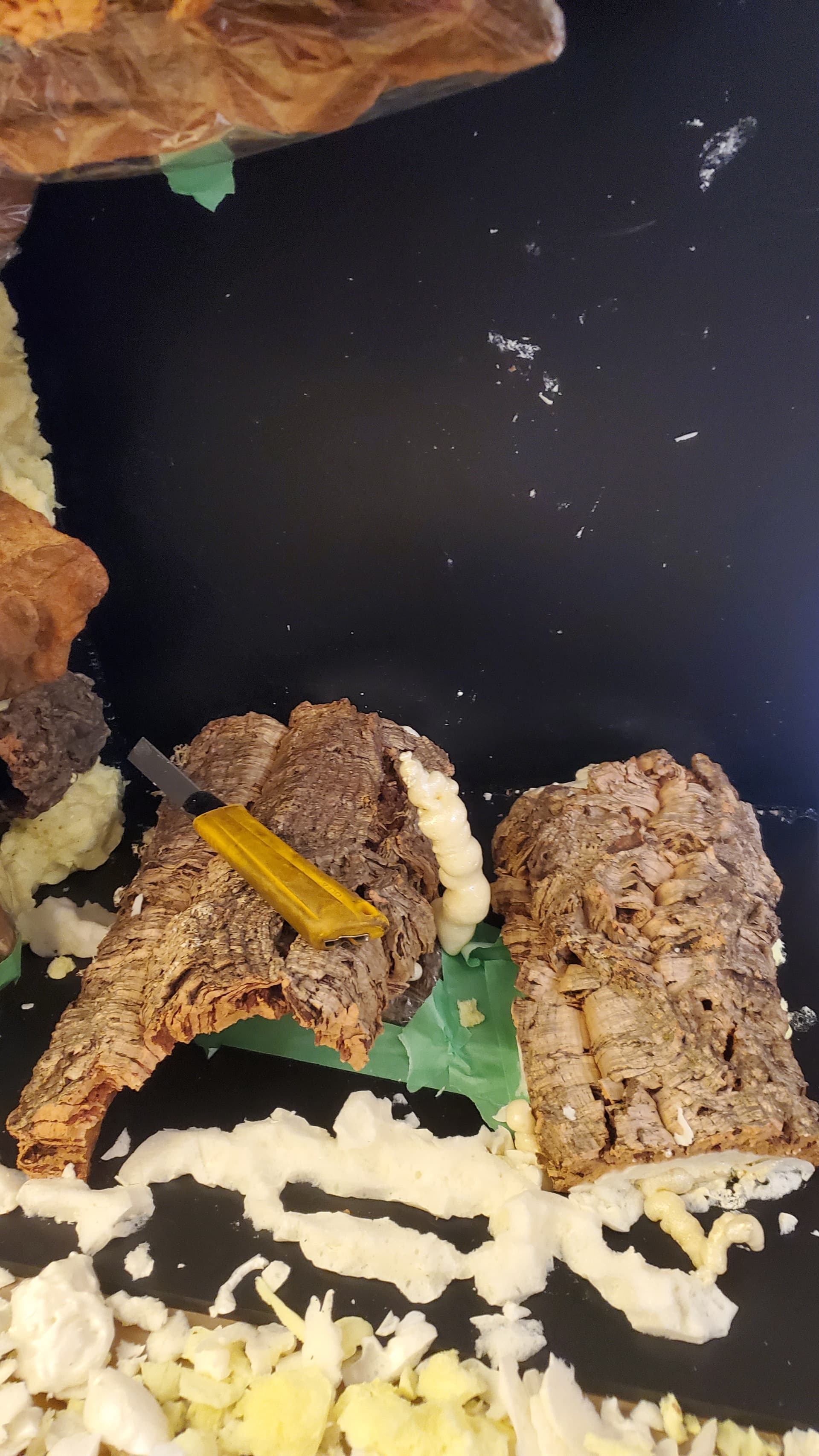 We did some of these in Hestia’s enclosure and I was mostly pleased with them, except that the polycrylic gave them this wet sheen that didn’t feel rock-like, so I decided to refine the process experimentally with this round. You can see in one of these pics that there’s a little dish with a black sock in it – that black sock is filled with superfine (actually meant for gerbil cages I think?) sand in approximately the right colour, and as we painted on the last layer of polycrylic (each rock needed three coats) we shook on a layer of this fine sand.