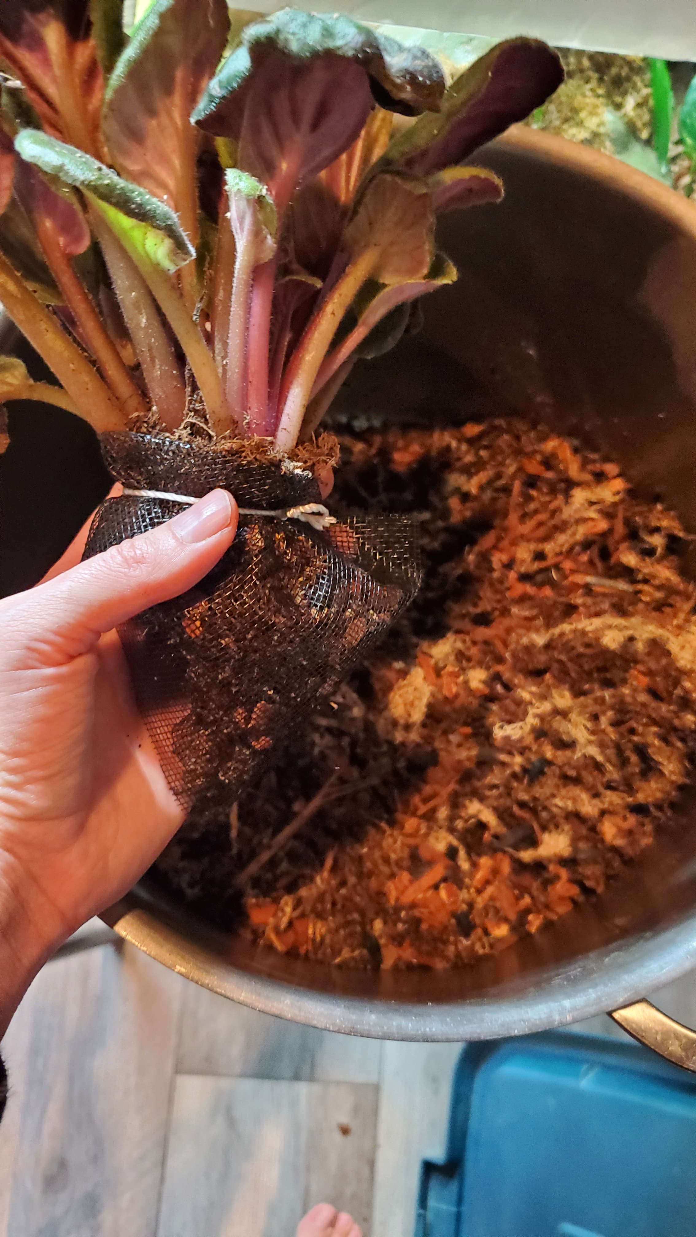 Cribbed another idea from SerpaDesign for the plants that like their soil chunkier and better-draining than the basic substrate I’d mixed up, and tied chunky bags around some of their root balls.