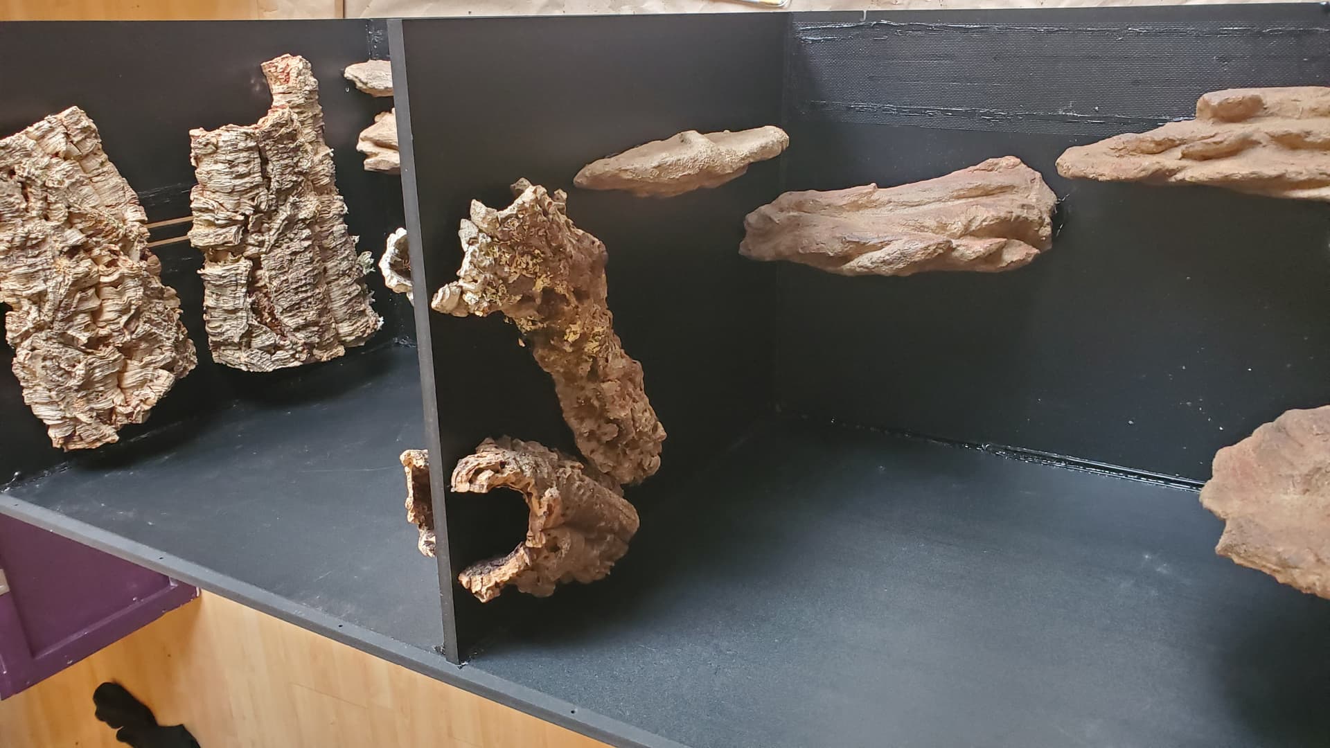 This is based on a technique I found on a cool old scaping blog – making rocks out of styrofoam and grout. The idea is to carve the rocks slightly smaller and with more exaggerated features than you intend to end up with, and then cover them in two or three layers of sanded grout, of your colour of choice. Paint them, seal them with polycrylic, and they’re light, waterproof, reptile-safe and rock-like.