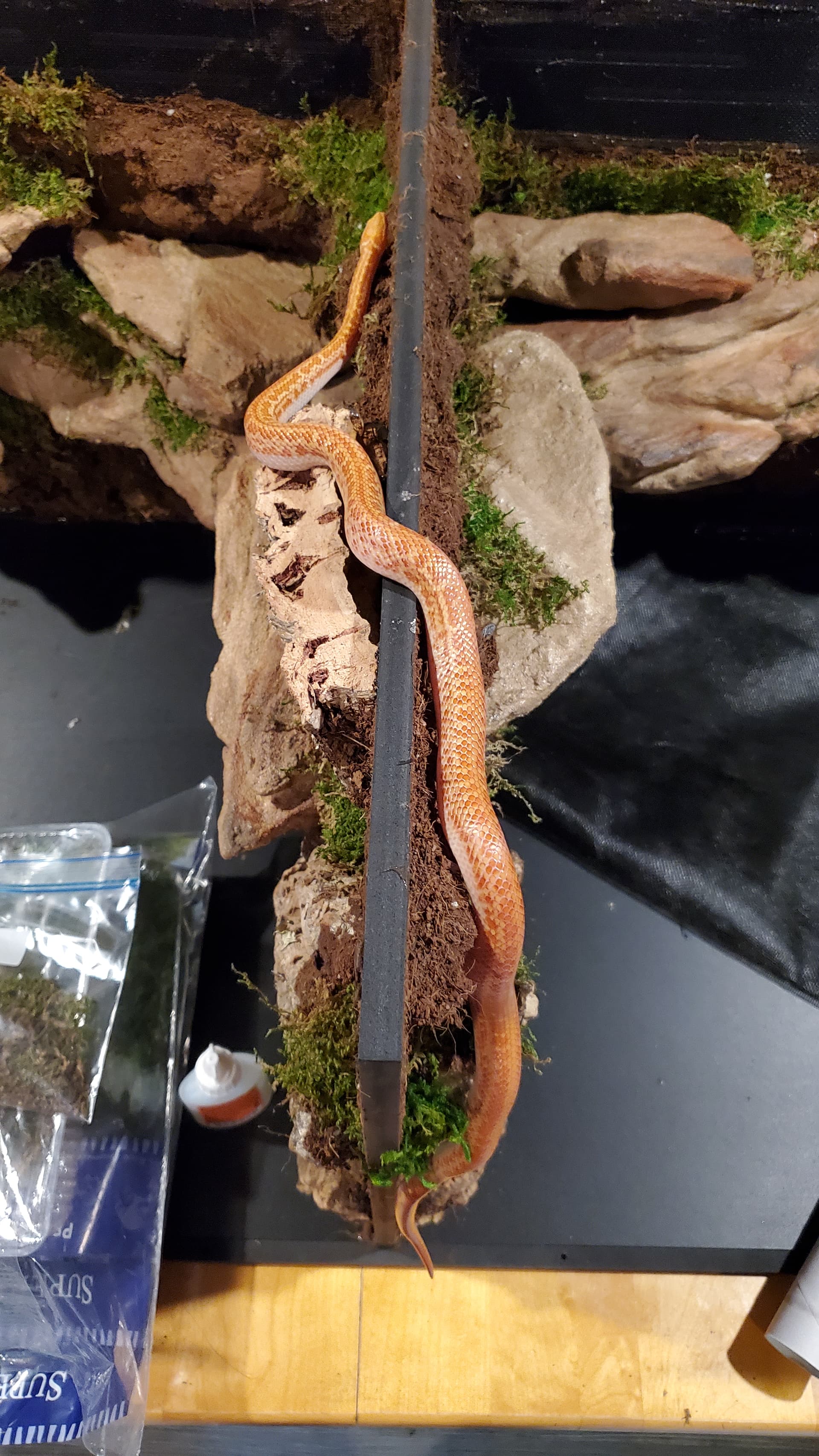 Three or four years old, a total smokeshow, endlessly nosy, a little bit jumpy, and very ready for an adult-sized enclosure where she can climb to her heart’s content. She’s been on paper her whole life – I had purchased her from a breeder who’d decided not to breed her after all, and up until now she’s been in her quarantine enclosure, waiting patiently.