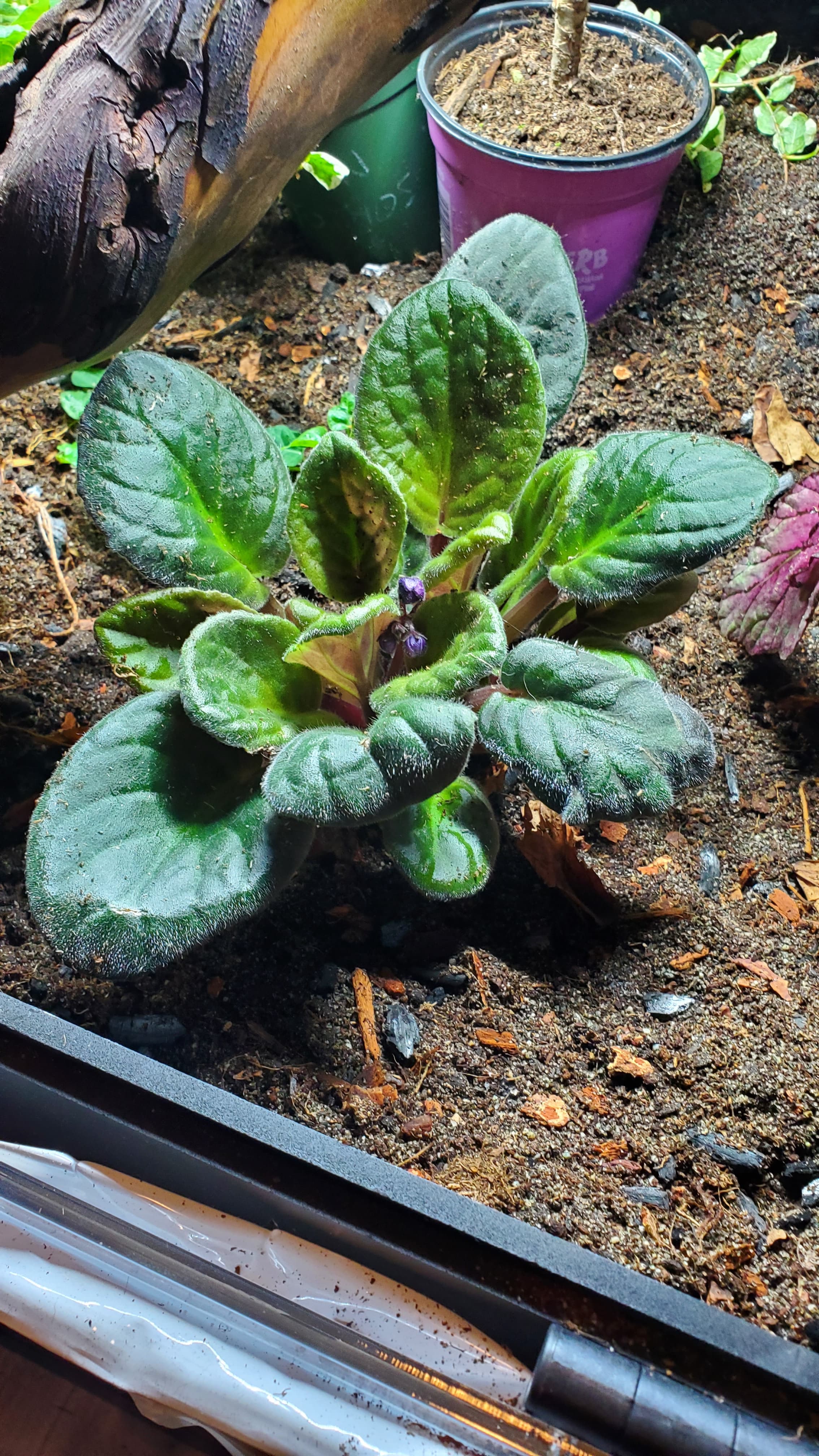 I had been collecting, washing, and quarantining plants for months now, a la Serpadesign’s plant processing instructions – wash, bleach wash, quarantine. So I had a bunch of very happy plants ready to go. I was aiming for a darker theme to the foliage in this terrarium, since Andy’s a beautiful dove grey and I wanted her to stand out, so there’s a lot of purples, grey-greens, and dark greens featuring here. Learning from Hestia’s terrarium, I did my best to sort out what plant would be happiest in what conditions, but I expect some attrition will be inevitable. I have backups of other, potentially more compatible species waiting.