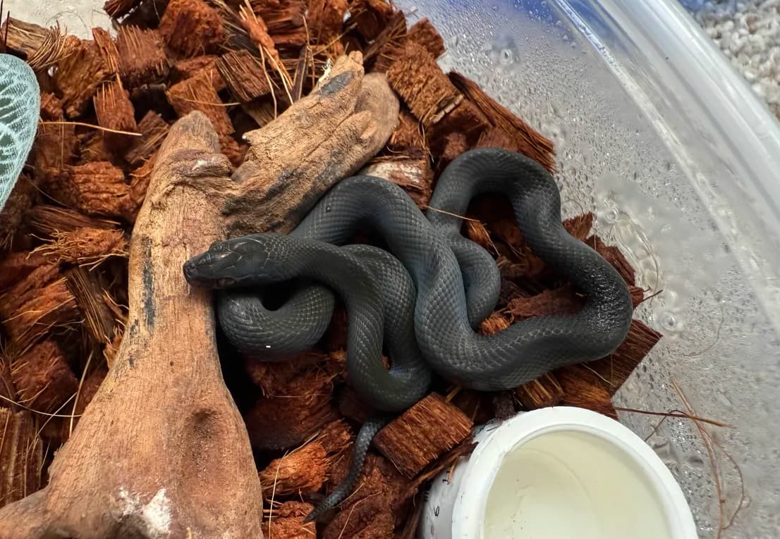 The reason I’m really excited about these as an alternative to the black fuliginosis is that they seem to, according to the Slovakian breeder, adapt much better to captivity. Black fuliginosis babies are known to be difficult to start (often start on live pinkies or even fish-scented live pinkies) as well as difficult to keep on frozen-thawed - as aduls they often prefer live mice and will switch back to preferring live even if they have taken frozen thawed in the past. These near-forest black house snakes, Boaedon perisilvestris, are more reliable eaters - these babies started on frozen thawed pinkies and the WC adults also reliably eat frozen thawed rodents. B. perisilvestris are also more robust than the black fuliginosis, reaching closer to Cape house snake size (4ft for females, 3ft for males). I’m really excited to work with these and hopefully get them established in the hobby as an alternative to the black fuliginosis, which are often still wild caught and are not particularly reliable feeders.