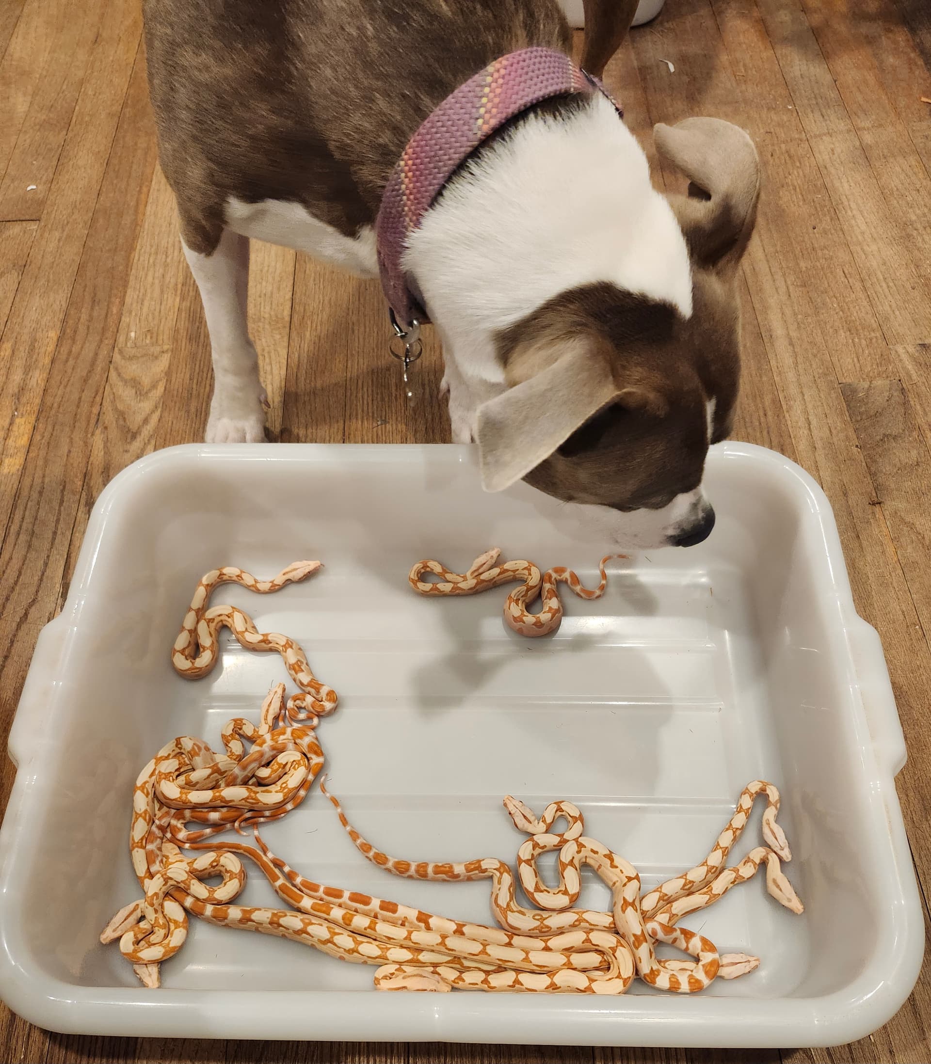 All my dogs love their rop chew toys but have never attempted to do this to my snakes. They are always curious and gentle with them. They have even licked my snakes.