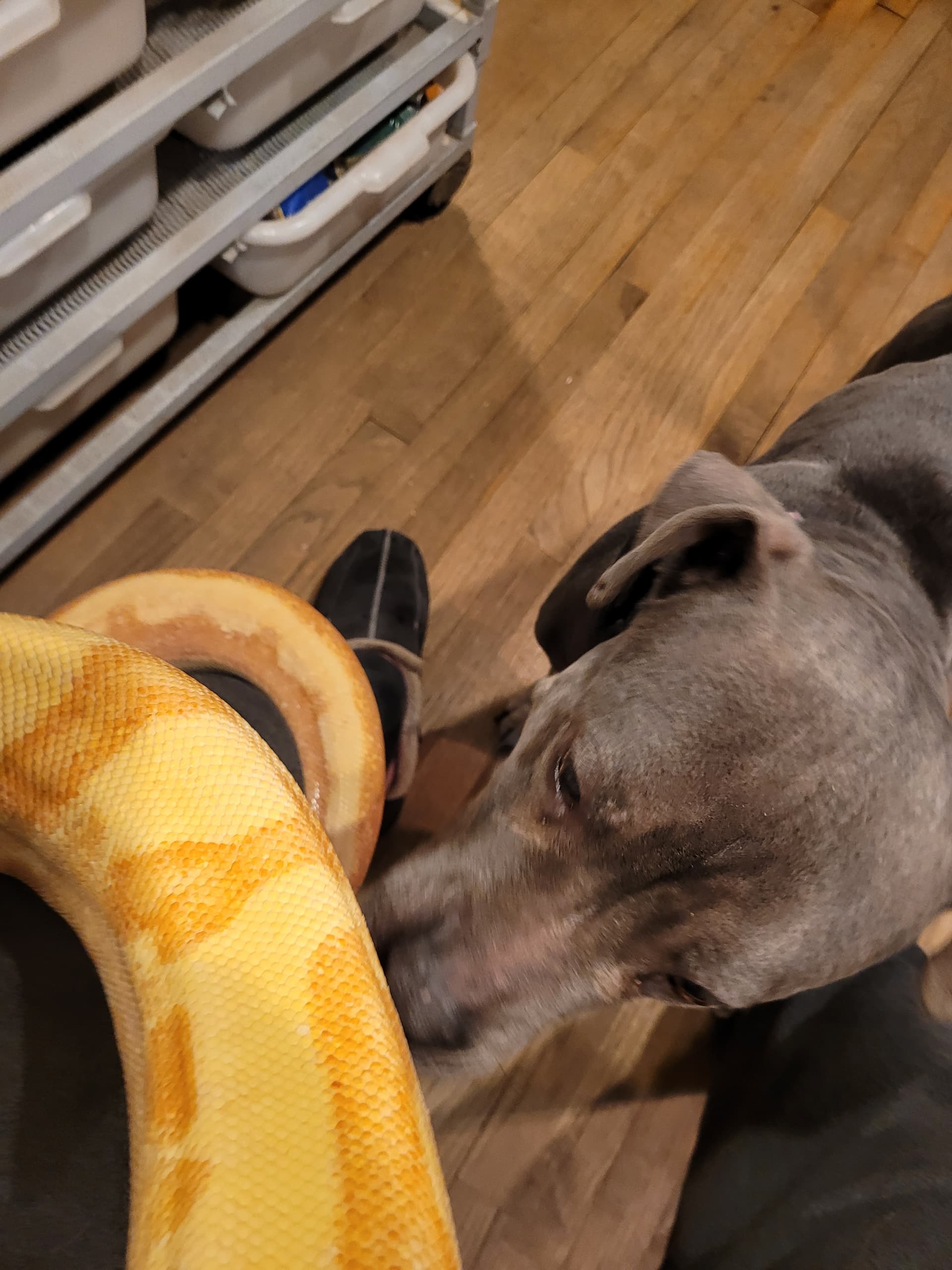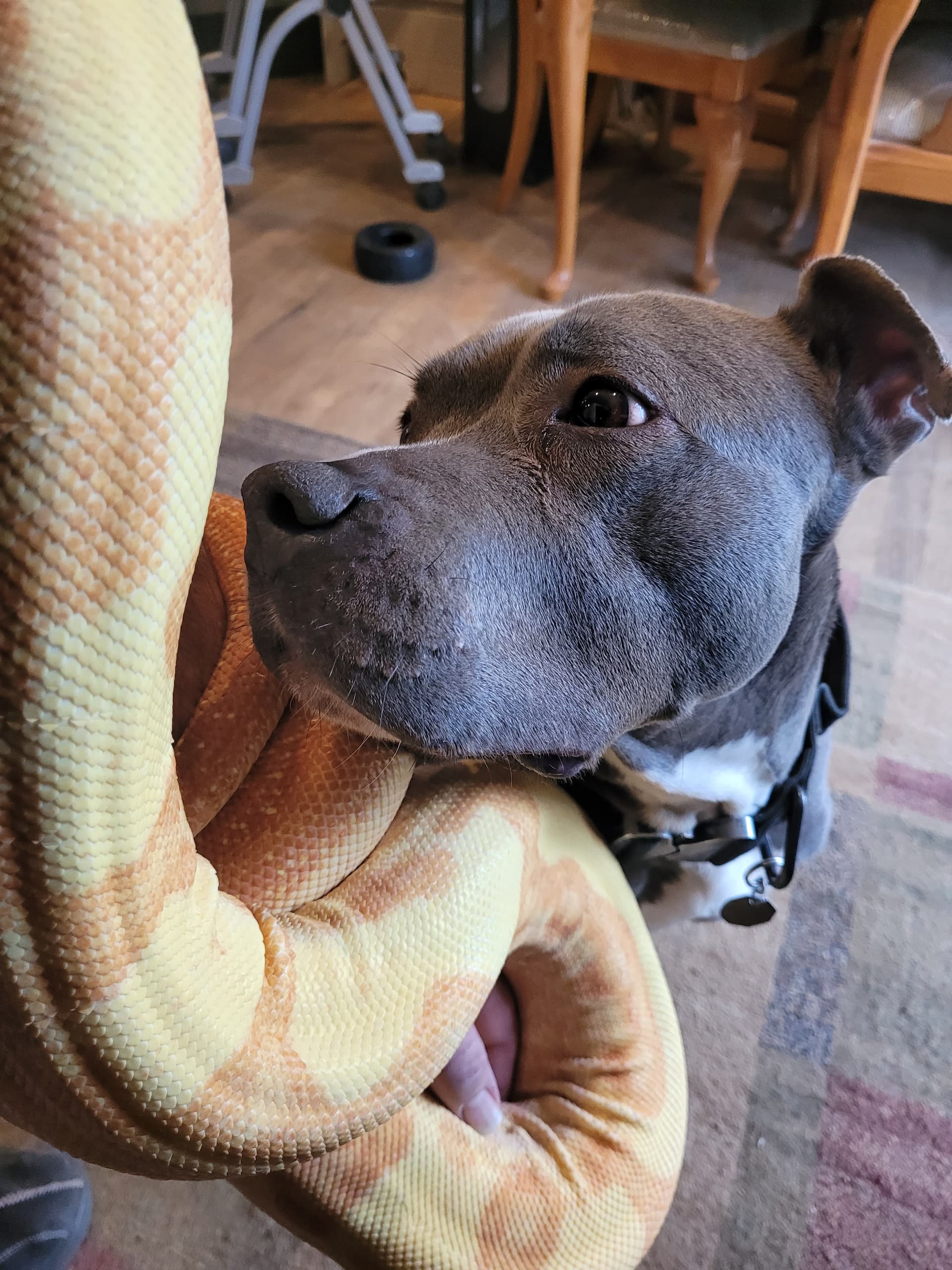 Now I do let all my dogs smell my snakes. I control the head of the snake when they do this. My pitbull smells my babies boas all the time.