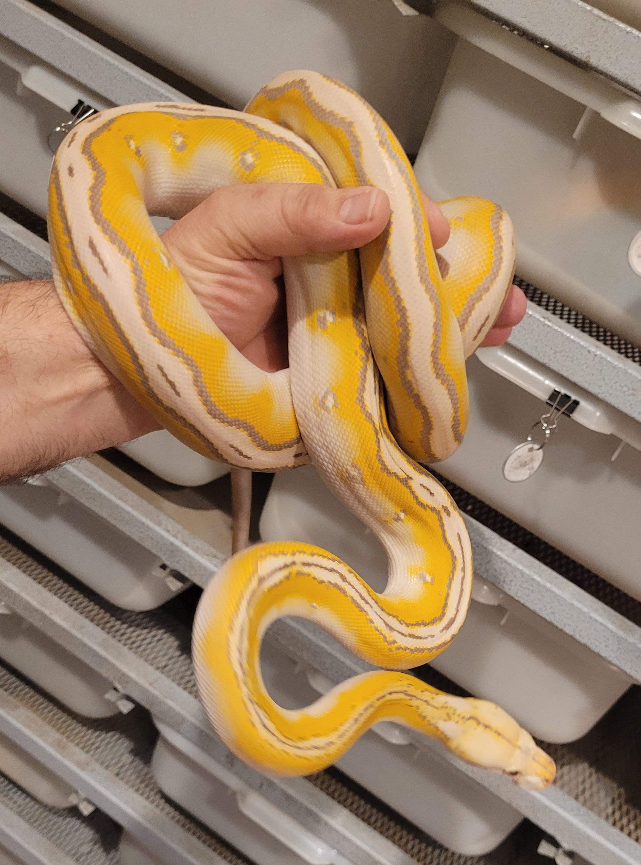 To be honest, I would probably trade the male for a motley, because I want a darker morph if that makes sense. Though the albino way would be a good one too. Would I want to stick with the Purple phase or? Cause in Boas, you don’t want to breed different albino strains together. I mean, you “CAN” but they don’t work with each other. But I was really curious due to reading this chat, so I had to ask about it. As for that snake, yeah…Apples, I shared the story myself. Whoever had her didn’t take care of her at all. Especially with how bad her mouth rot was, my guess was horrible husbandry, seeing as how they could dump her like that. As for GC x GC, I may need to find another bit of info because nothing I had read so far said it would end up with issues due to creating a super. So I am honestly glad I asked and would love some links or names of books/authors on retics so I can learn more!