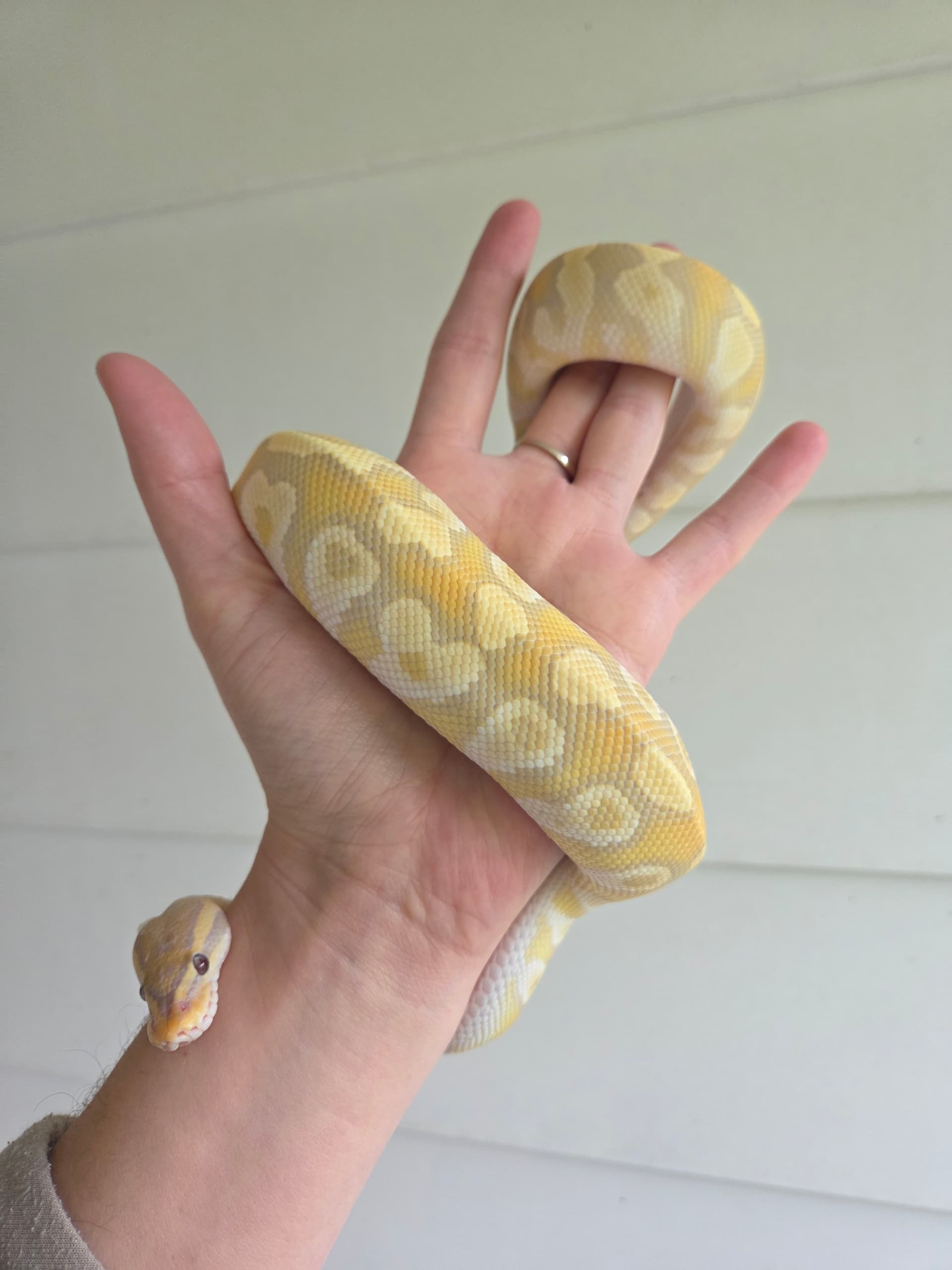 It does appear to be a caramel albino combo. I can’t put my finger on exactly what else is in there though. If you ever breed this animal, don’t try to make visual caramel albino. They’re very prone to severe kinking.