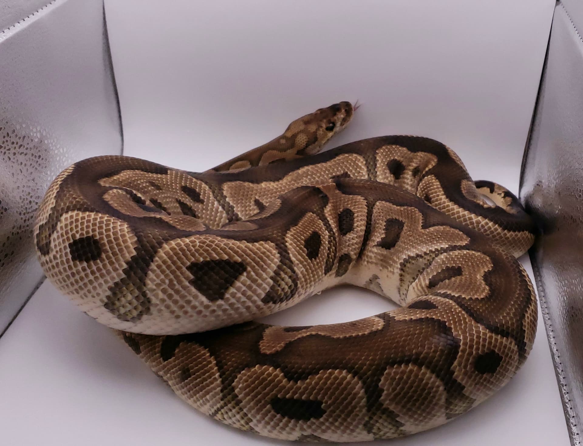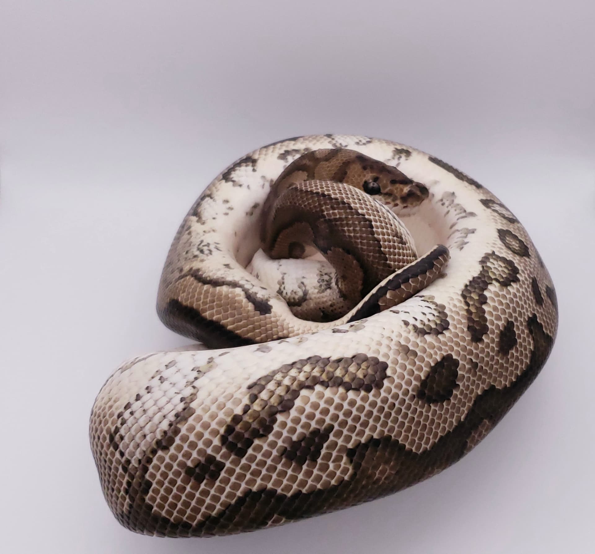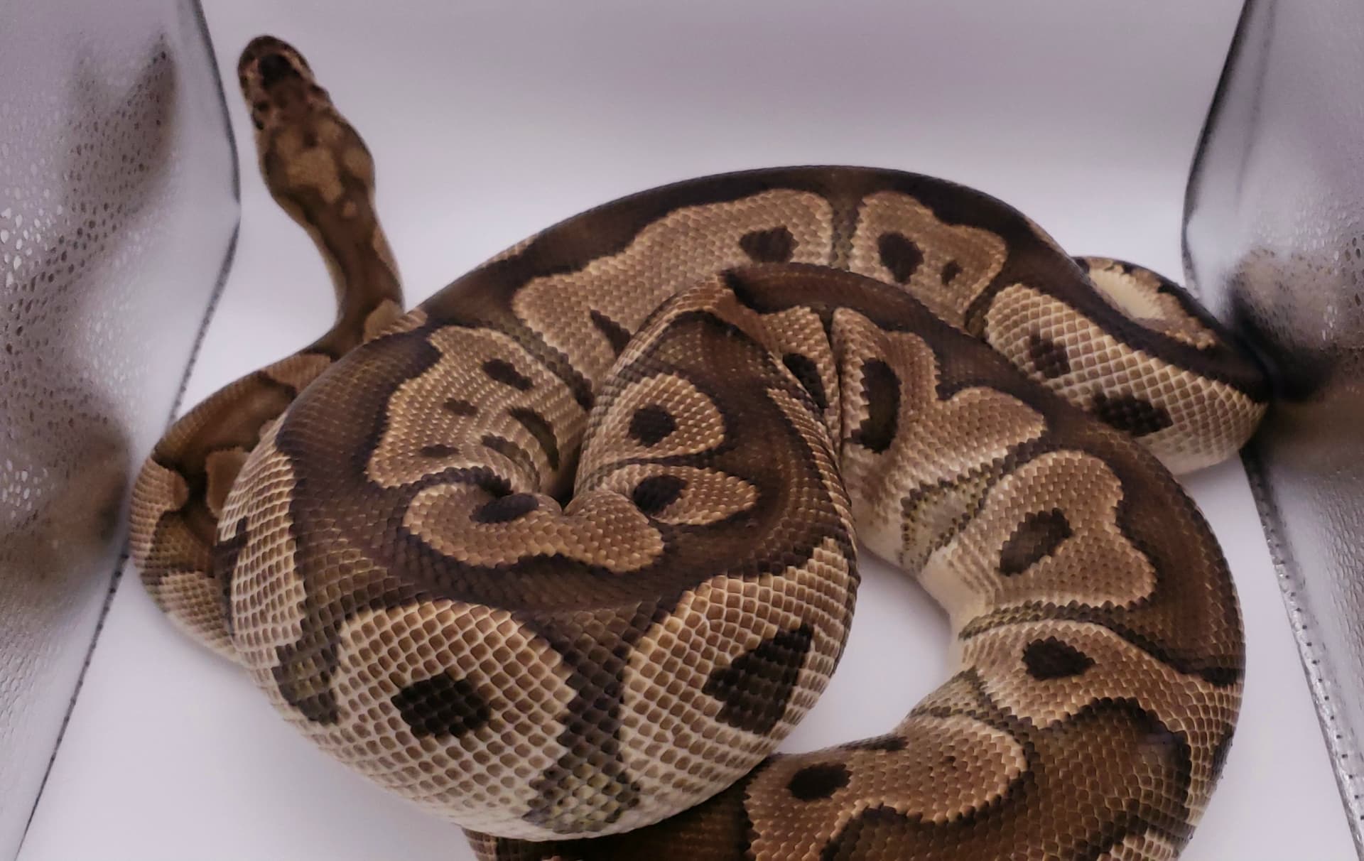 The male that came with Mango. Gorgeous Clown male, has a chaining pattern in his “alien heads” and stark grey-ish brown tones with a bright white belly, almost looks like an Axanthic in coloration but I know he isn’t from his parent info. Really hopeful to see if I can figure out if theres something going on with him other than Clown, would shed test him for Carbon but RGI doesn’t have a test for that morph
