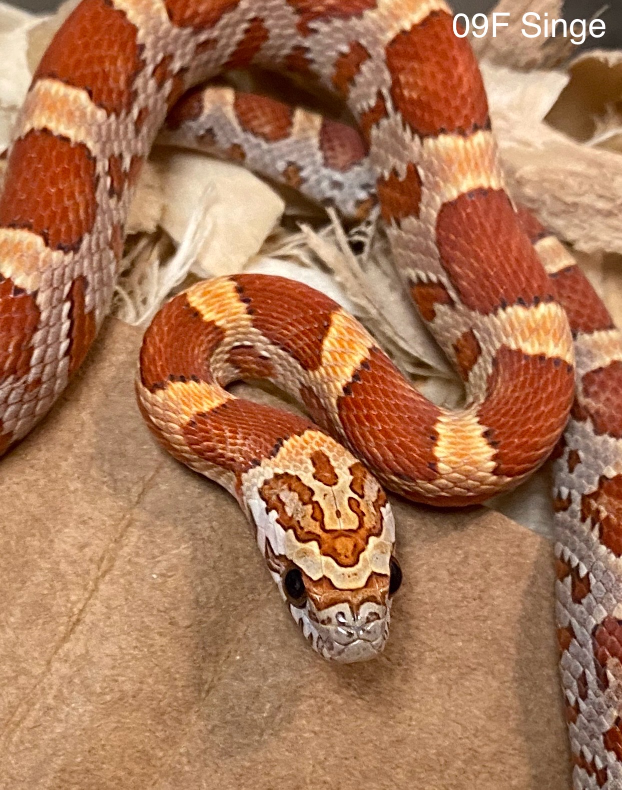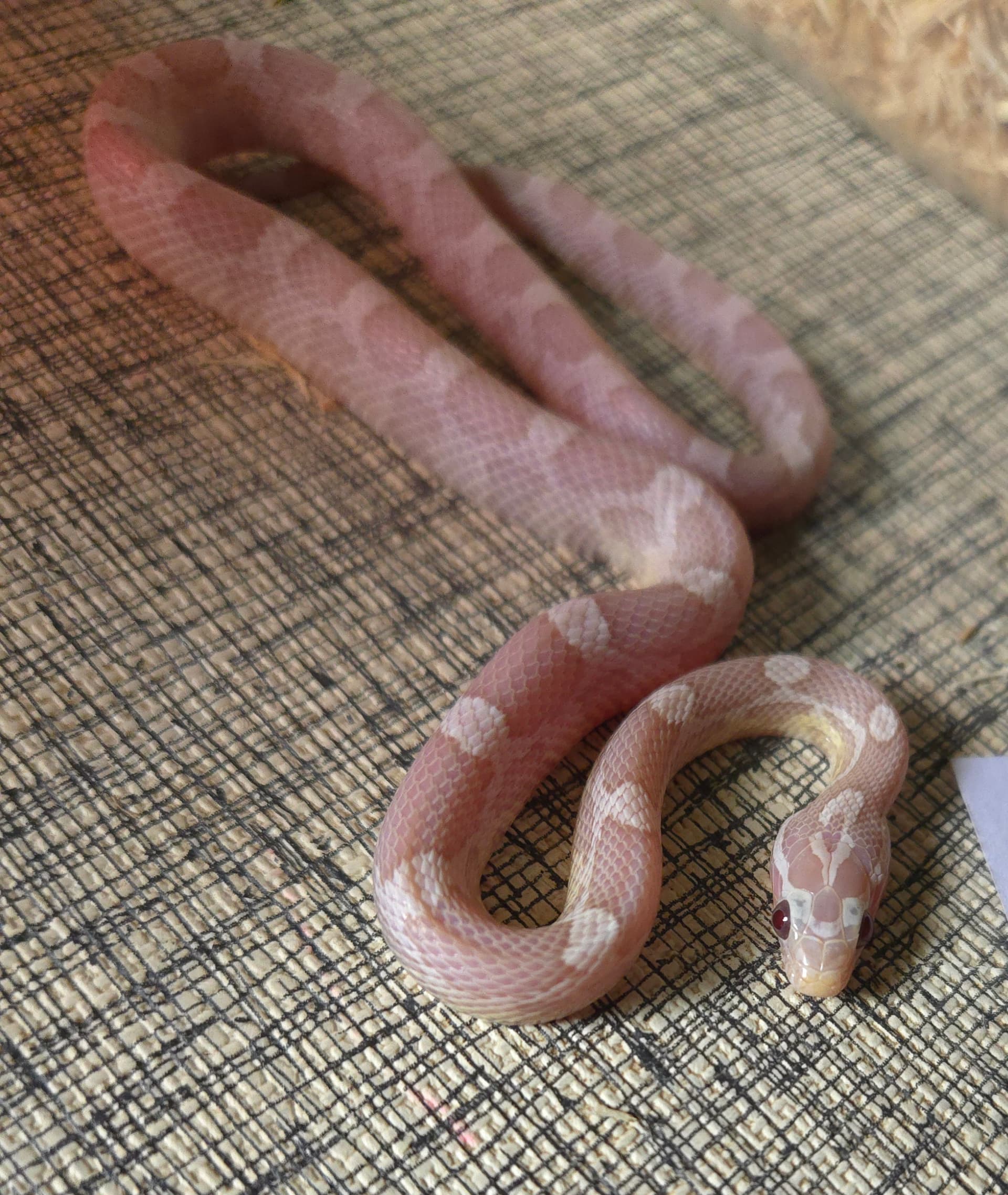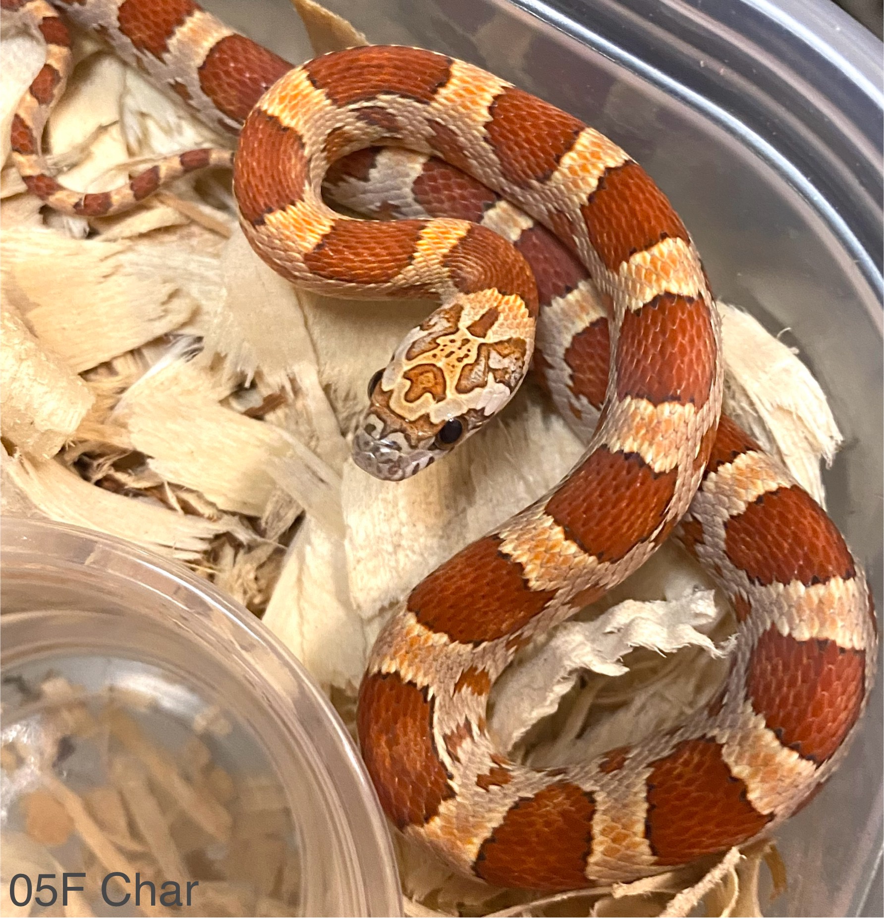 Had to laugh at this, too. I’ve got a single, seriously spicy girl this season. She is dead serious about her rattlesnake poses but I haven’t managed to get a good picture of her in uber-triangle because when she’s doing that, I’m making sure she’s not doing worse. Here she is drawing back, giving me the stink eye. She’s on the table because she shot out of her bin after coiling and hissing. Somebody should tell her how corn snakes are supposed to act. Lol