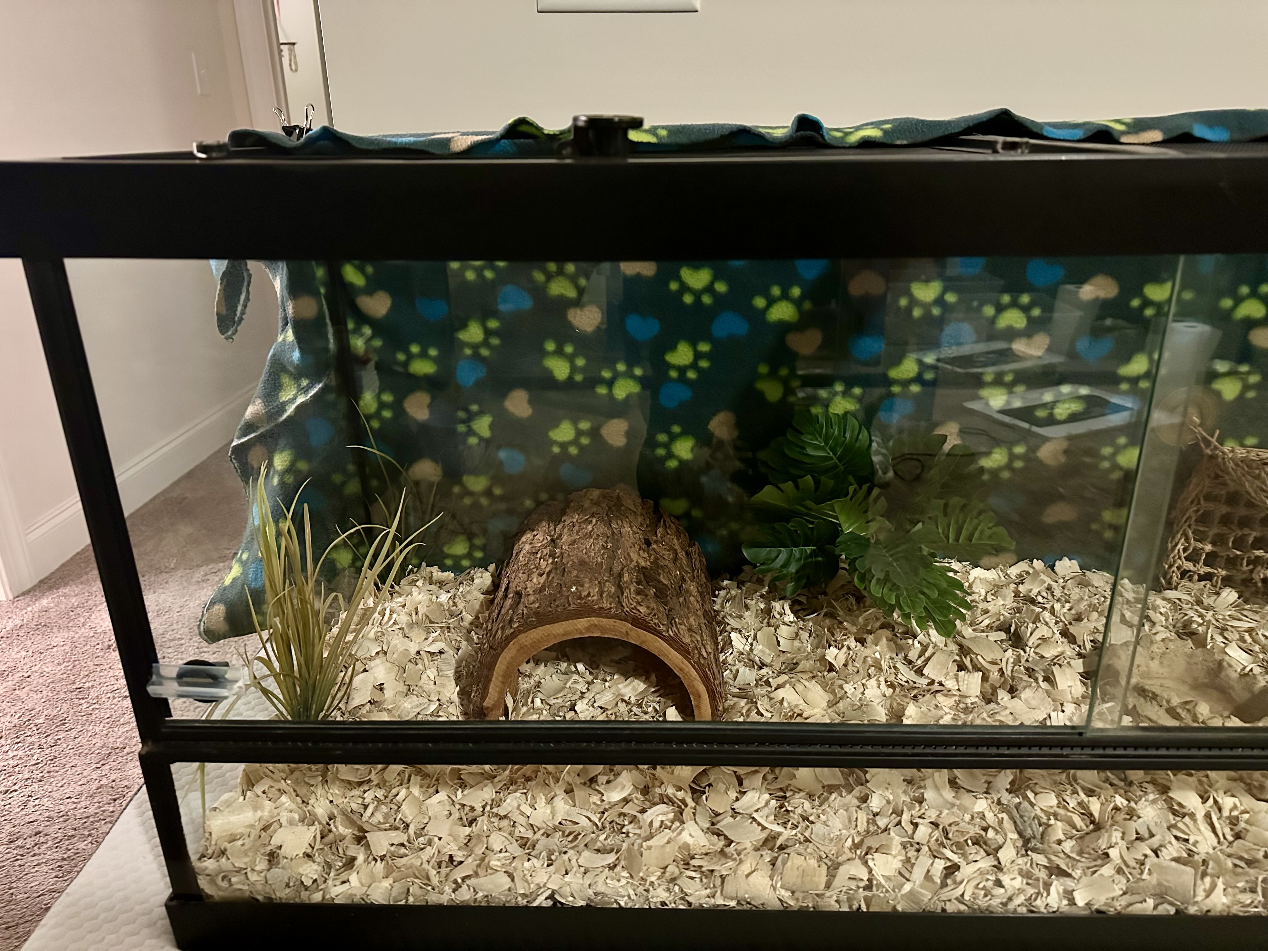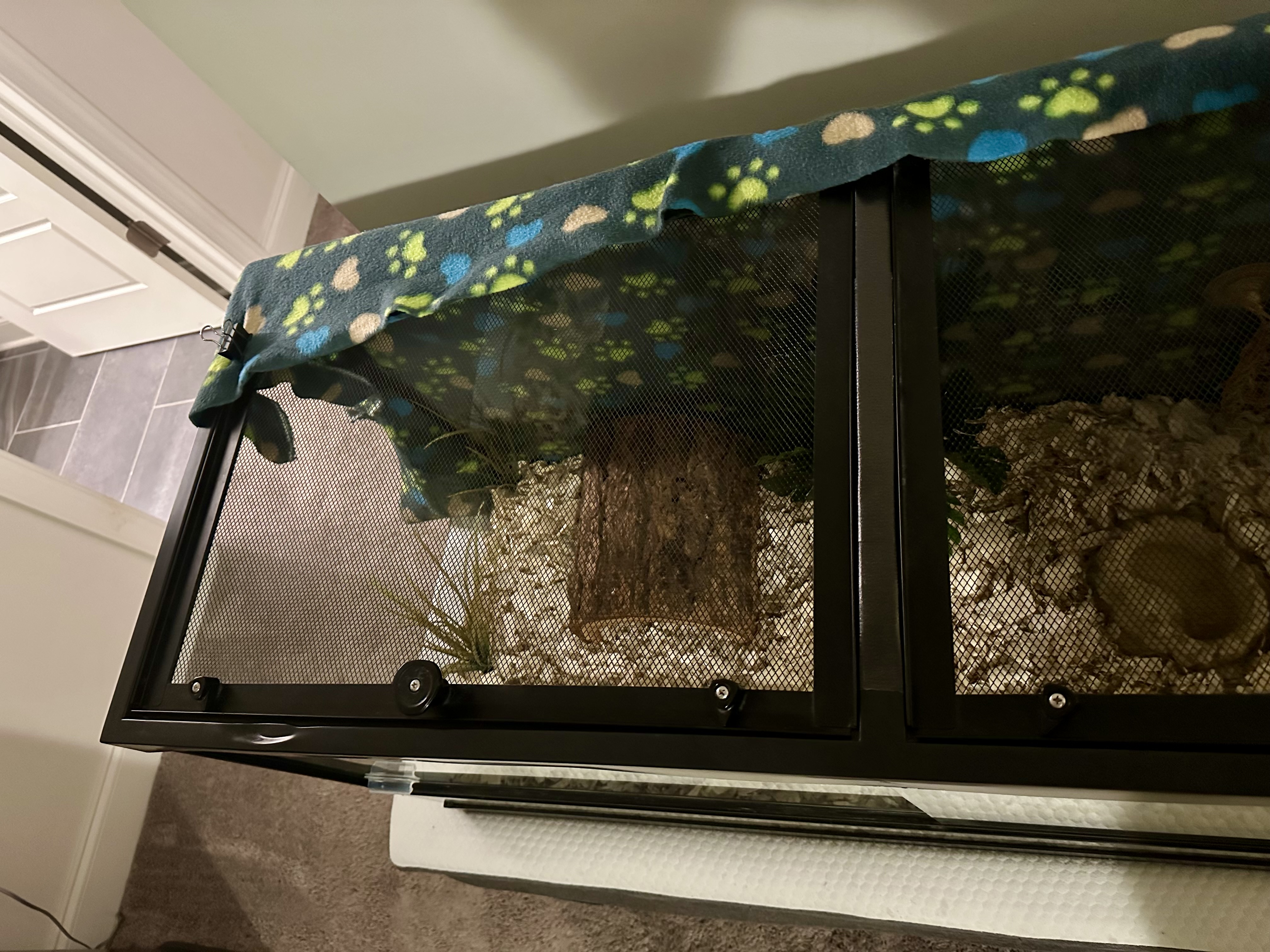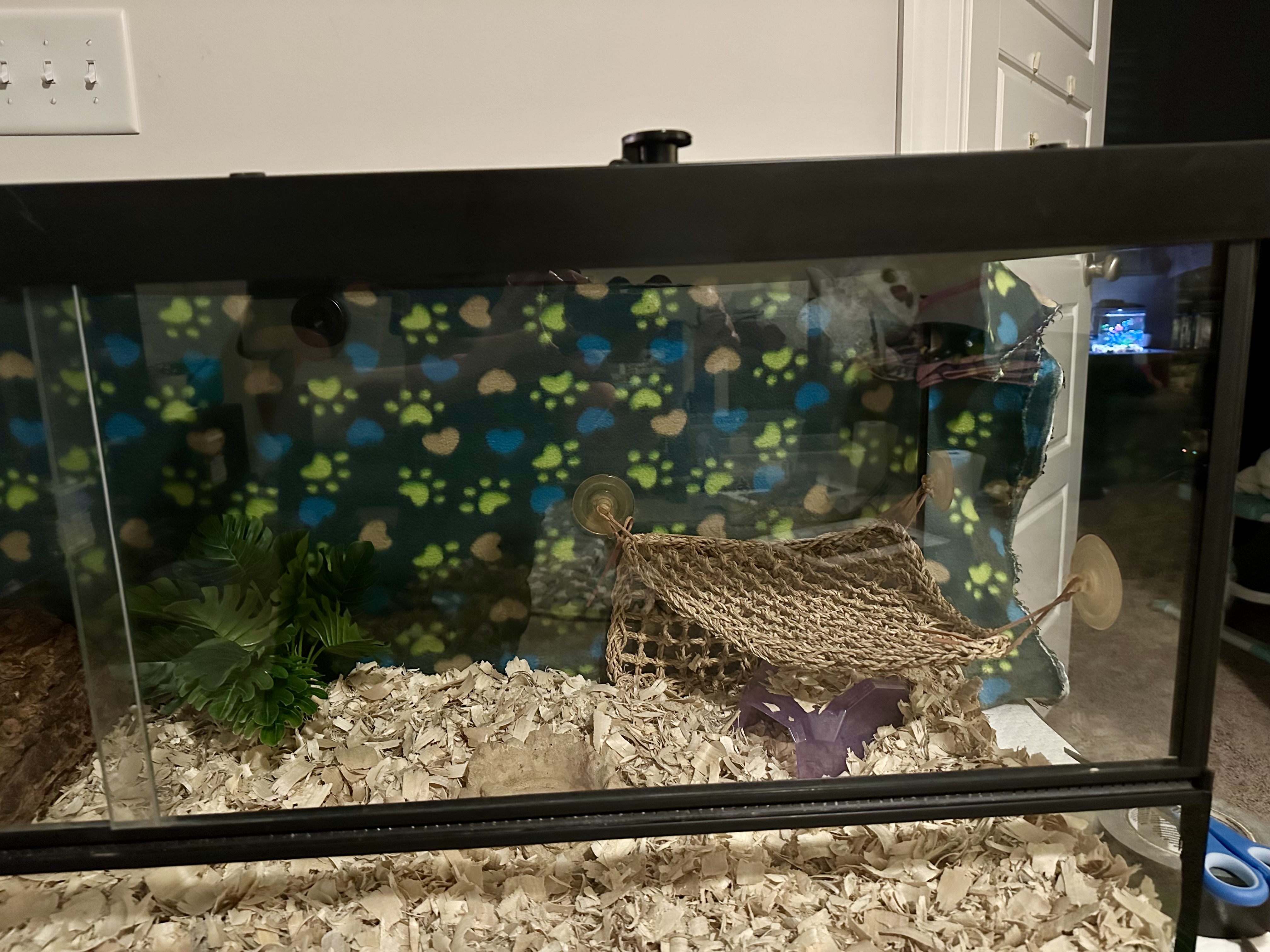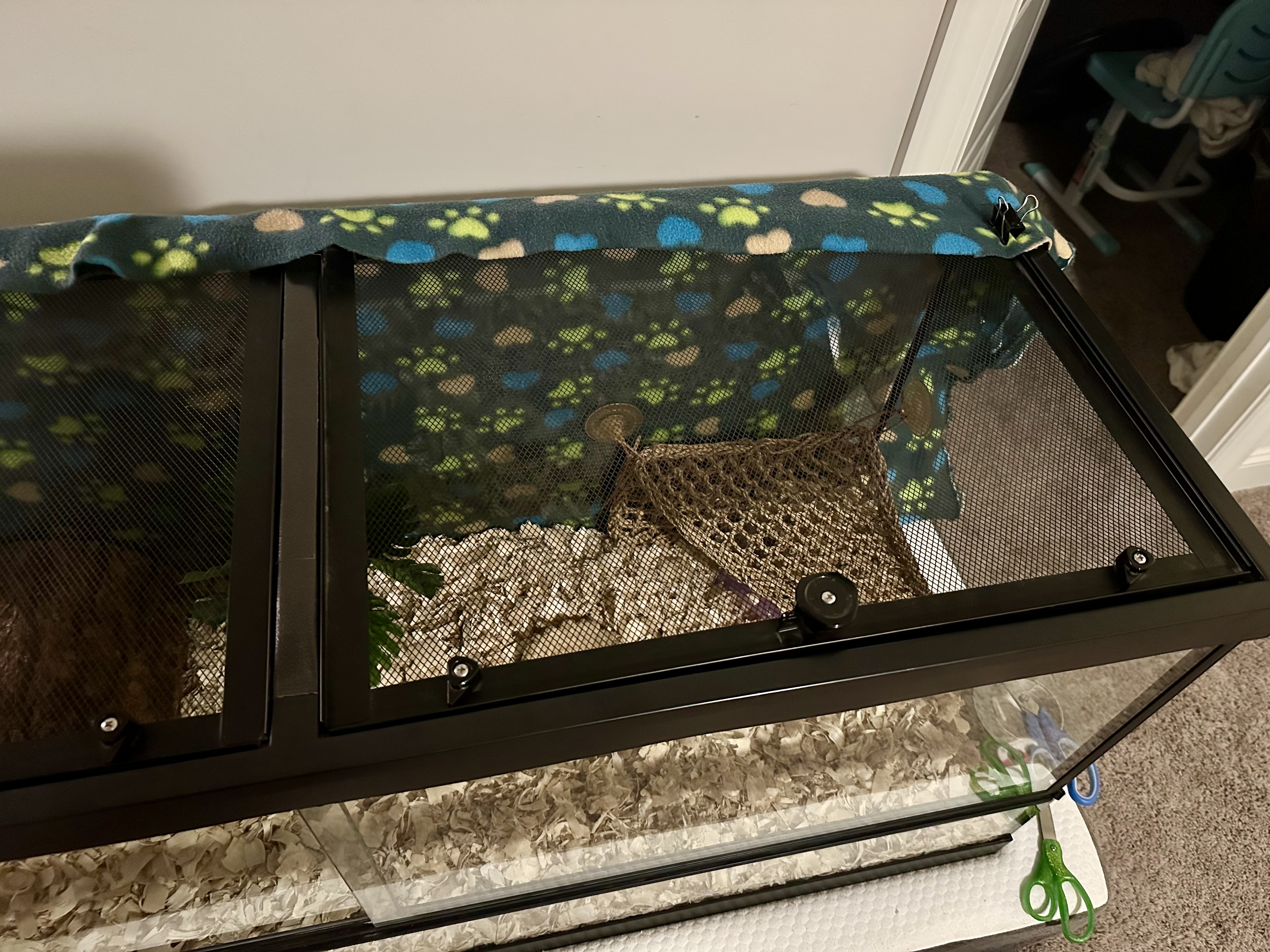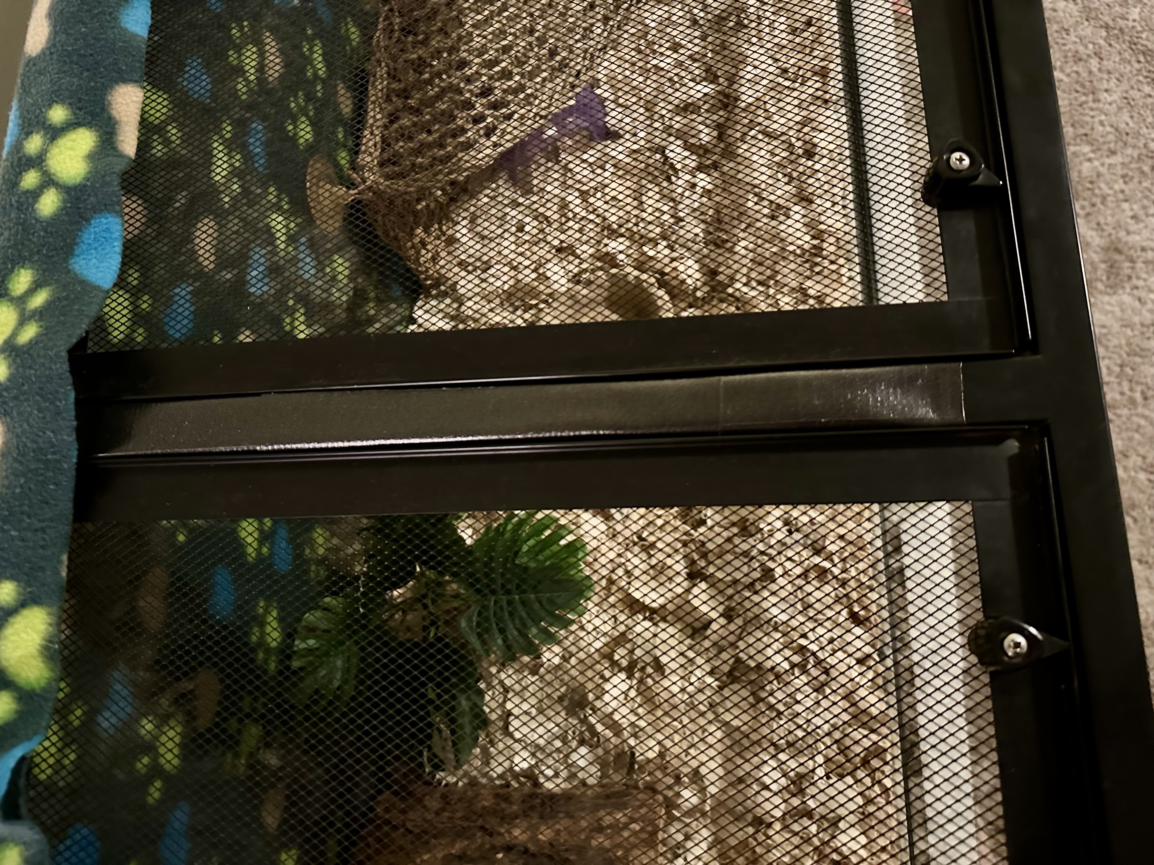 I spent some time this afternoon covering the duct tape I used to fix the plastic divider at the top of the enclosure. Rest assured, Candy Apple, soon to be named Eva, will not be in contact with any adhesives whatsoever.
