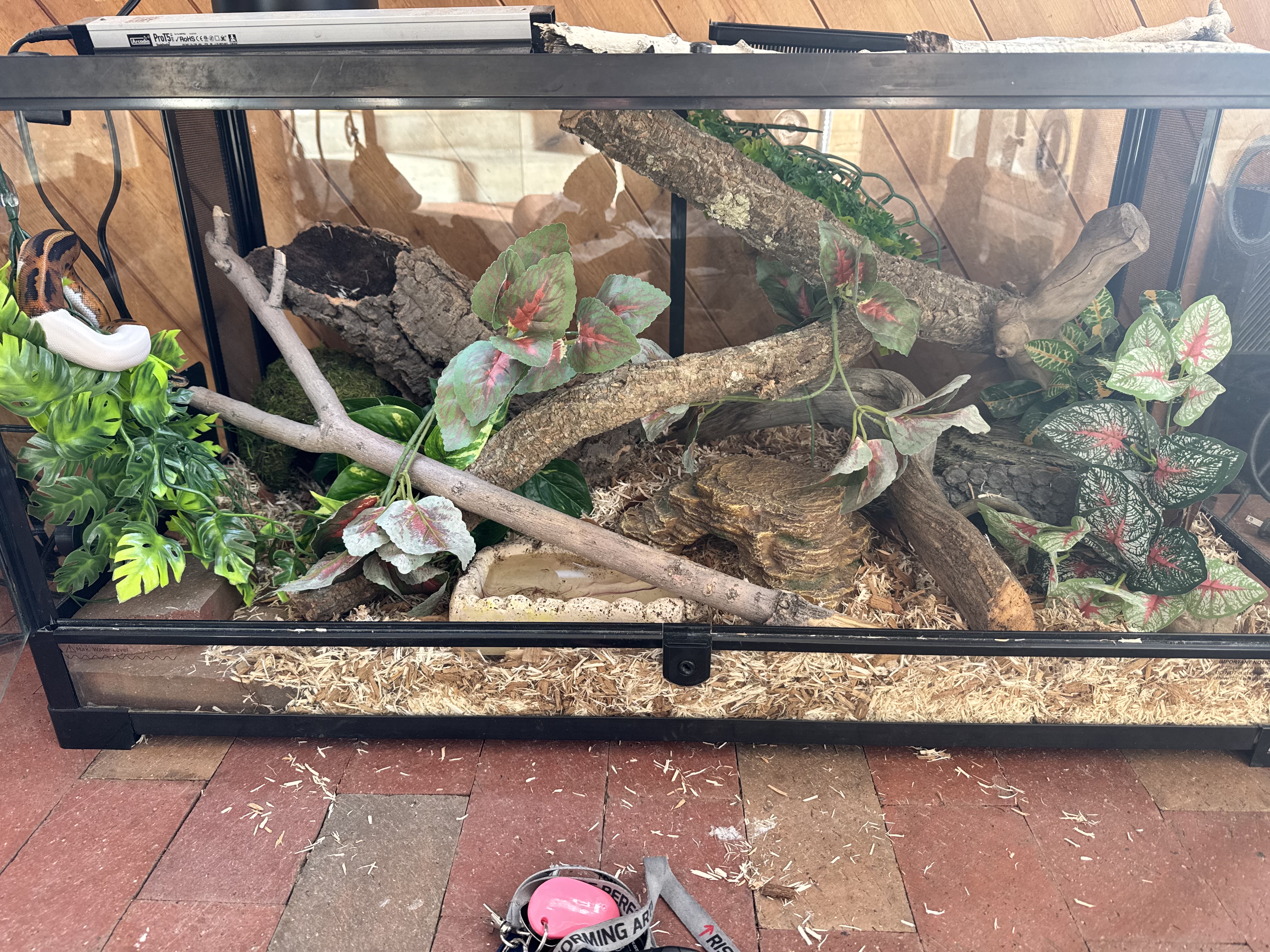 I have attached a photo of him as well as a photo of the inclosure, which is a 55 gal. I have been keeping a blanket over the screen top to maintain humidity and have the sides covered so he feels more secure. He has both UTH and a ceramic heat emitter above, and i try to maintain humidity 60% or more. I plan to change his substrate to coconut husk from aspen shavings (bad advice from local reptile shop i guess) but want to make sure he is eating before I handle him, as I haven’t since he’s been home. Any recommendations or help would be really appreciated, I will be able to breathe so much easier once he is eating!