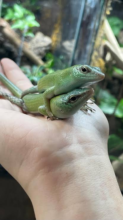 Emerald tree skinks, they’re a very personable little skink that thrives in a cohabitation situation. They eat a combination of bugs and crested gecko powdered diet. They’re known for seeming to be very intelligent, and they almost seem to enjoy being handled, they like to jump onto your arms when you open the enclosure and crawl on you, they’re generally also fine with being picked up and manipulated a bit too, so they’re not just skittish.