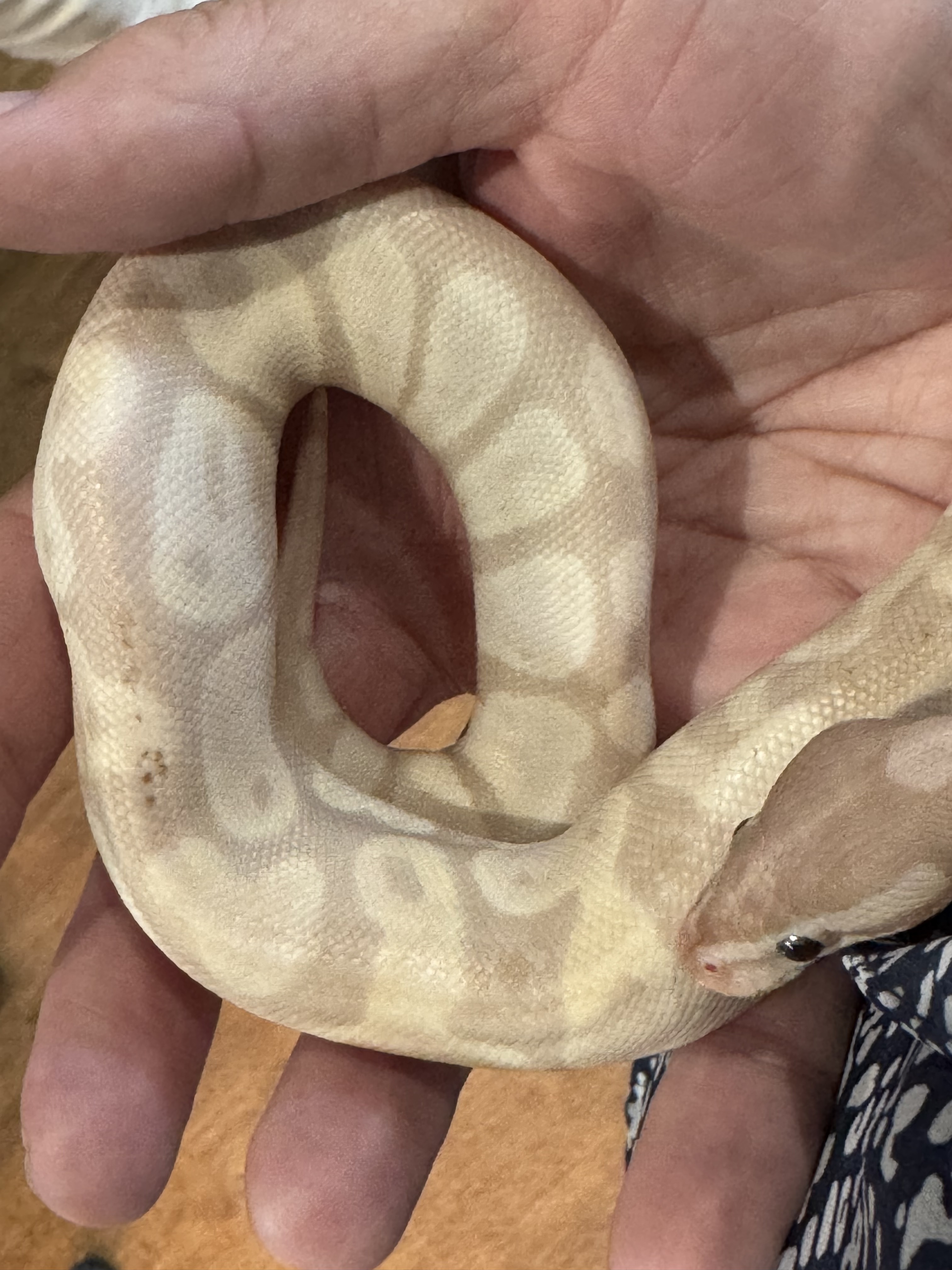 It could still be banana. I was hesitant because they usually have at least a couple spots at that size already. Looking at the first photo again there might be a couple of banana spots I missed further down the body, but the scabs are definitely more of an eyecatcher and concern. That and snakes that aren’t in the best condition often do color up more once they’re settled in and healthy again.