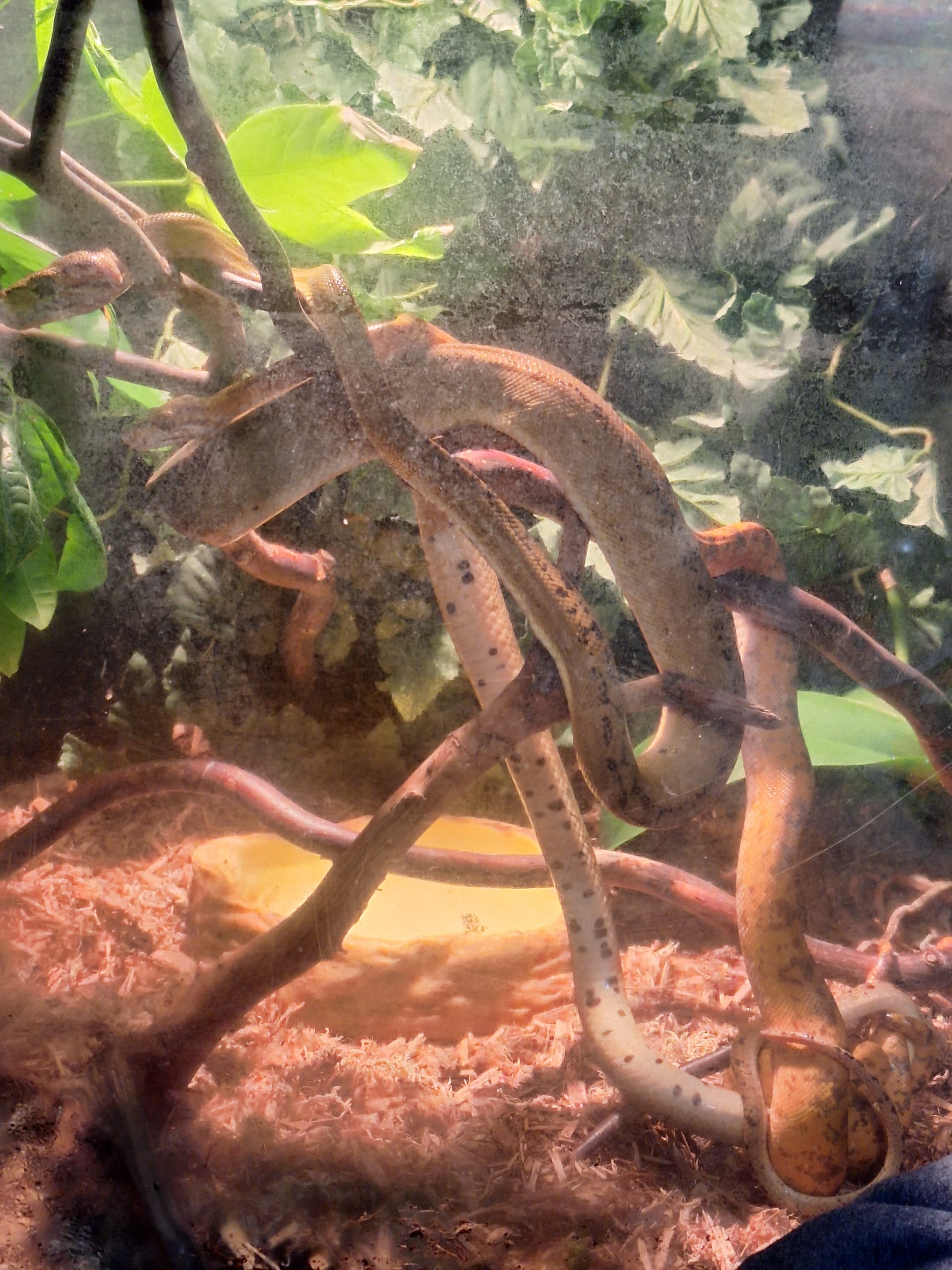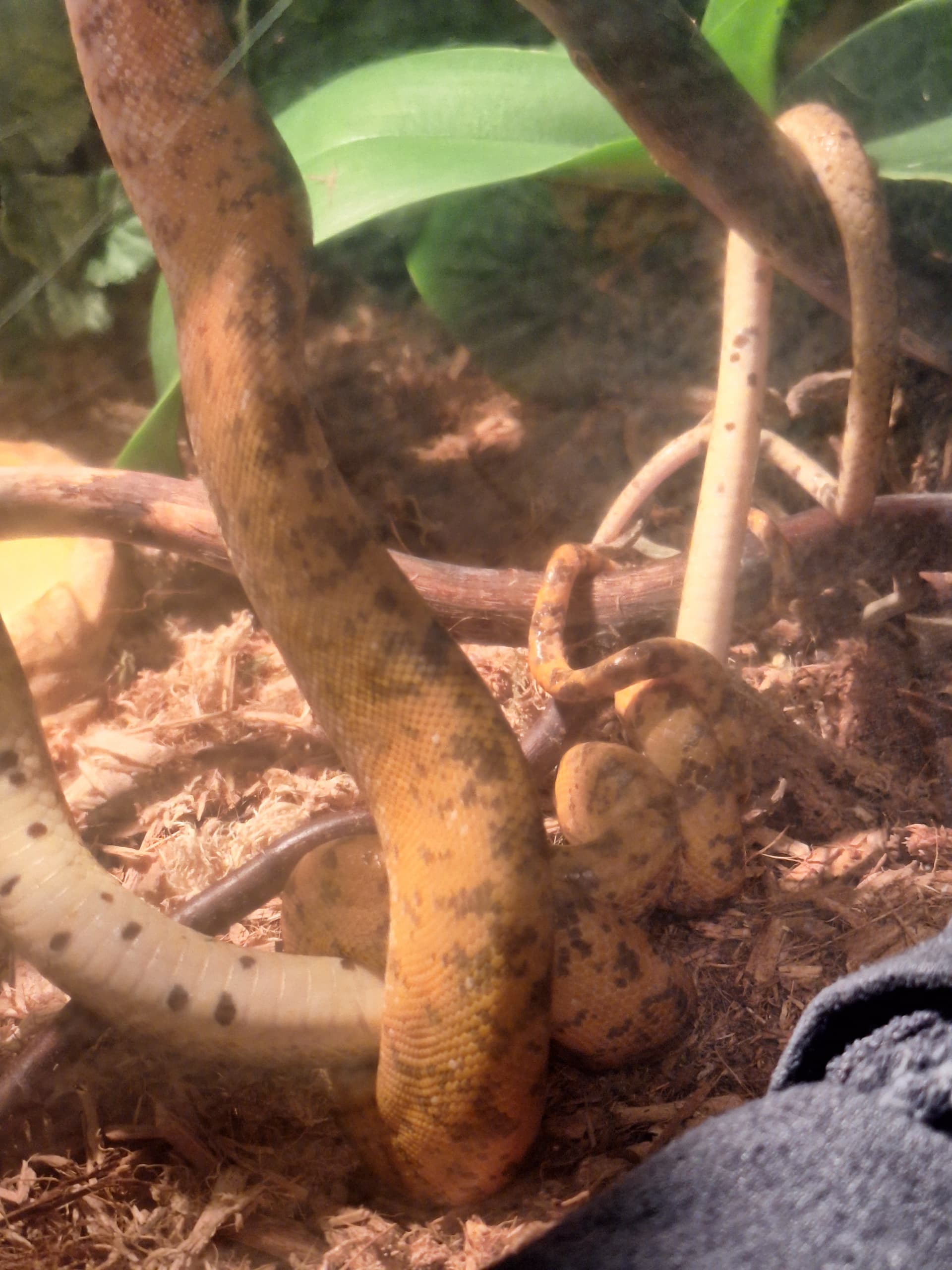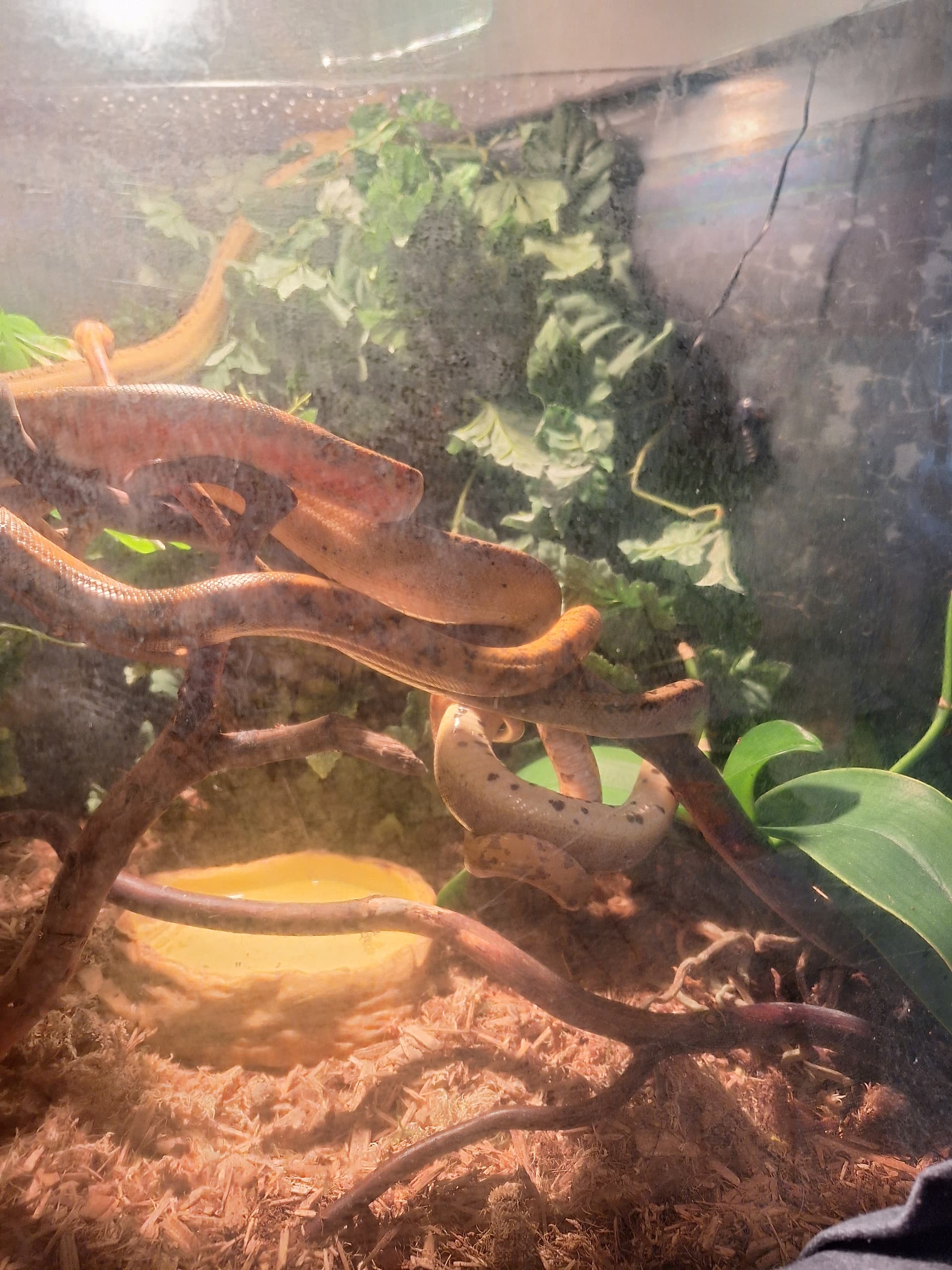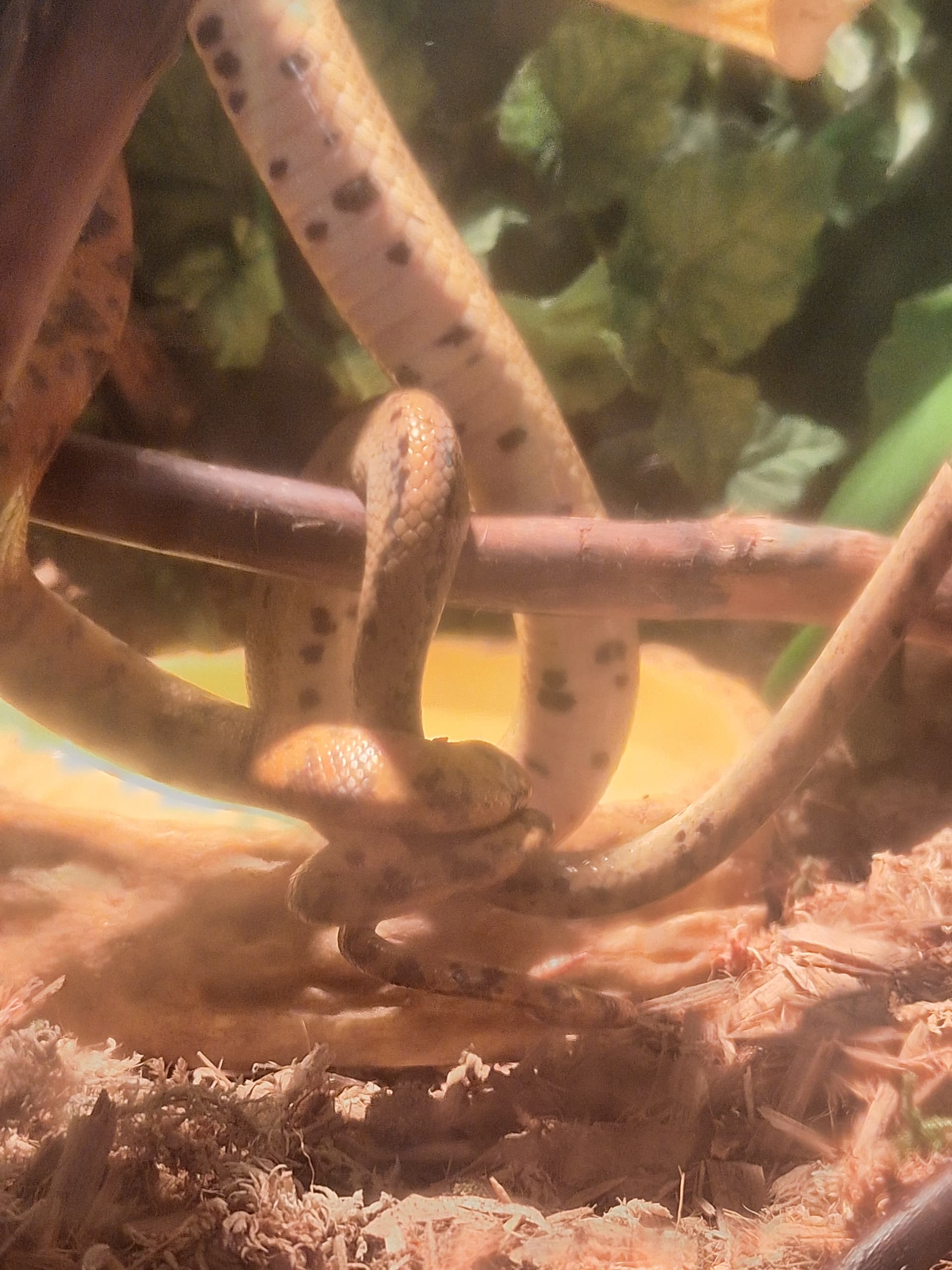 So little miss daisy is already being bred. I don’t know if any of you guys remember but i had tried to breed an orange low expression calico amazon named cheeto with a young silver/grey garden tiger male. Well they were doing fine together &cuddling even thought i saw a few locks until one day, I watched cheeto jump out of a hiding spot &chase the tiger male all around a 120 gallon cage &then wrestle him into the dirt hard. I was like something isnt roght, its usually the other way around. So i pulled cheeto out, gave it a probe &sure enough the snake i bought thati had been raising as female, was labeled as female, even i probed as female when i first got… swallowed the probe &was male!!! I think he was swelling up which led me to think “she” (he) was ovulating was gas that was building up in his system from eating possibly too big of meals or maybe too often or maybe it was just happening. He regurged a few so i stopped feeding him for a month &recently started feeding him slightly smaller meals which he has been keeping down. Anyways since he has been doing better i decided to give him a shot with my new HUGE tiger female, daisy. &since when i thought he was a female, i really wanted to pair him with a tiger to try to make some calico tigers. &now that i have a female tiger i can still potentially do that!!! I have witness at least 10 locks in the last week &3 successful copulations where he was definitely… in. Here’s looking forward to some beautiful snakes in the future.