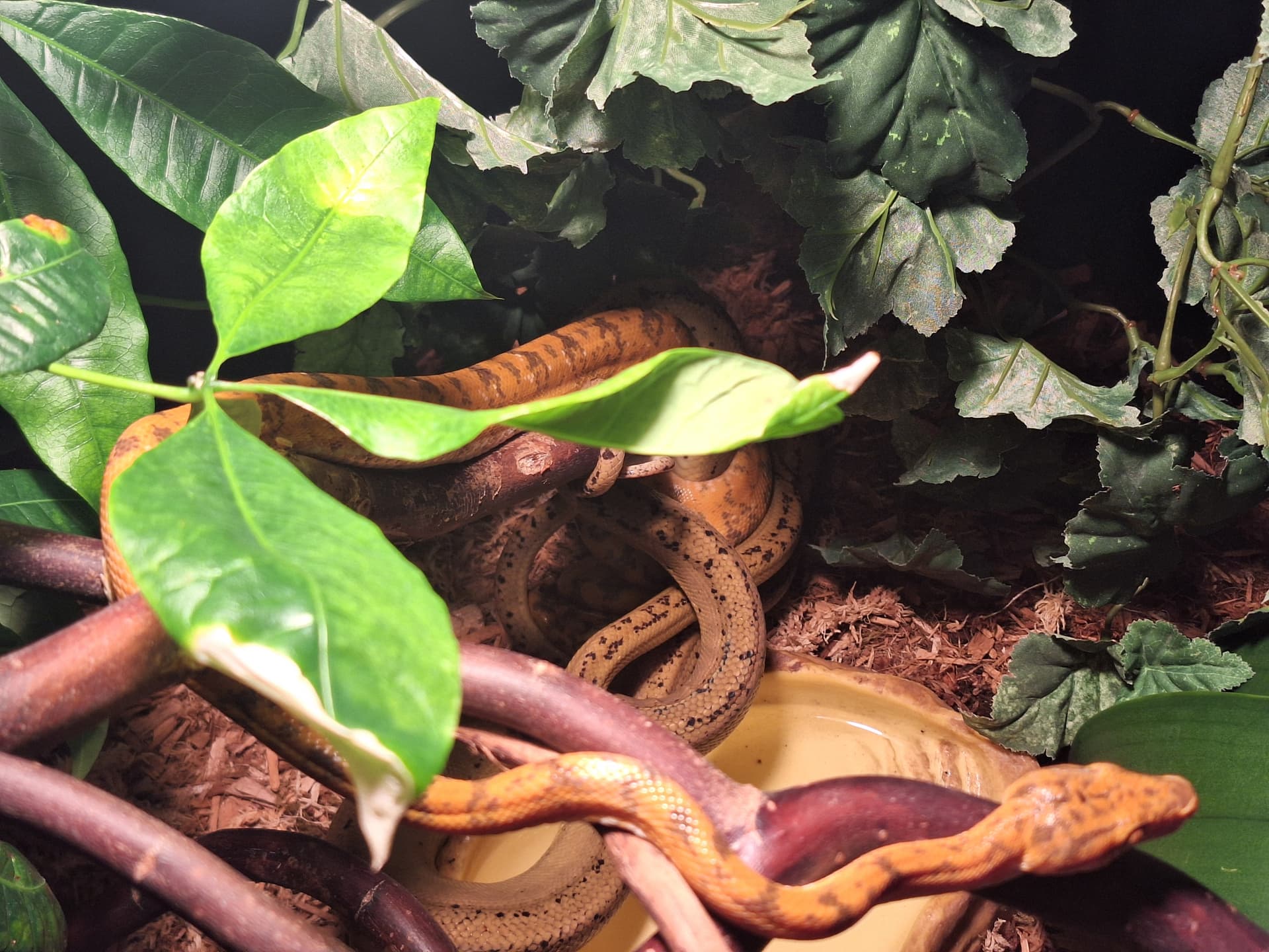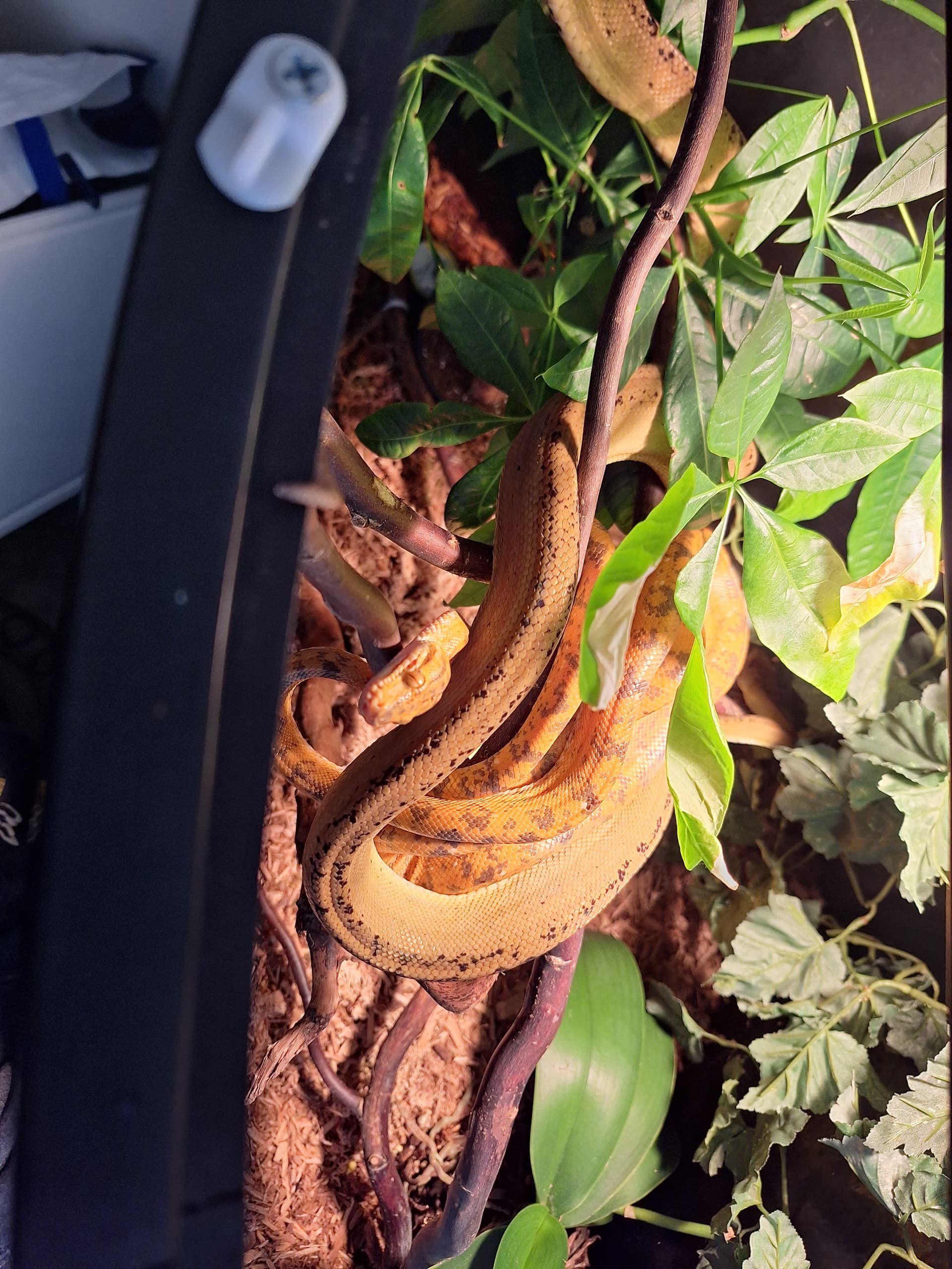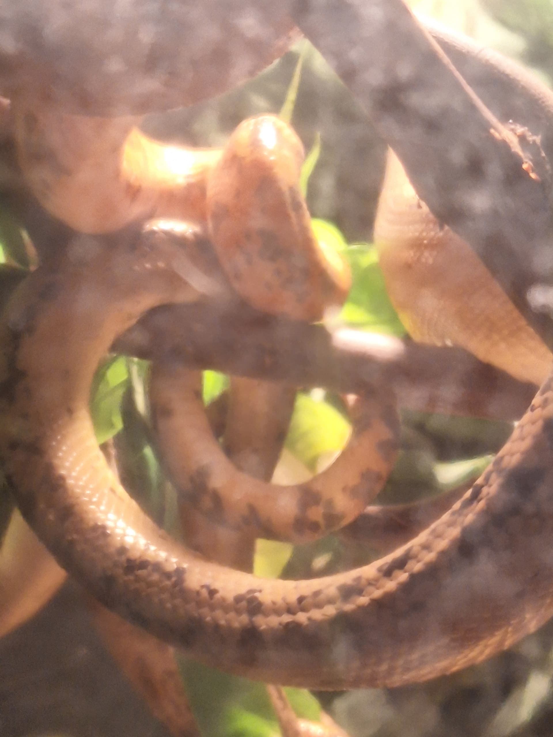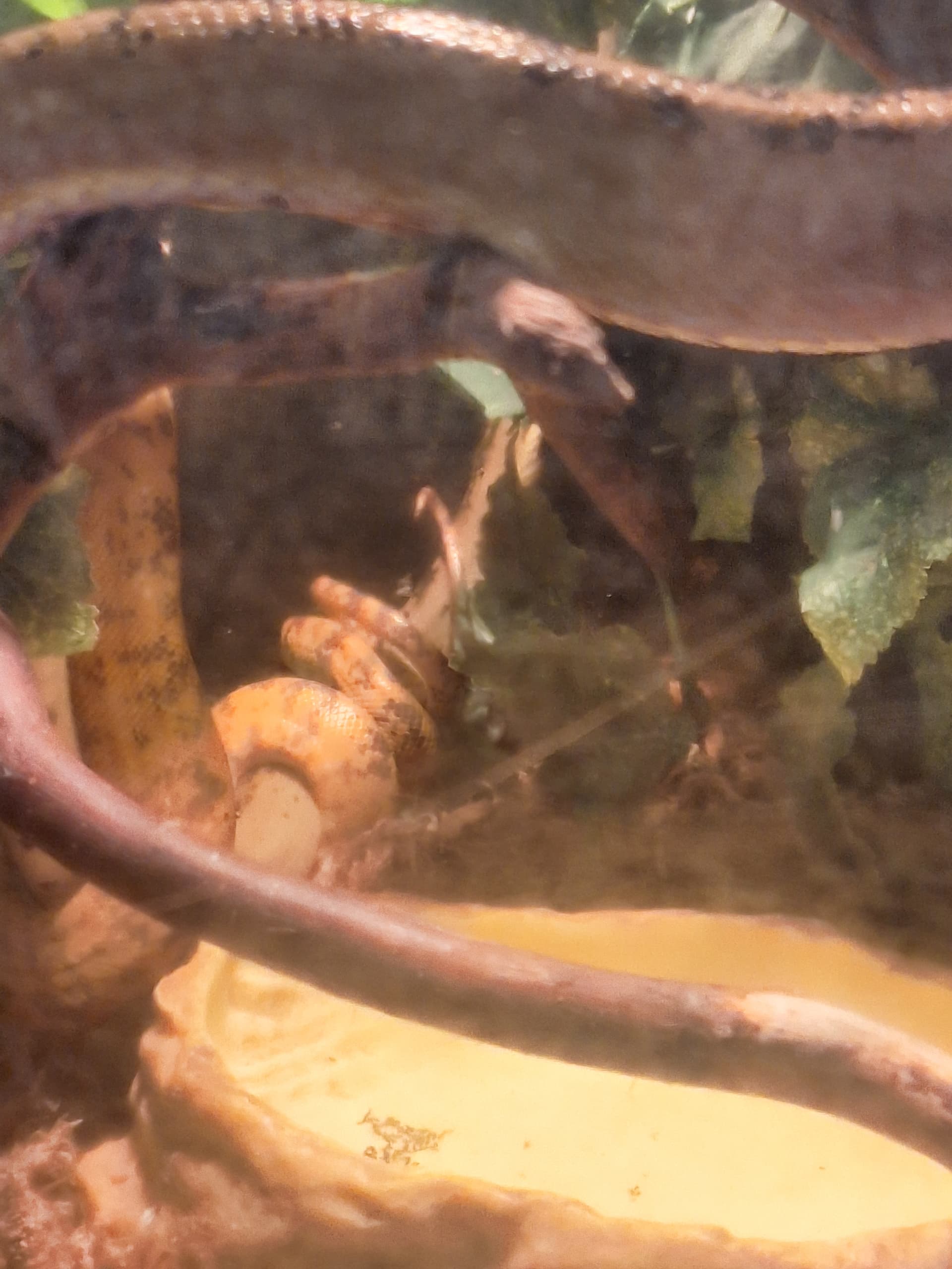 So little miss daisy is already being bred. I don’t know if any of you guys remember but i had tried to breed an orange low expression calico amazon named cheeto with a young silver/grey garden tiger male. Well they were doing fine together &cuddling even thought i saw a few locks until one day, I watched cheeto jump out of a hiding spot &chase the tiger male all around a 120 gallon cage &then wrestle him into the dirt hard. I was like something isnt roght, its usually the other way around. So i pulled cheeto out, gave it a probe &sure enough the snake i bought thati had been raising as female, was labeled as female, even i probed as female when i first got… swallowed the probe &was male!!! I think he was swelling up which led me to think “she” (he) was ovulating was gas that was building up in his system from eating possibly too big of meals or maybe too often or maybe it was just happening. He regurged a few so i stopped feeding him for a month &recently started feeding him slightly smaller meals which he has been keeping down. Anyways since he has been doing better i decided to give him a shot with my new HUGE tiger female, daisy. &since when i thought he was a female, i really wanted to pair him with a tiger to try to make some calico tigers. &now that i have a female tiger i can still potentially do that!!! I have witness at least 10 locks in the last week &3 successful copulations where he was definitely… in. Here’s looking forward to some beautiful snakes in the future.