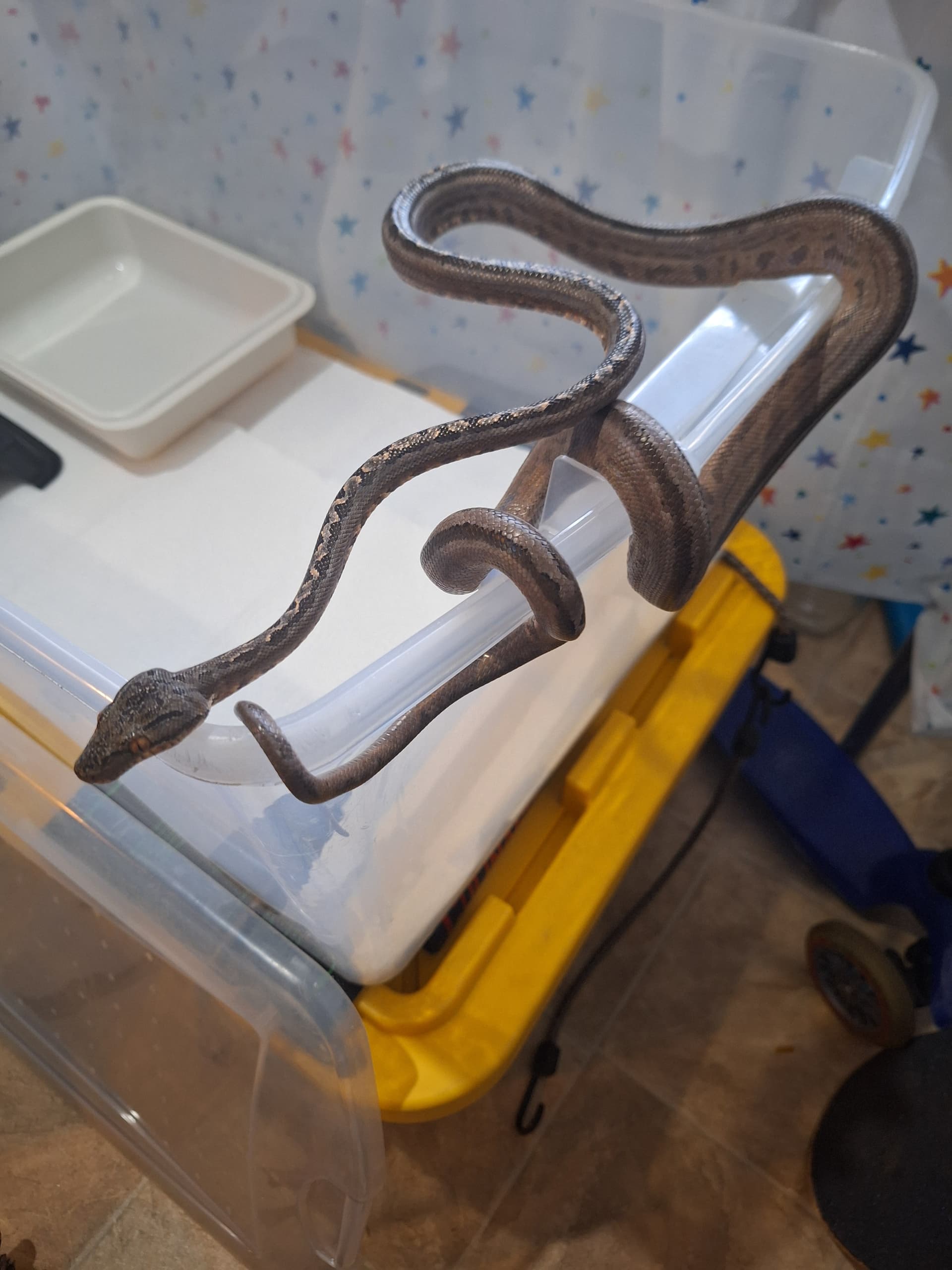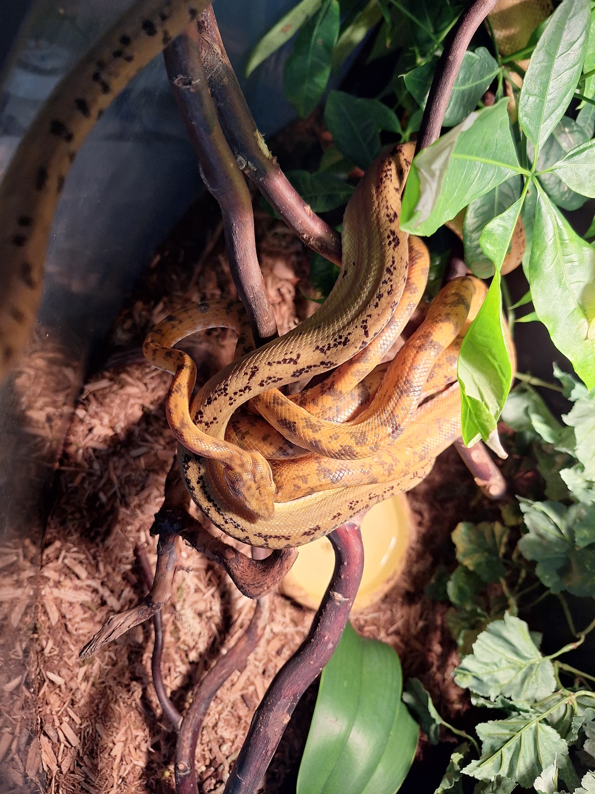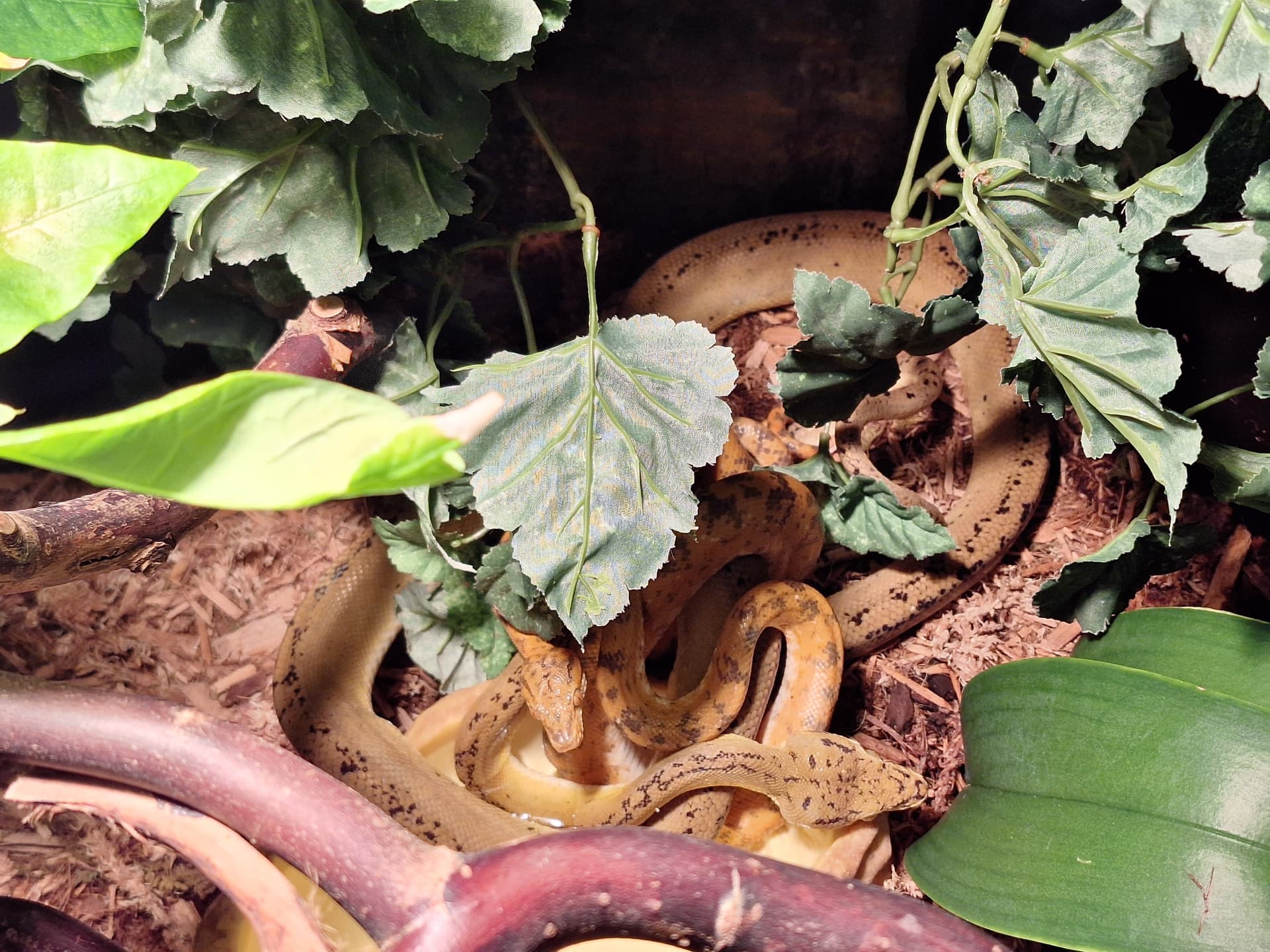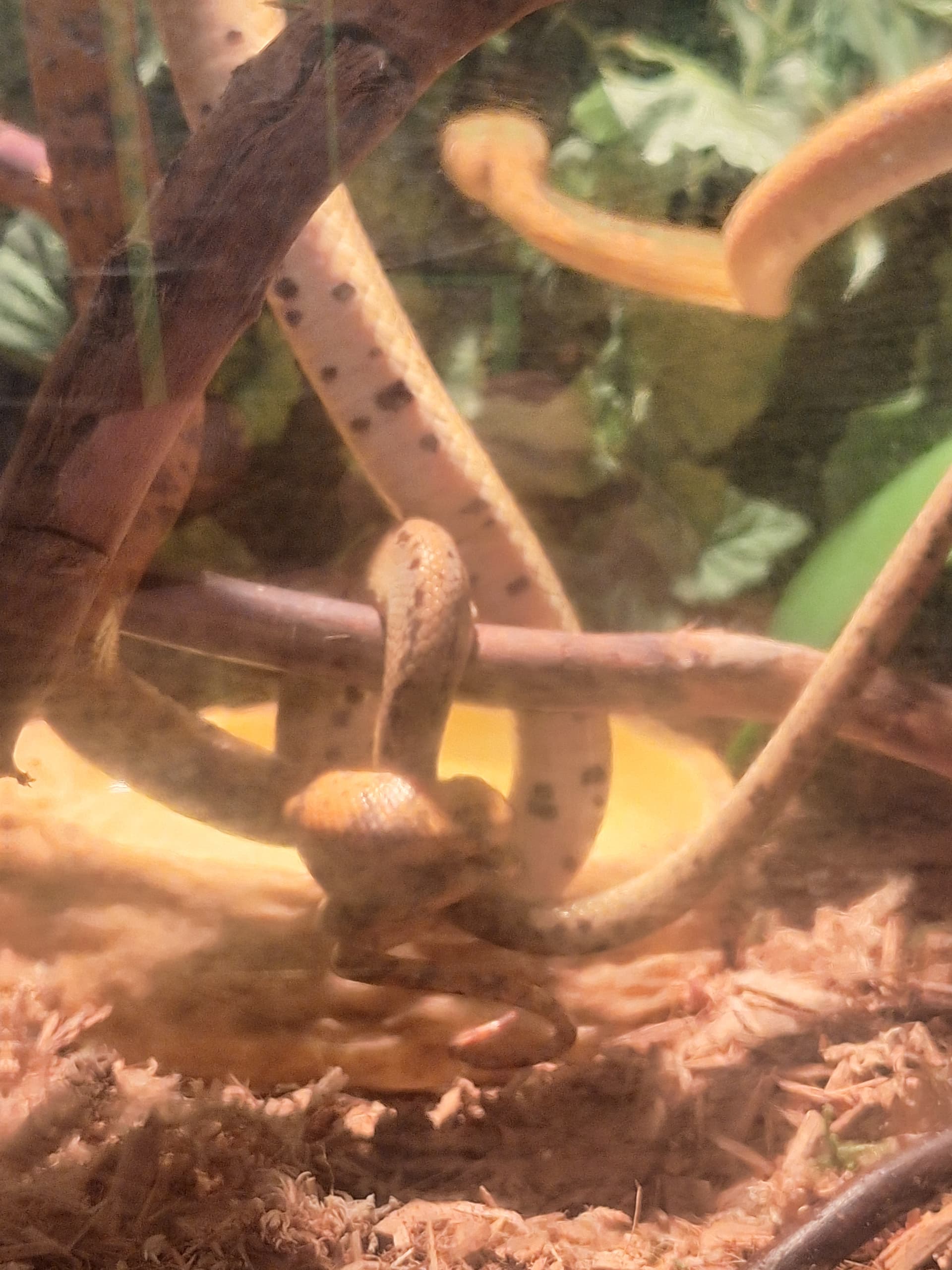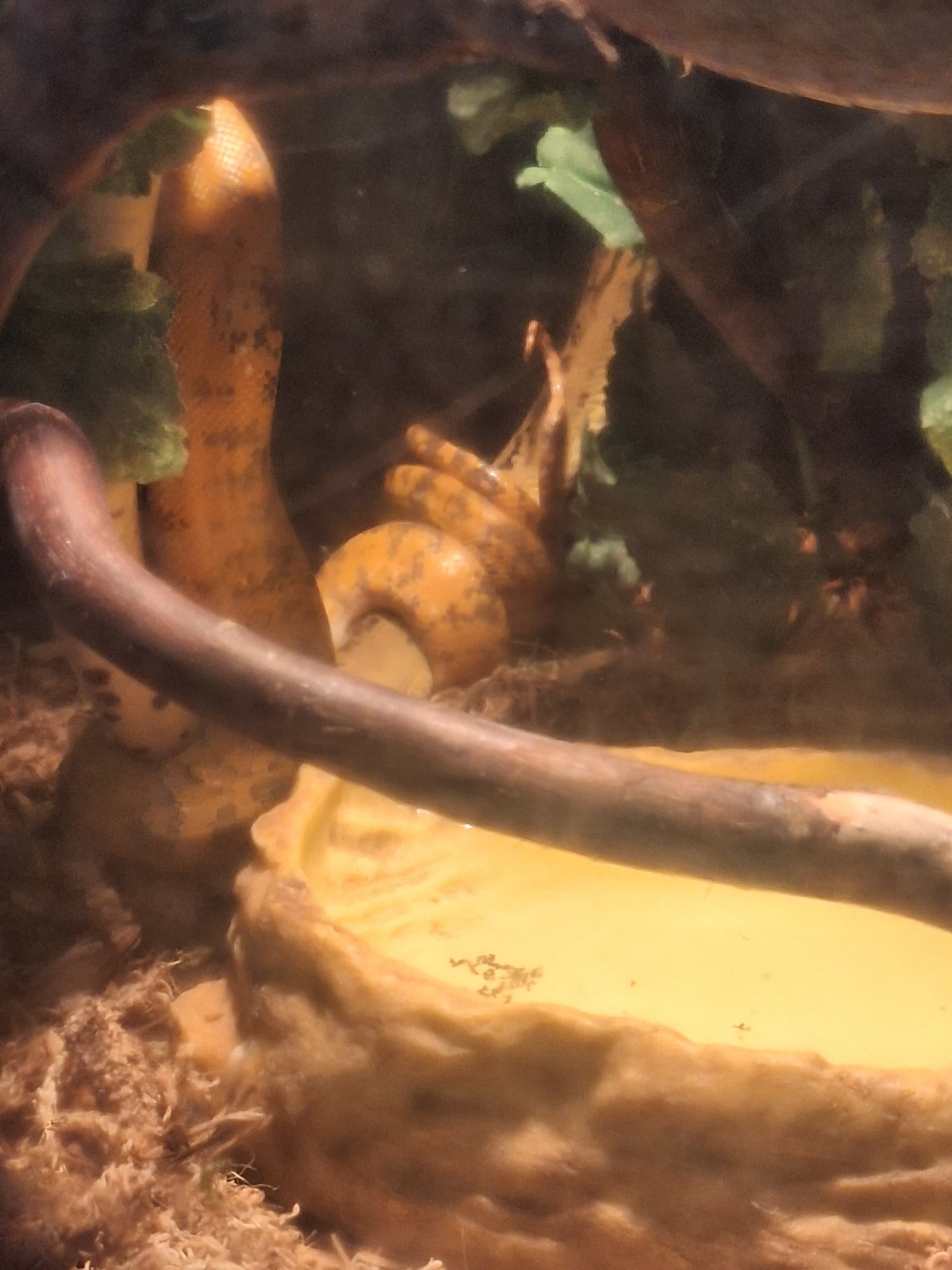So little miss daisy is already being bred. I don’t know if any of you guys remember but i had tried to breed an orange low expression calico amazon named cheeto with a young silver/grey garden tiger male. Well they were doing fine together &cuddling even thought i saw a few locks until one day, I watched cheeto jump out of a hiding spot &chase the tiger male all around a 120 gallon cage &then wrestle him into the dirt hard. I was like something isnt roght, its usually the other way around. So i pulled cheeto out, gave it a probe &sure enough the snake i bought thati had been raising as female, was labeled as female, even i probed as female when i first got… swallowed the probe &was male!!! I think he was swelling up which led me to think “she” (he) was ovulating was gas that was building up in his system from eating possibly too big of meals or maybe too often or maybe it was just happening. He regurged a few so i stopped feeding him for a month &recently started feeding him slightly smaller meals which he has been keeping down. Anyways since he has been doing better i decided to give him a shot with my new HUGE tiger female, daisy. &since when i thought he was a female, i really wanted to pair him with a tiger to try to make some calico tigers. &now that i have a female tiger i can still potentially do that!!! I have witness at least 10 locks in the last week &3 successful copulations where he was definitely… in. Here’s looking forward to some beautiful snakes in the future.