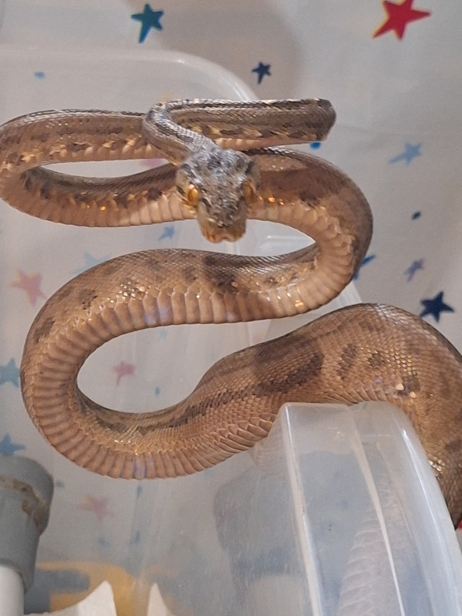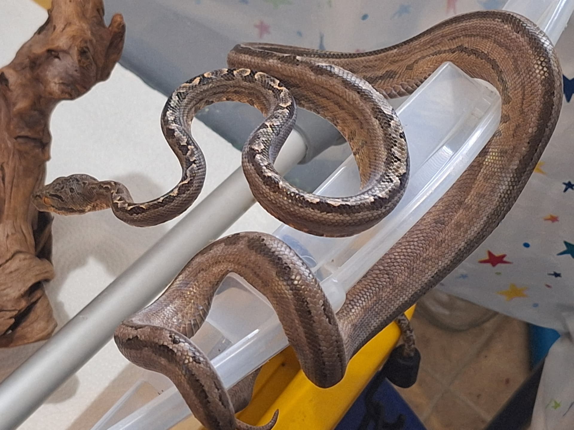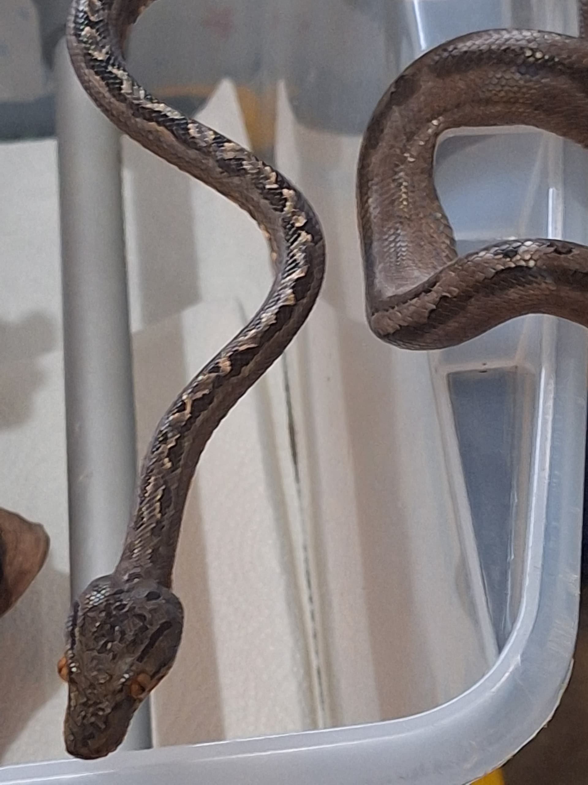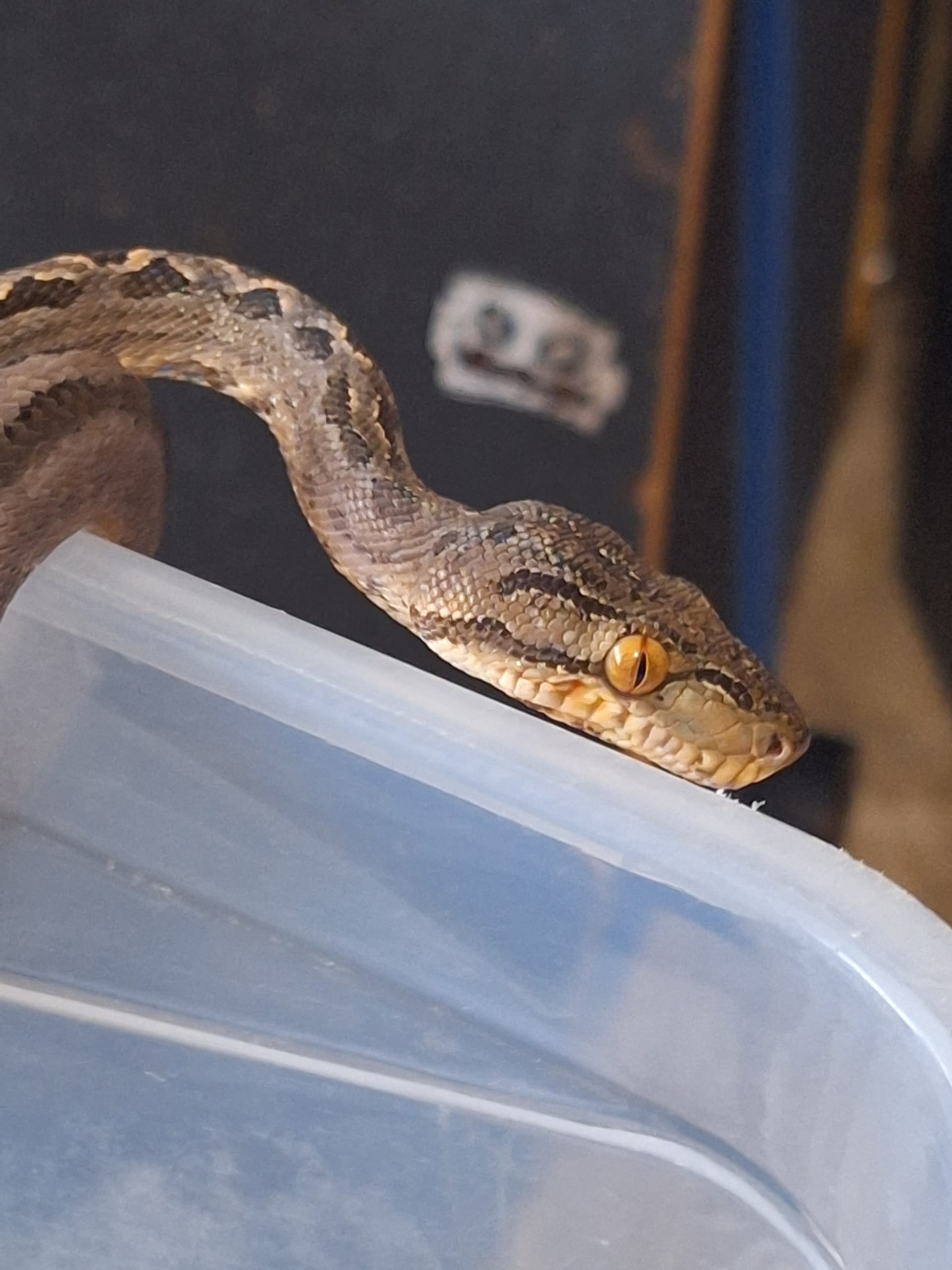 So little miss daisy is already being bred. I don’t know if any of you guys remember but i had tried to breed an orange low expression calico amazon named cheeto with a young silver/grey garden tiger male. Well they were doing fine together &cuddling even thought i saw a few locks until one day, I watched cheeto jump out of a hiding spot &chase the tiger male all around a 120 gallon cage &then wrestle him into the dirt hard. I was like something isnt roght, its usually the other way around. So i pulled cheeto out, gave it a probe &sure enough the snake i bought thati had been raising as female, was labeled as female, even i probed as female when i first got… swallowed the probe &was male!!! I think he was swelling up which led me to think “she” (he) was ovulating was gas that was building up in his system from eating possibly too big of meals or maybe too often or maybe it was just happening. He regurged a few so i stopped feeding him for a month &recently started feeding him slightly smaller meals which he has been keeping down. Anyways since he has been doing better i decided to give him a shot with my new HUGE tiger female, daisy. &since when i thought he was a female, i really wanted to pair him with a tiger to try to make some calico tigers. &now that i have a female tiger i can still potentially do that!!! I have witness at least 10 locks in the last week &3 successful copulations where he was definitely… in. Here’s looking forward to some beautiful snakes in the future.