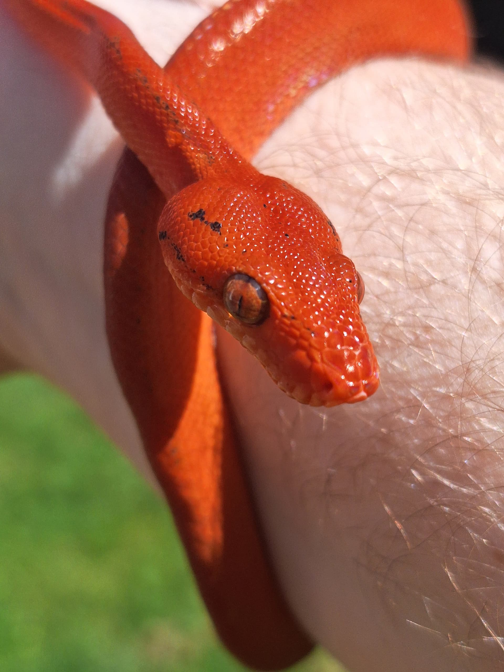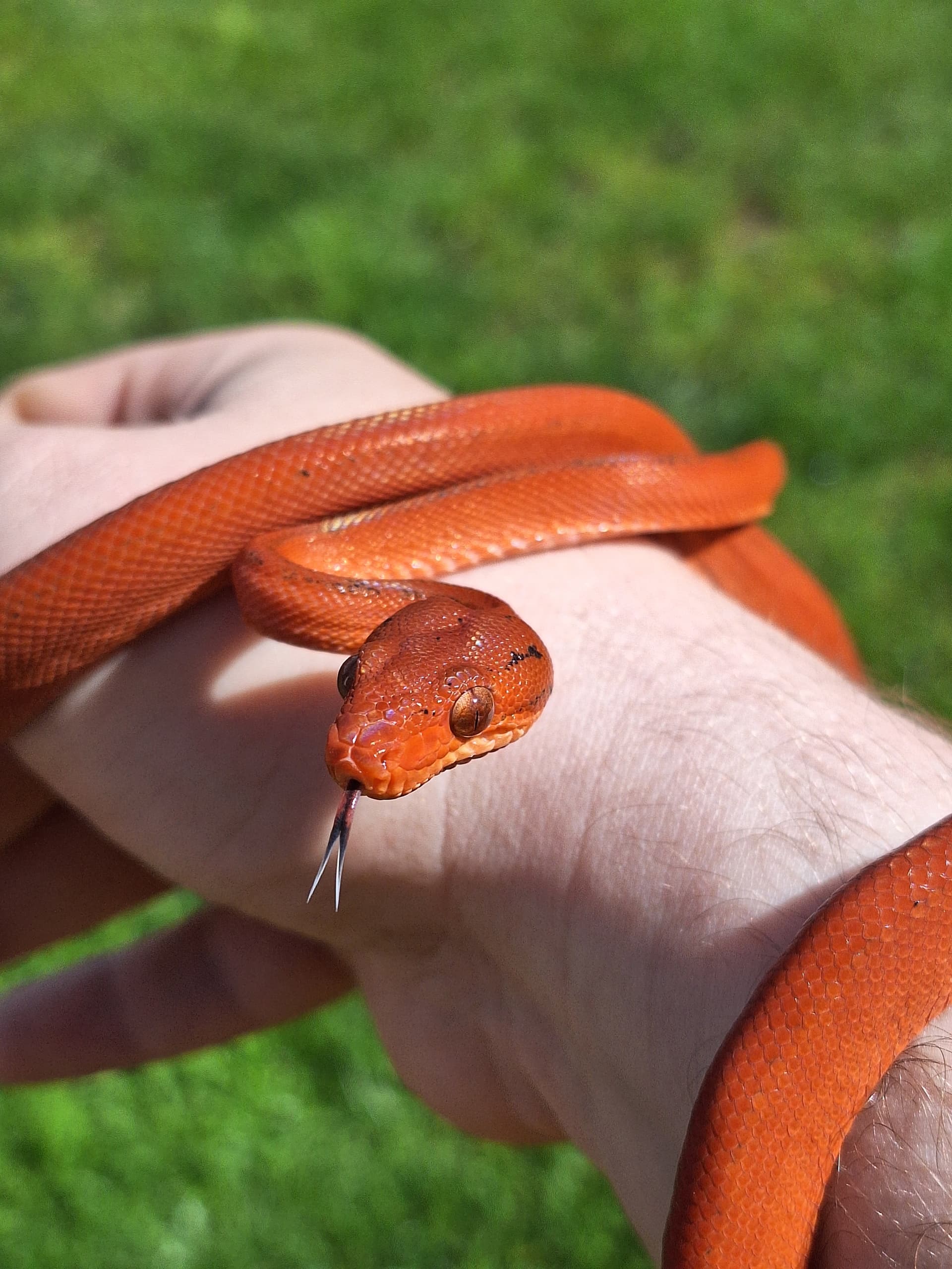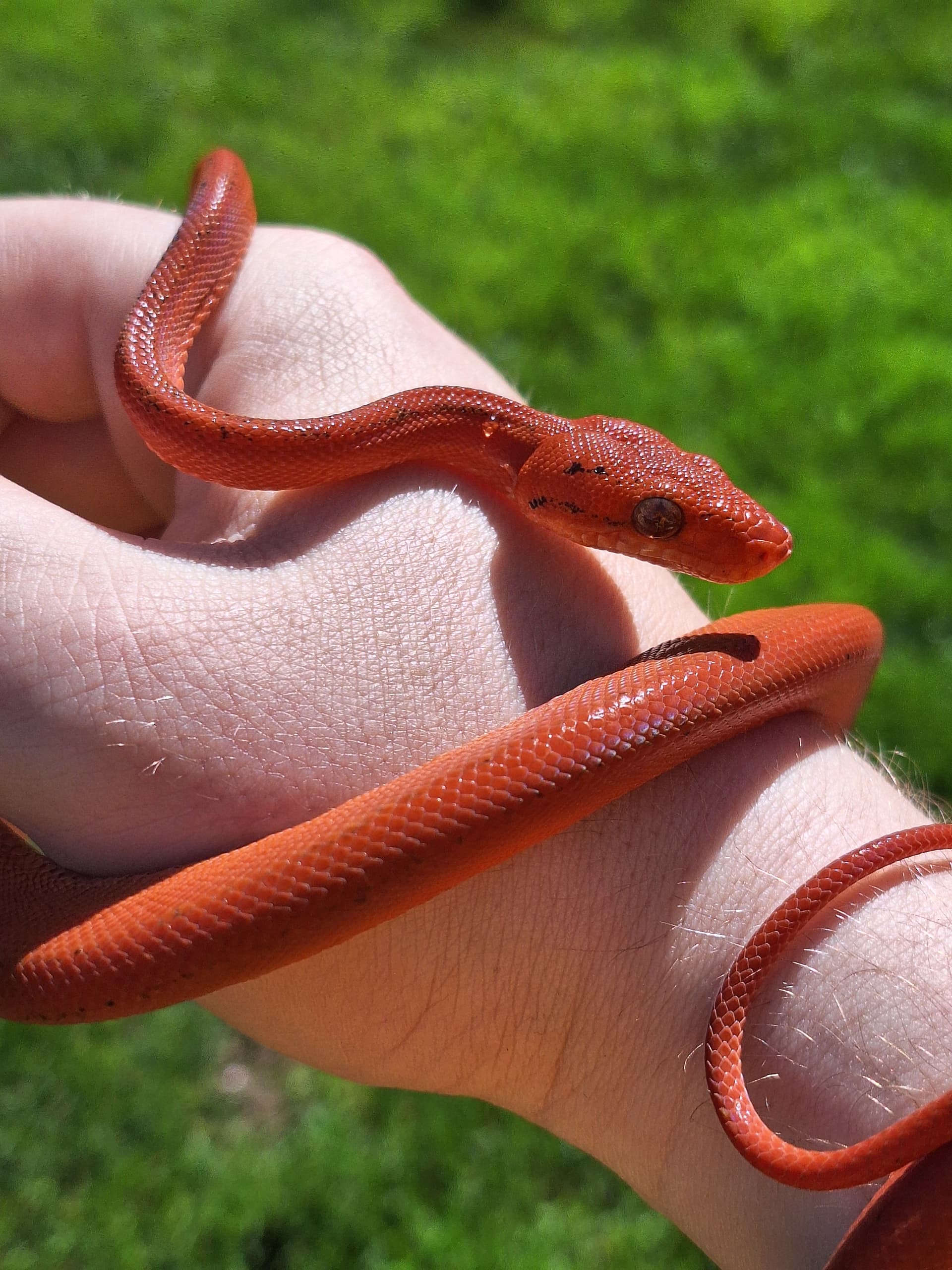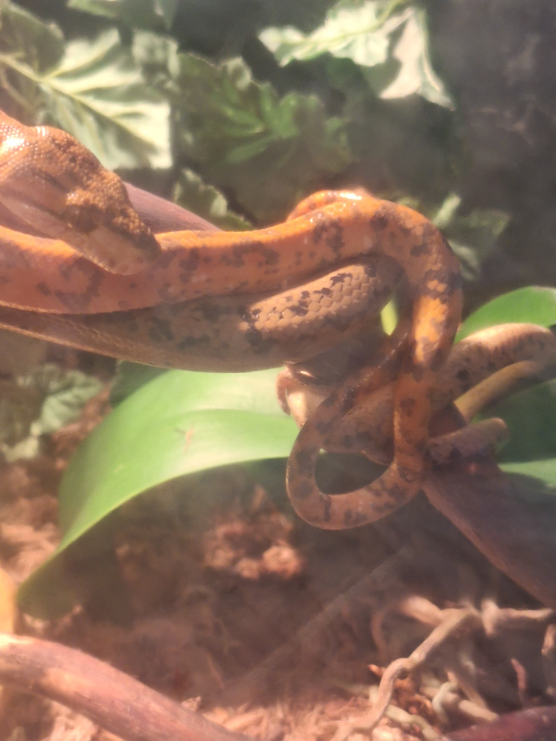 Let’s hope these rad genes take hold, i can’t wait to see what comes out of this pairing. They are both beyond magnificent snakes. I’ve never actually seen another orange calico either… if seen some brownish, burnt orange, brick red &white (garden calico) but not a bright neon orange calico &he keeps getting more &more white speckling/spreading from his belly up every time he sheds. He is still young too, just turned three so it will be cool to see what he changes into as an adult!!!