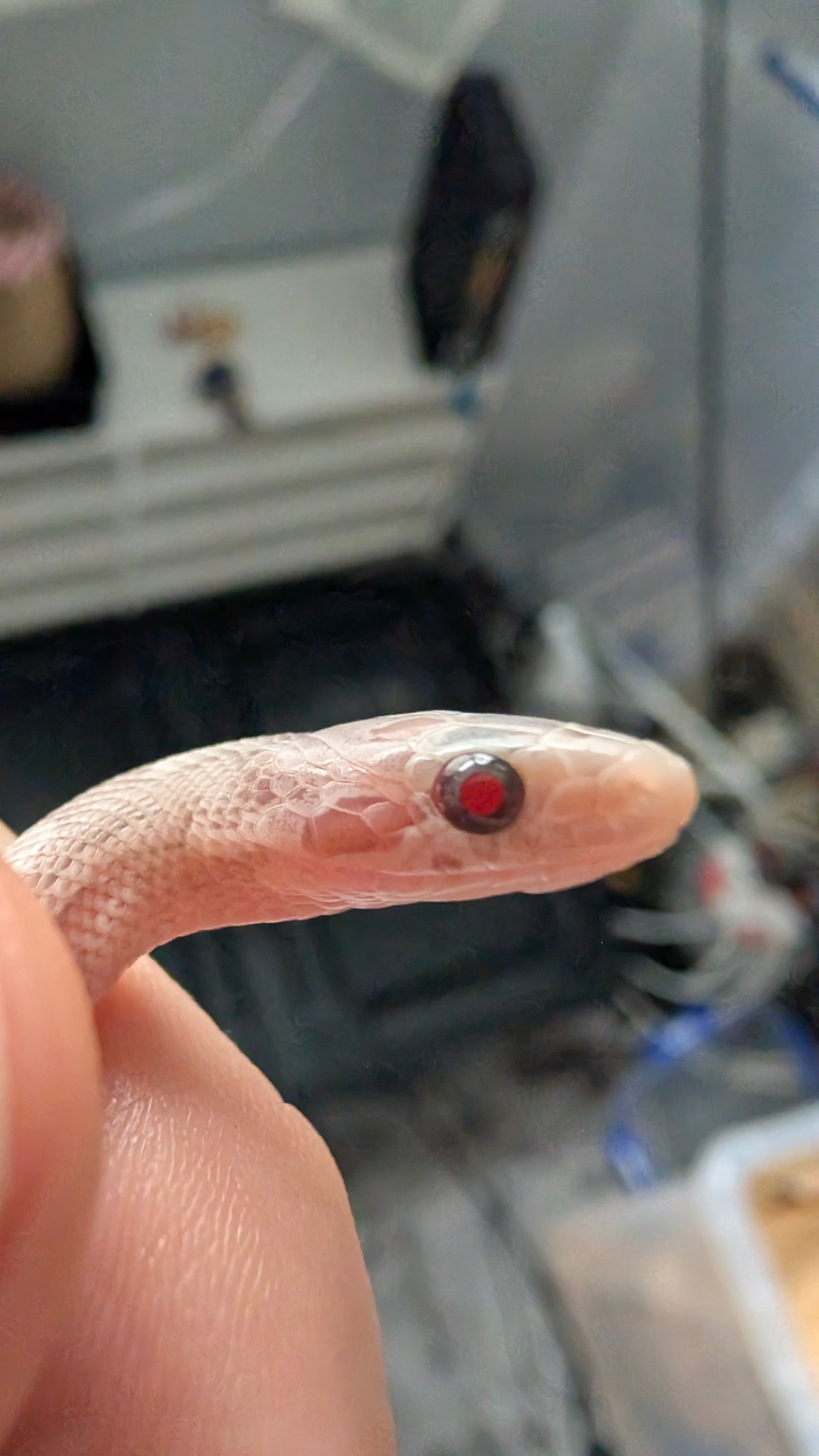 That’s the classic, ruby pupil. It’s caused by reduced melanin in the retina and is seen with Hypo morphs. Lavenders often have it too, Hypo or not. That will sometimes turn darker as they grow and deposit more pigmentation, but some have it through life. Nice image!