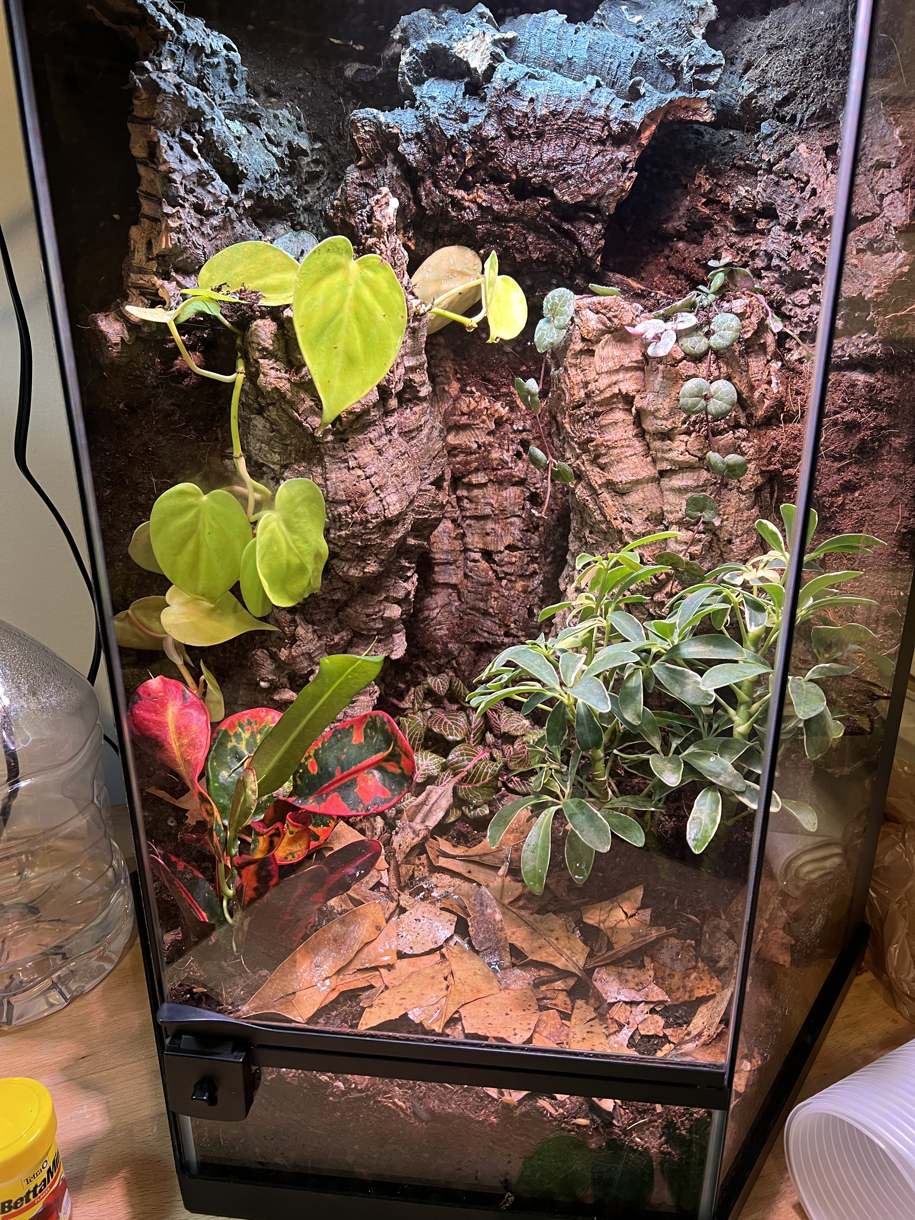 I’m undecided currently. I don’t have a lot of room, but I also know I don’t seem to have a ton of horizontal space. Where it’s a hexagon, I did the back half of it (so 3 out of 6 sides) in the cork bark/custom background. There’s a tunnel that’s horizontal near the top, but I’m not really sure how to add branches that would look good and not block my plants from light. It’s got to sit for a month or so before she goes in there, so I may tweak it as we go