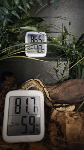 I have two probes to measure temperature in there. One is suspended about 6-8 inches below (offset a bit) under the RHP and the other is suspended about 4-5 inches below (again, offset a bit) under the DHP. The RHP is the “warm” side, the DHP is the “cool” side. These aren’t set in stone; I’m perfectly willing to switch what side is warm and cool, but I went with the RHP being “warm” because I was worried the RHP would just nuke the top of the hide in an effort to make that side “warm”.