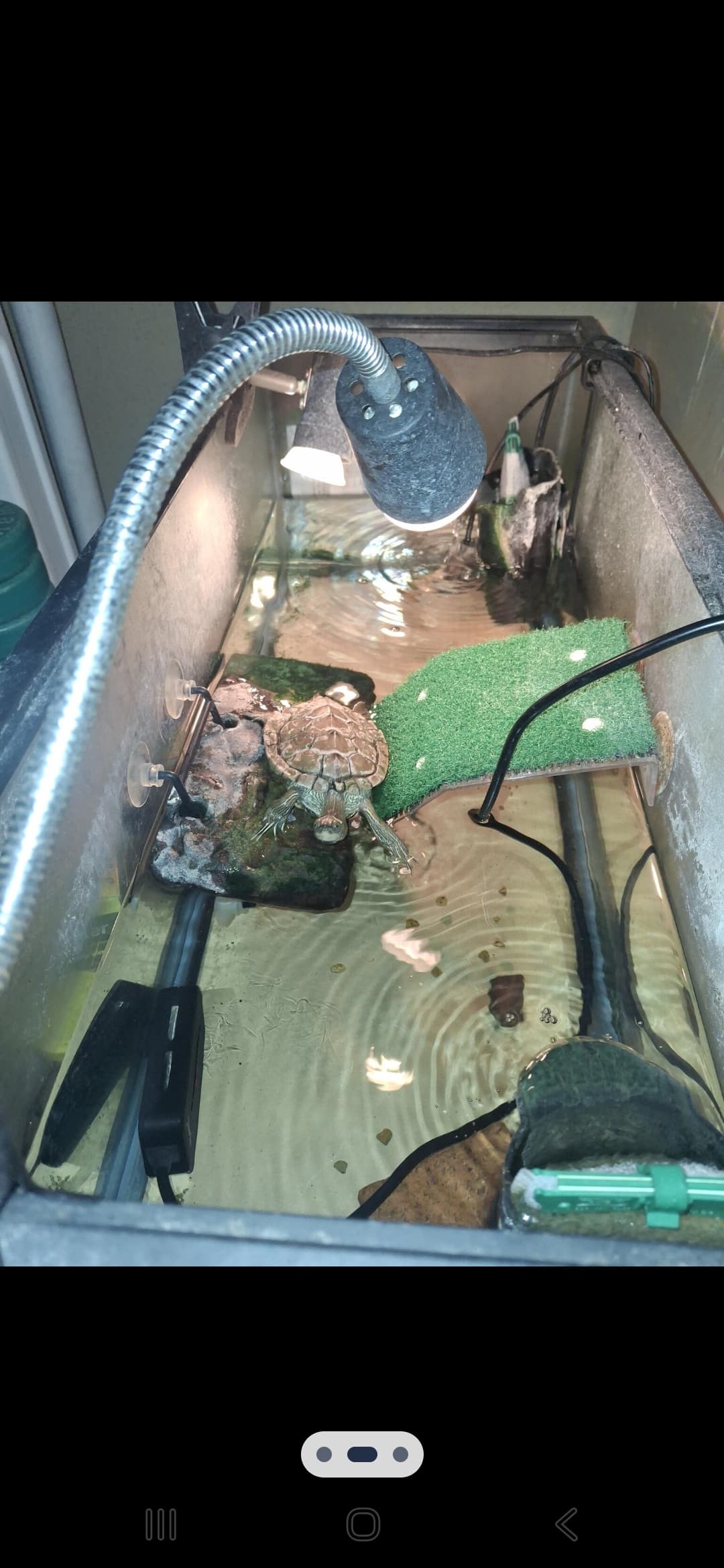 With few exceptions, turtles need to dry out when basking. This limits any bacterial or fungal growth as they, pathogens, need moisture to survive. Make sure the basking area is sufficiently large and high enough to allow the animals to dry out completely.
