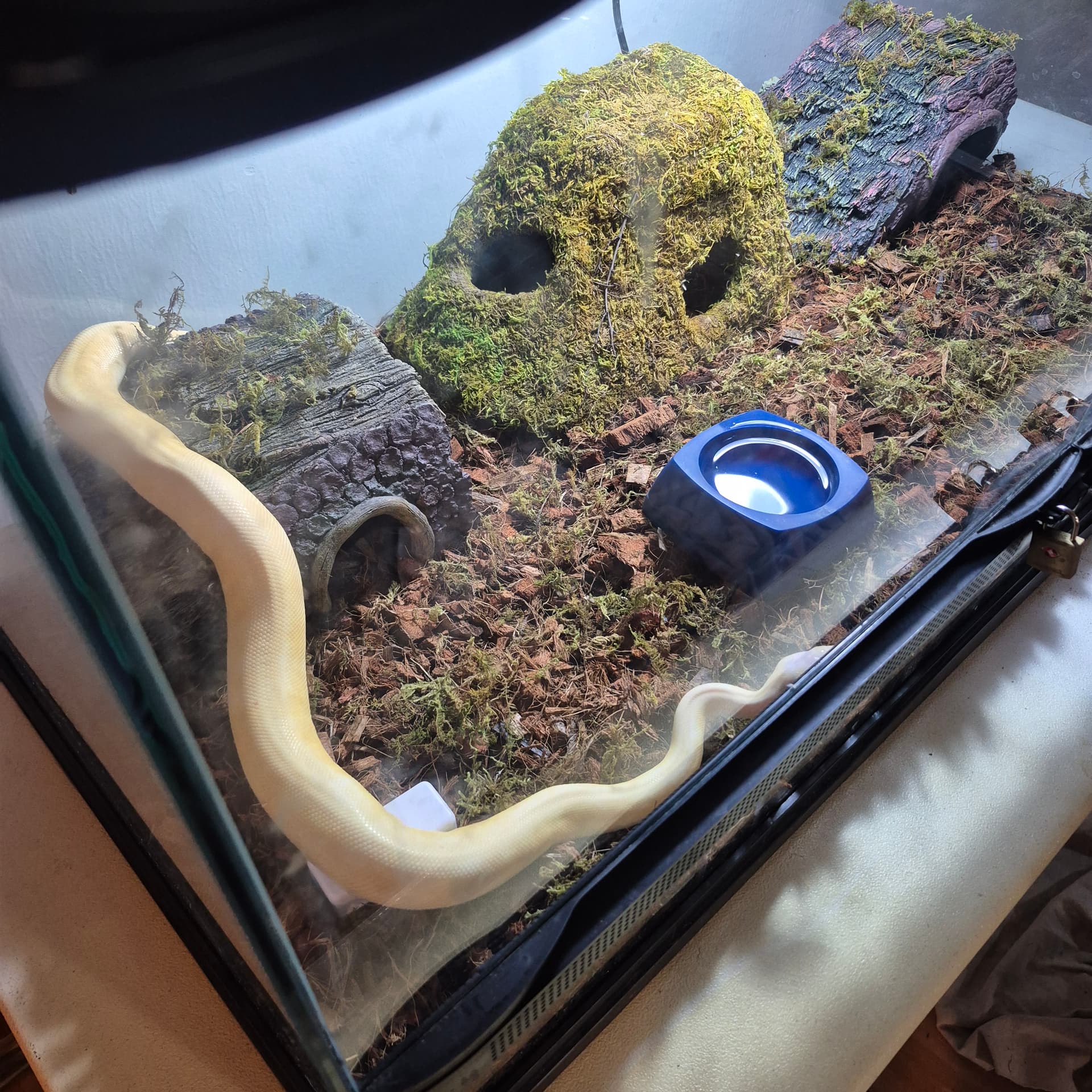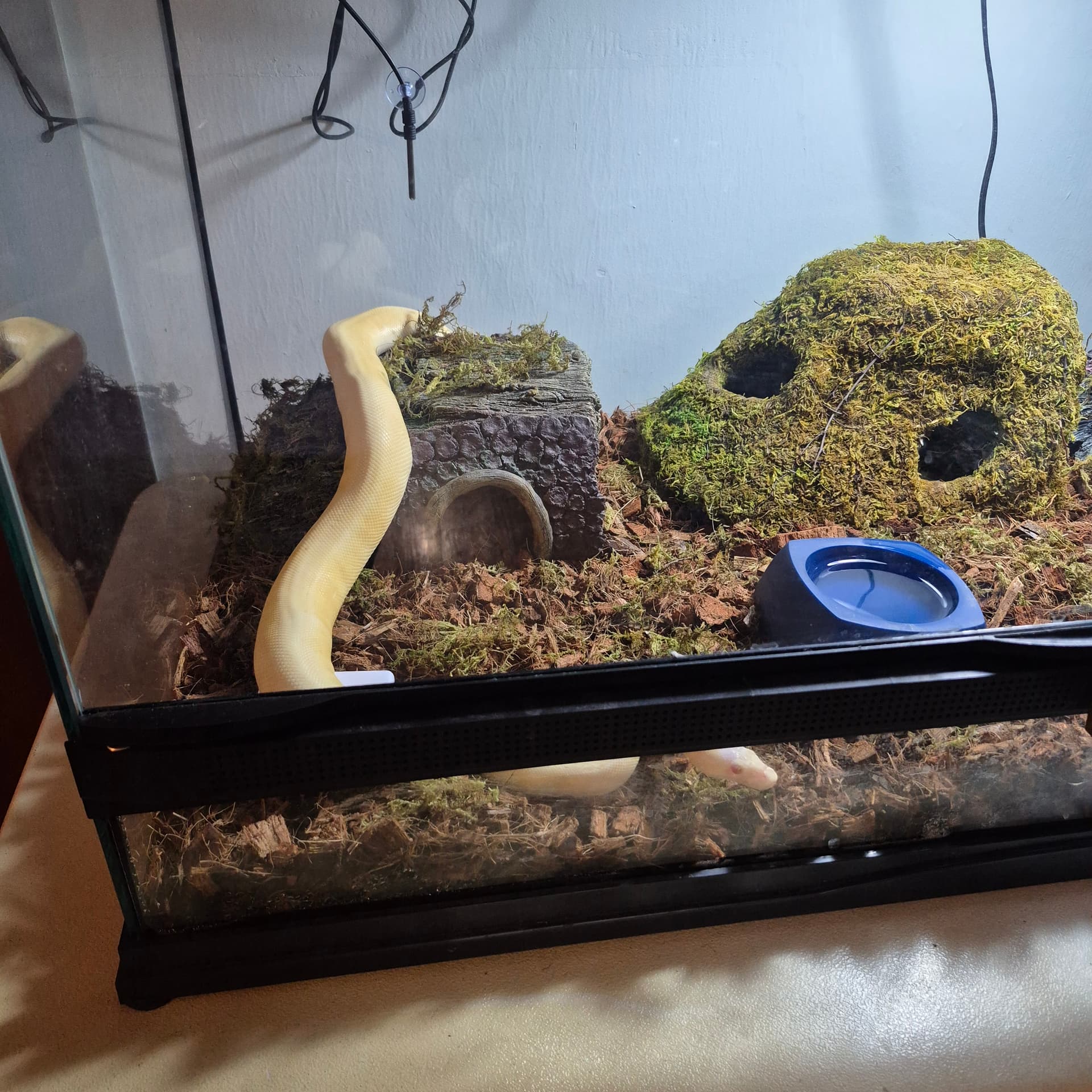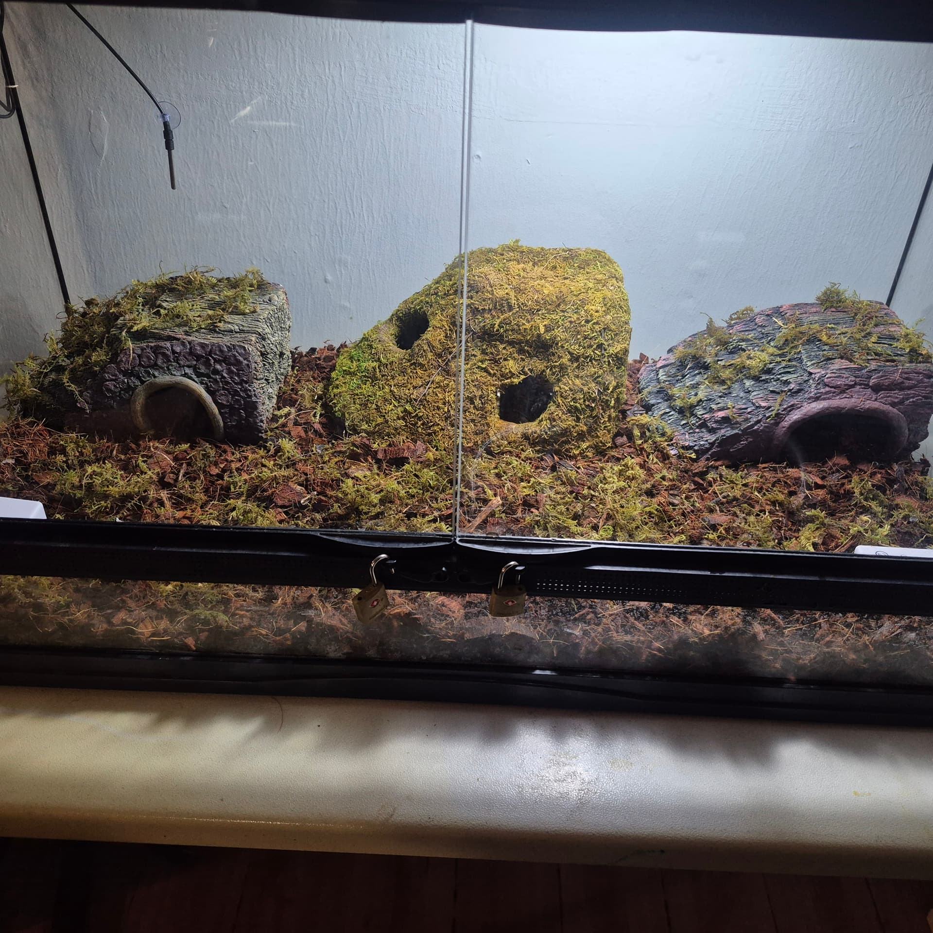 Sorry posting again but I thought Id share I know this is ganna last .2 seconds once I move flame over but to me this is very visually appealing (water bowl stays with him till the move new heat setup gatta make sure it stays in range) hes smaller so this 40 gallon tank i felt needed a 3rd hide to make him feel safer