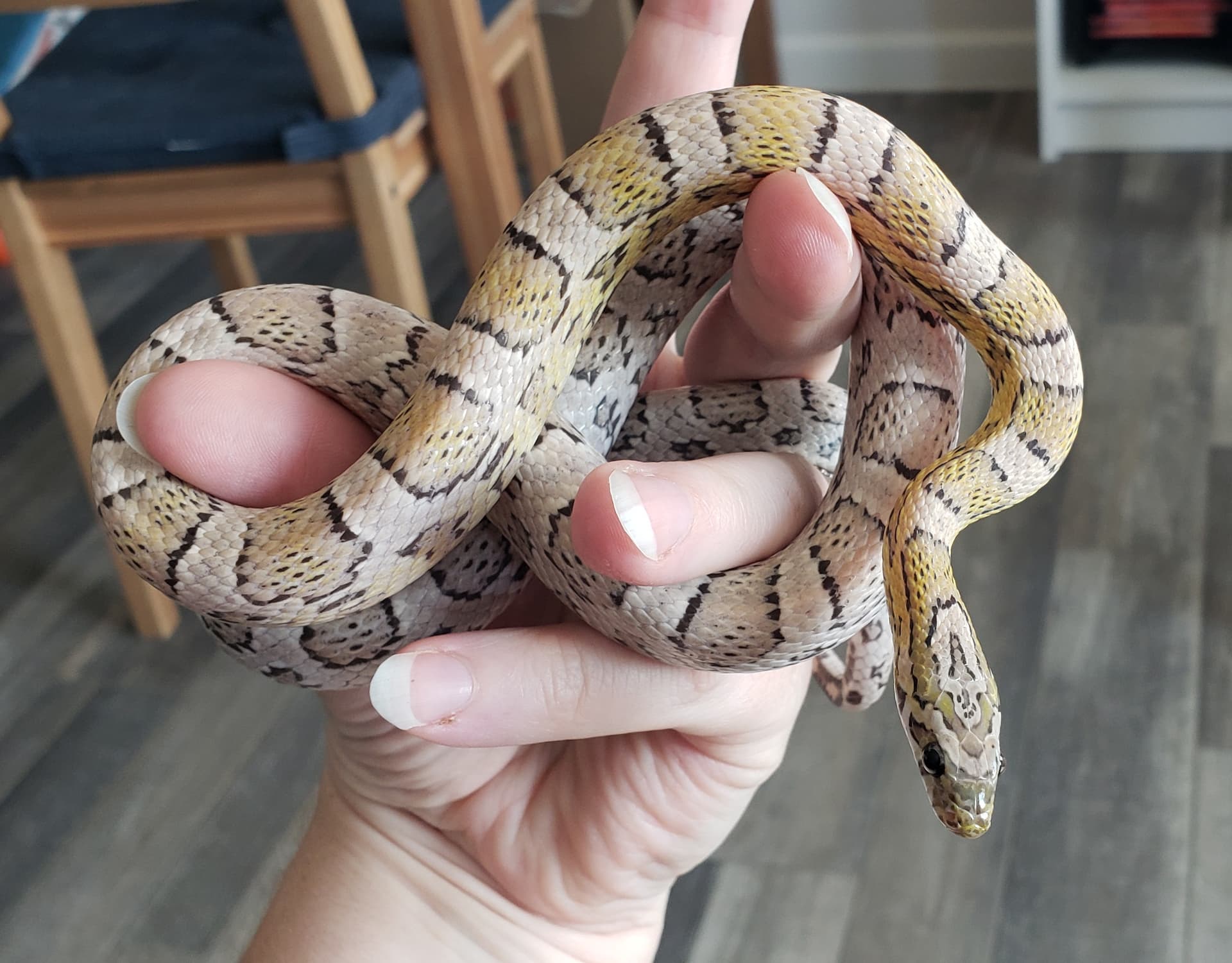 Sunkissed anery (by the way, if you click to see the full size versions of the photos, I labeled everything). She’s not a super typical sunkissed anery, if you want to see her parents or siblings, reach out to Cornbred Reptiles. It takes a little while to start developing those colors (and she will get more - she’s only like 120 grams, nowhere near full grown). Here’s a hatchling picture so you can see how she changed.