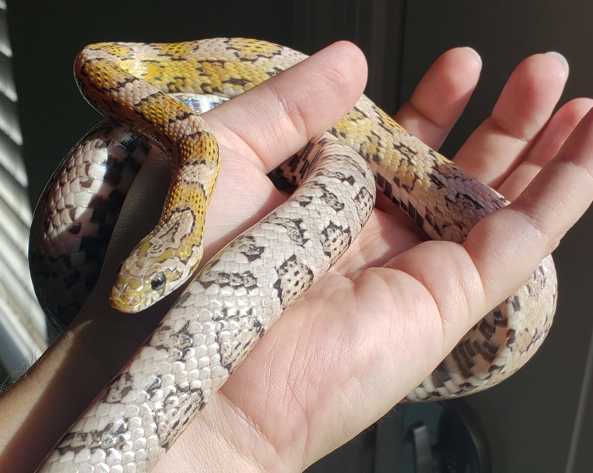 And a quick picture of Lark, ultramel tessera. She looks and feels and acts very gravid. She hasn’t been bred, so I’m hoping she reabsorbs. You can see the gravid shape of her body and the scale spread in this photo.