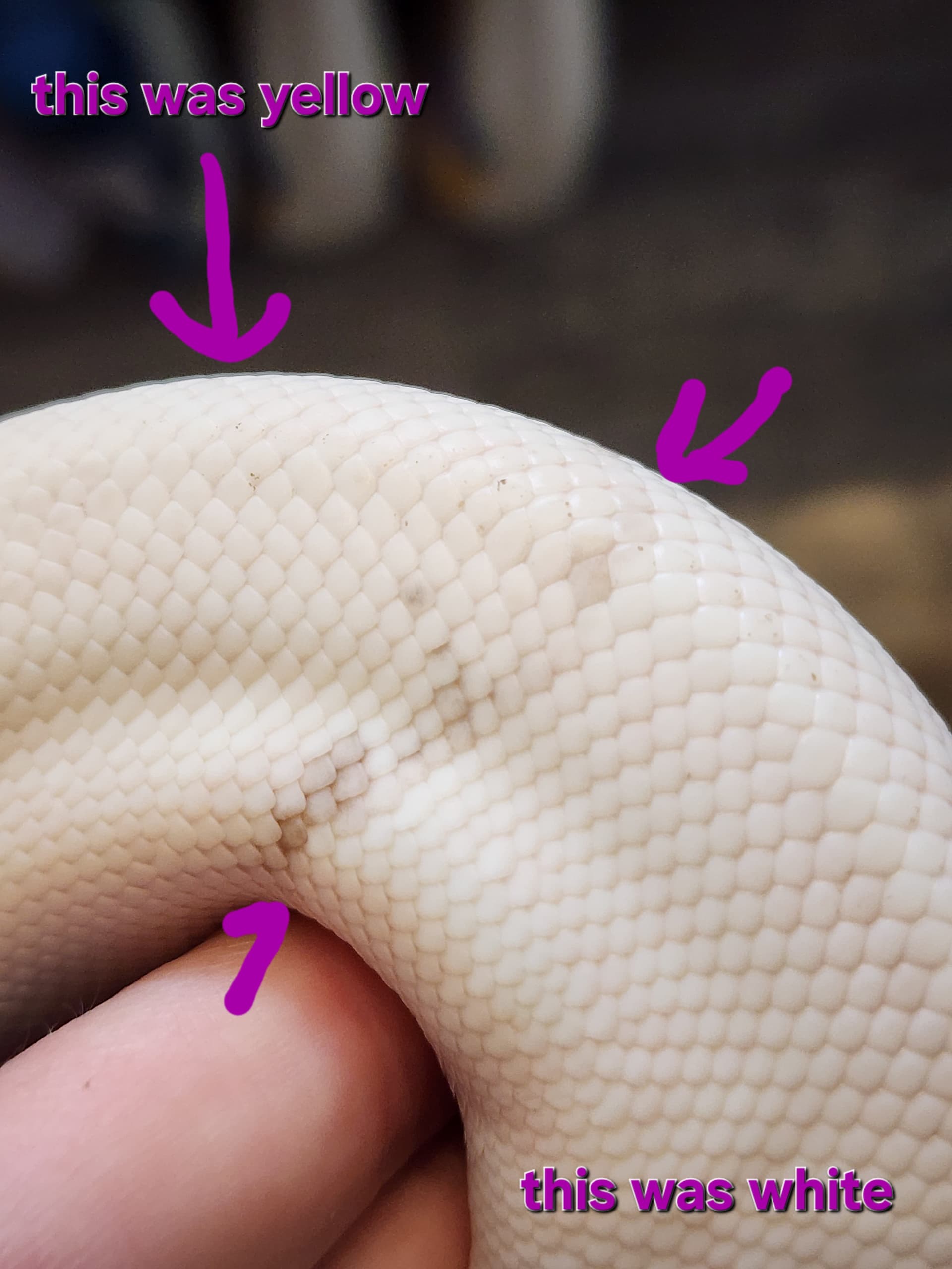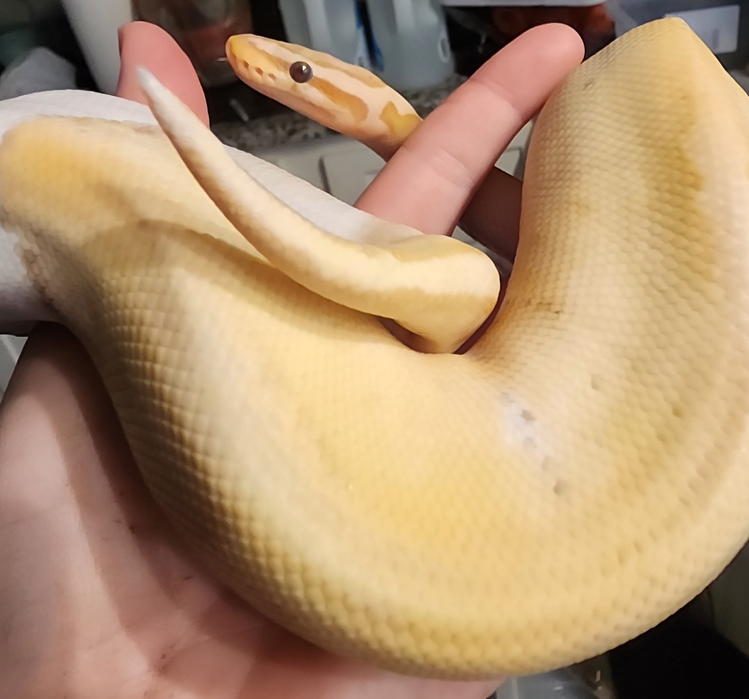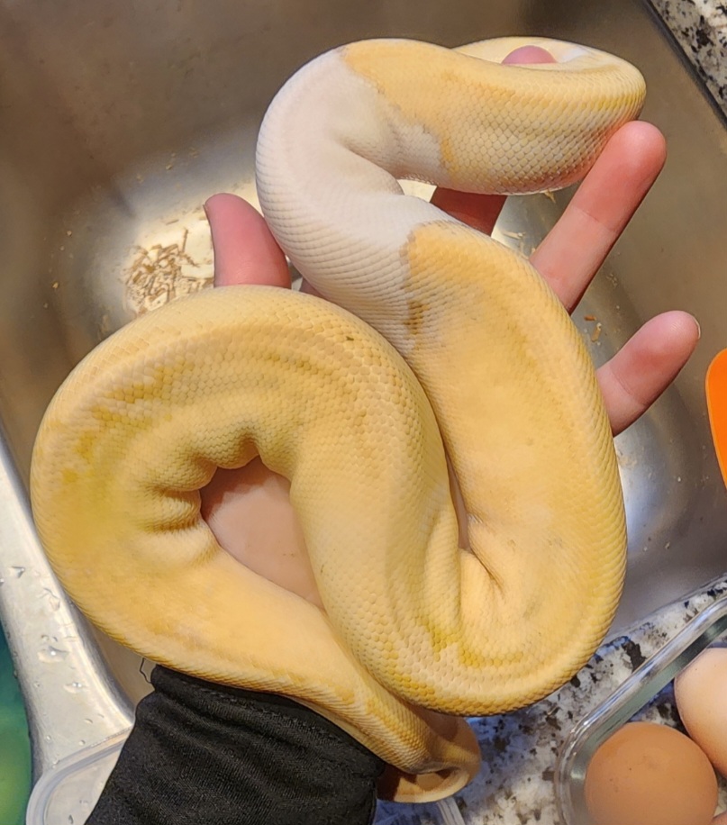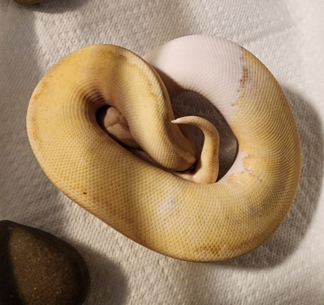 “Black and White Overnight” indeed. I knew that this girl would fade out over time, especially being a Pastel Banana Pied, but imagine my shock when I lifted her hide and found a dirty white snake in the place of my yellow snake. She was deep in blue, so i thought that maybe it was just a rough shed and that’s why she looked white. It did take her longer to shed out than usual, but here she is, still white. Thought it would neat to share. Also, has anyone done any line breeding with snakes thay both are showing the polygenic axanthicism? I’ve done a little reading around, but not nearly enough. Thanks for checking this out!