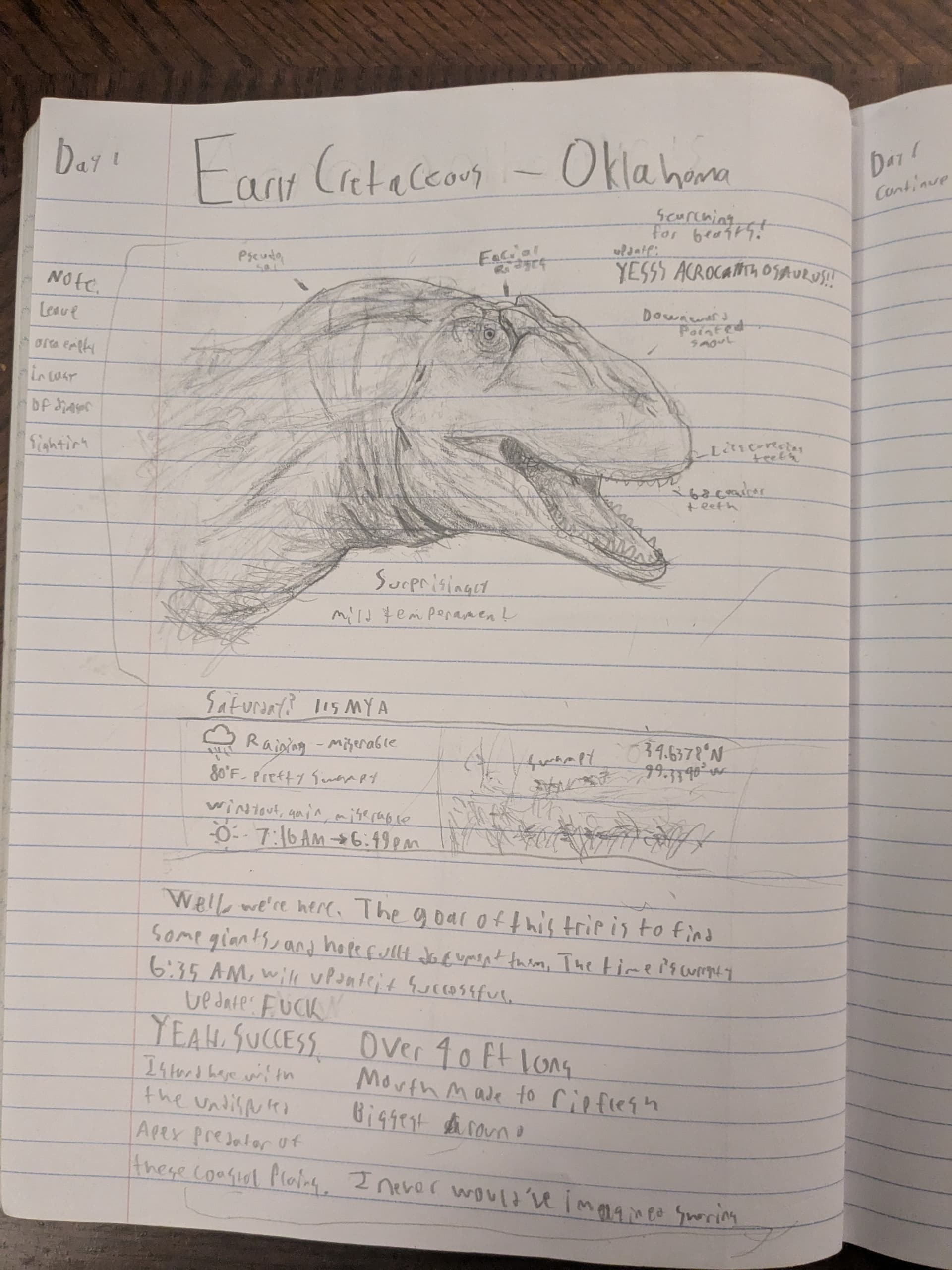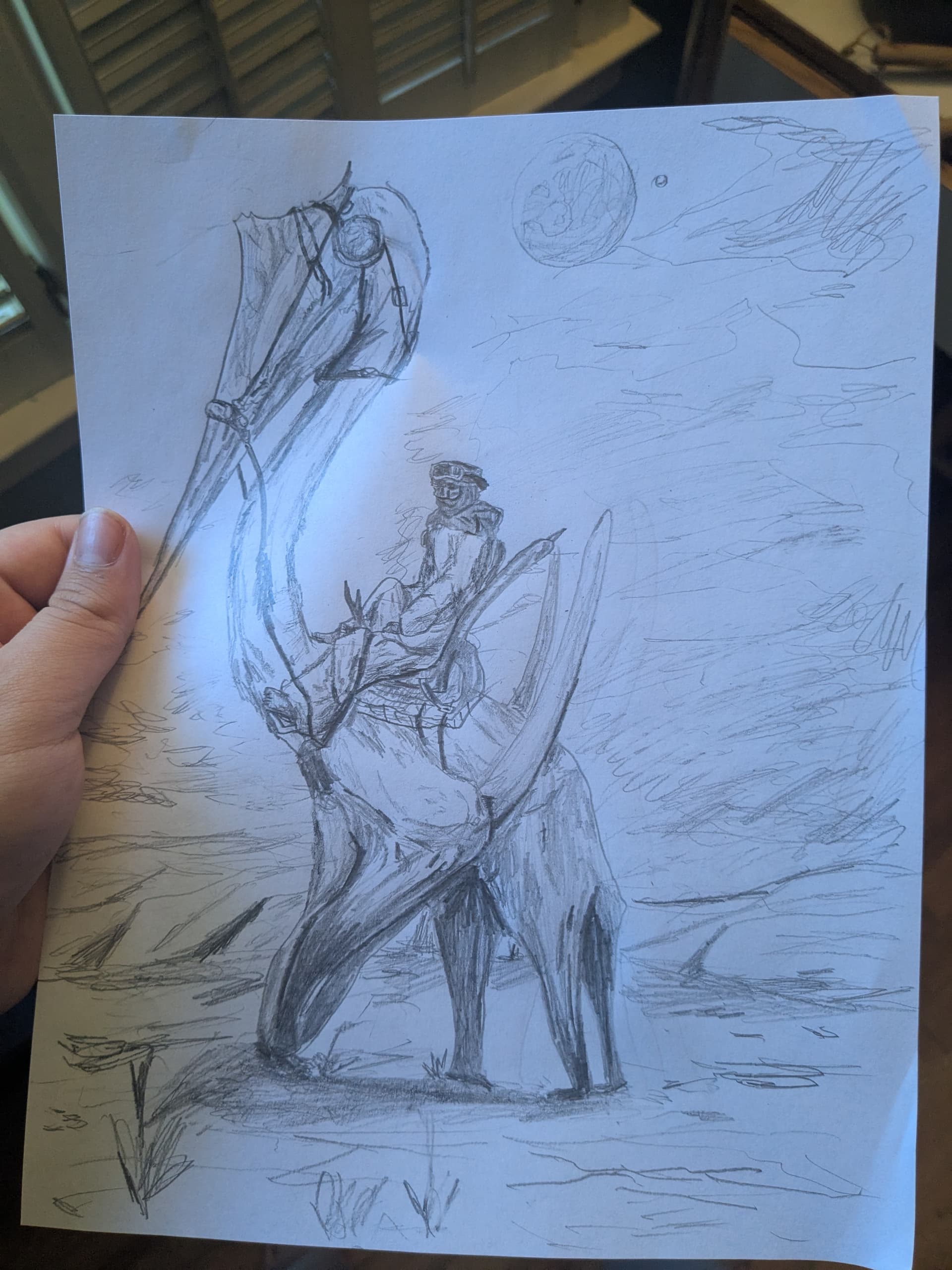 Realized I hadn’t posted here in a long while. So here’s the projects I’ve worked on in the meantime. Tyrannosaurus Rex sketch, journal experiment (excuse my terrible handwriting haha), and an idea a buddy of mine had for dinosaurs (and pterosaurs) being used as a form of transport and asked me to draw it up. Considering doing a bigger project soon, something more complete and detailed, one that I might spend days on instead of cranking it out on a couple hours