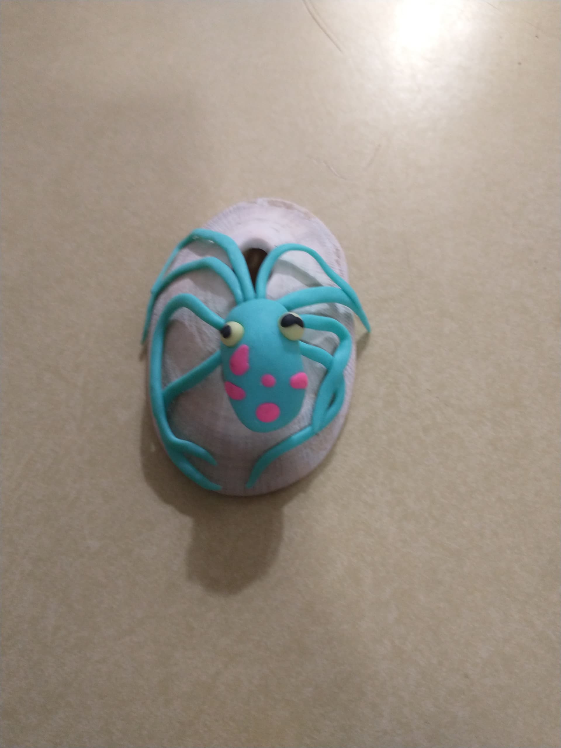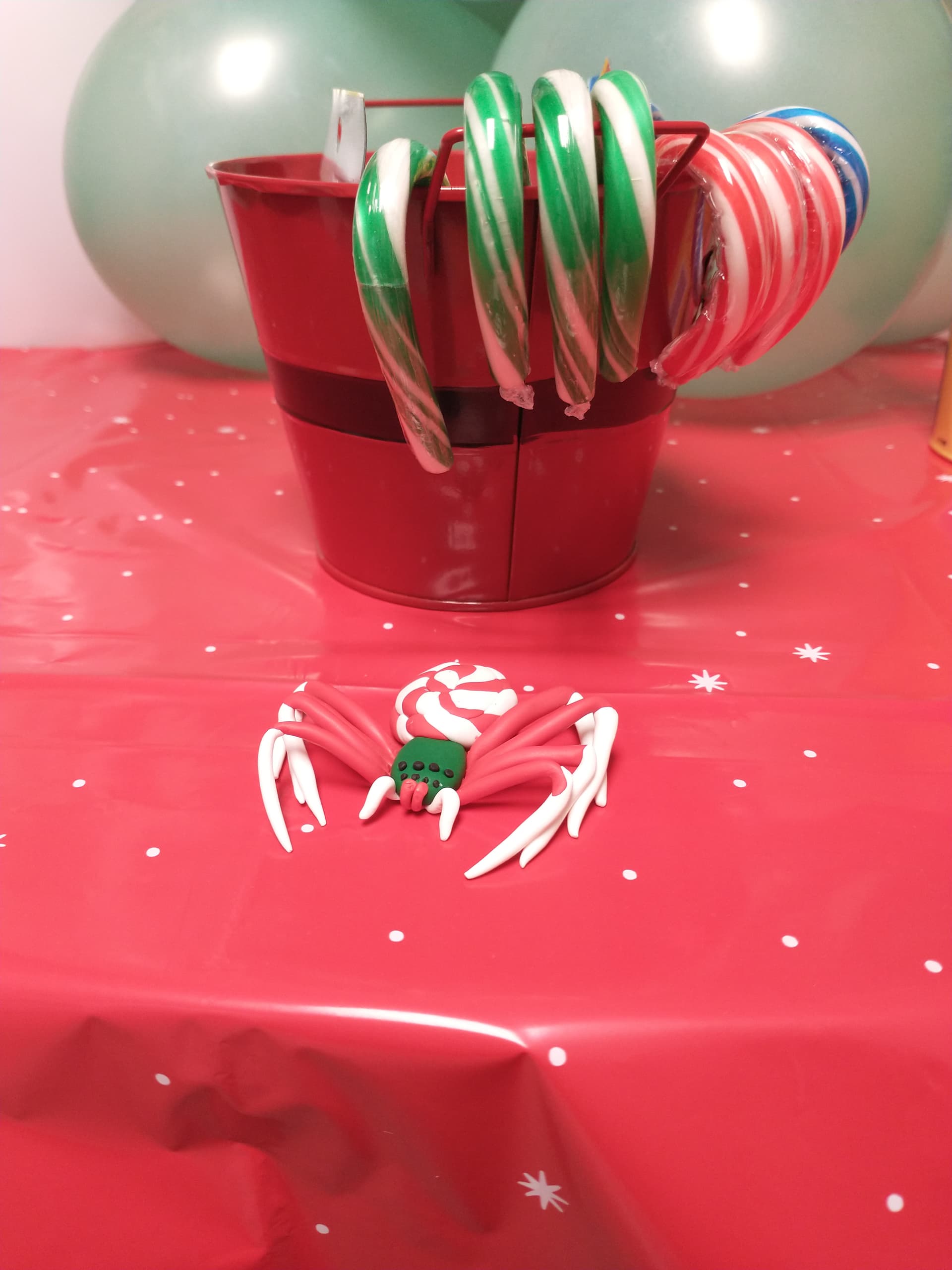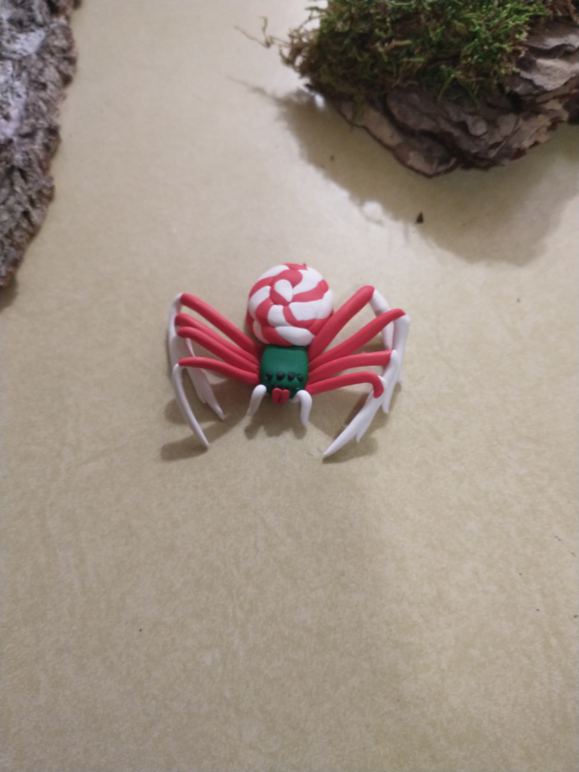 It’s actually red and white, I think the picture just washed out the red slightly. It’s supposed to be Christmas themed, which is why I made the cephalothorax green, but in hindsight, I wish I’d made it white instead, I think it would have looked better. The abdomen is supposed to look like a peppermint. I added pedipalps and chelicerae to it and just put it in the oven to bake, I’ll get an updated picture when it’s done.