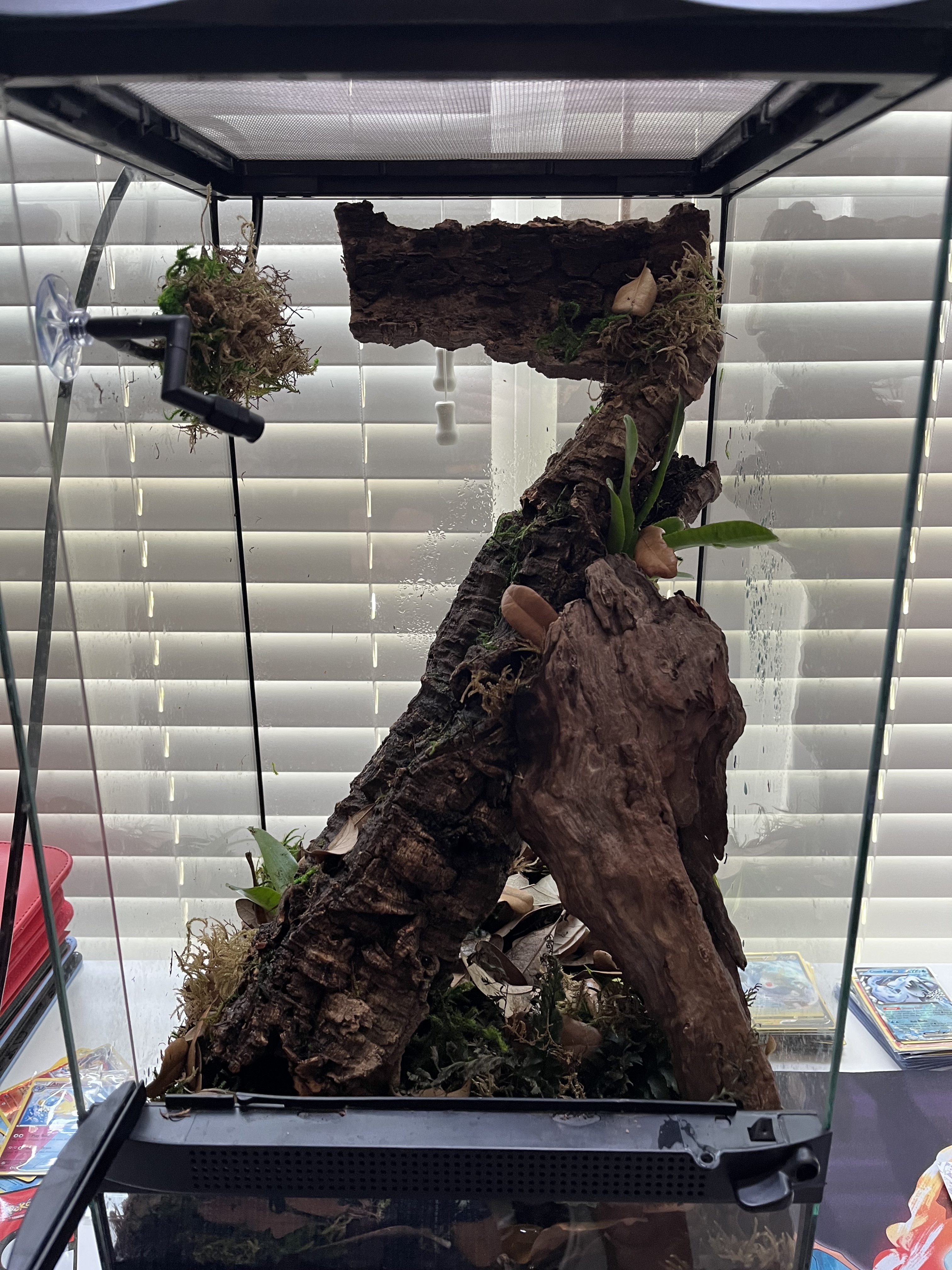 still waiting on my gecko, but will probably get it in a few days! I decided not to put in a backdrop, but I did glue corkwood to the wall and also added live moss and a mister. It is looking good and can’t wait to get my geko.