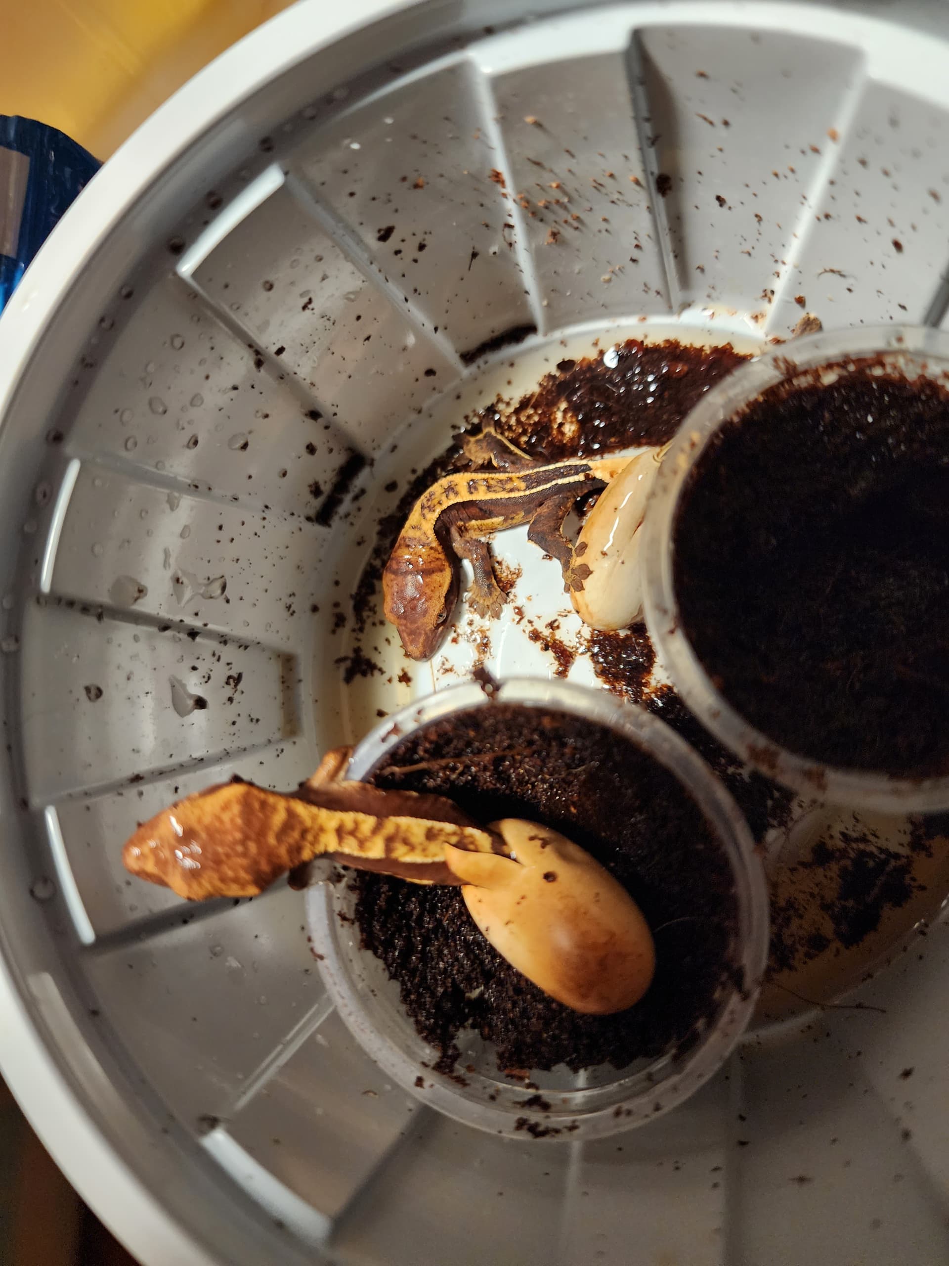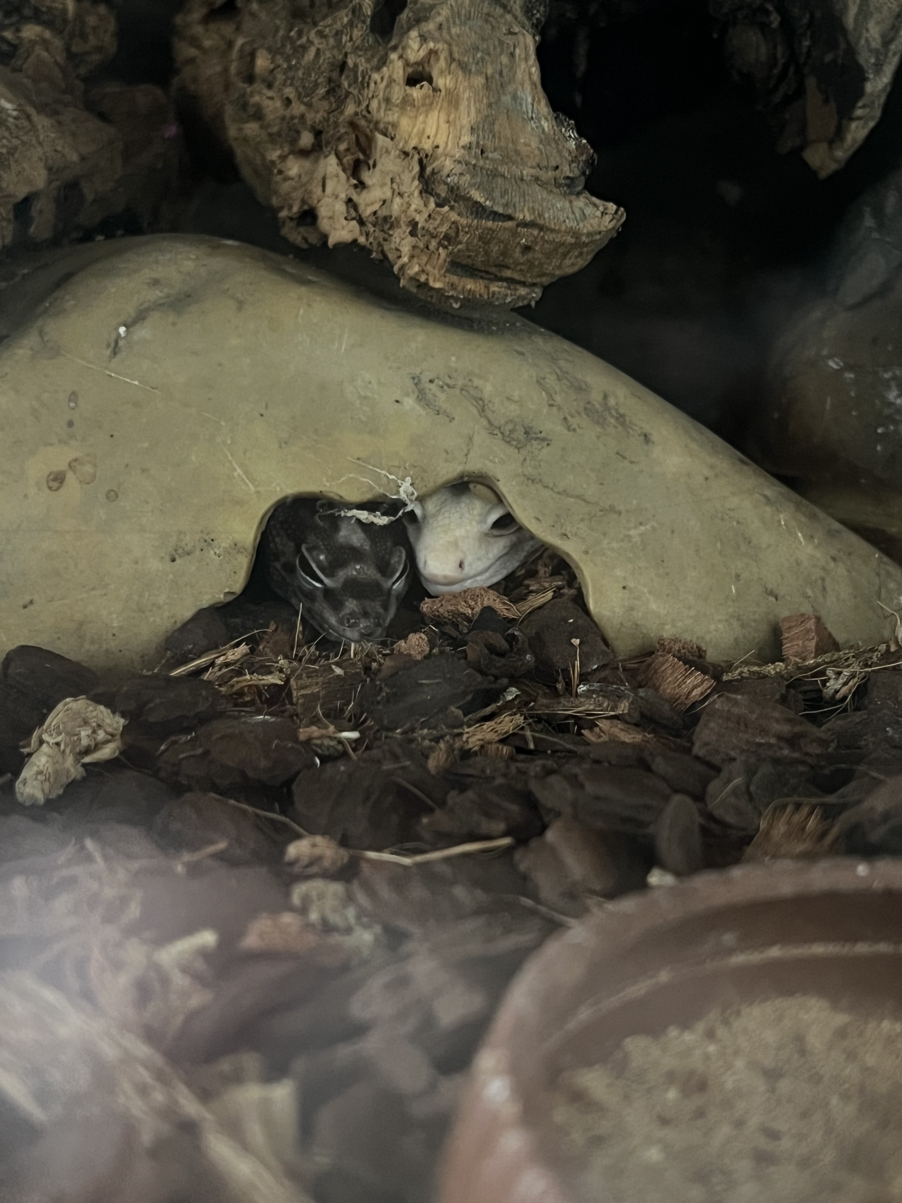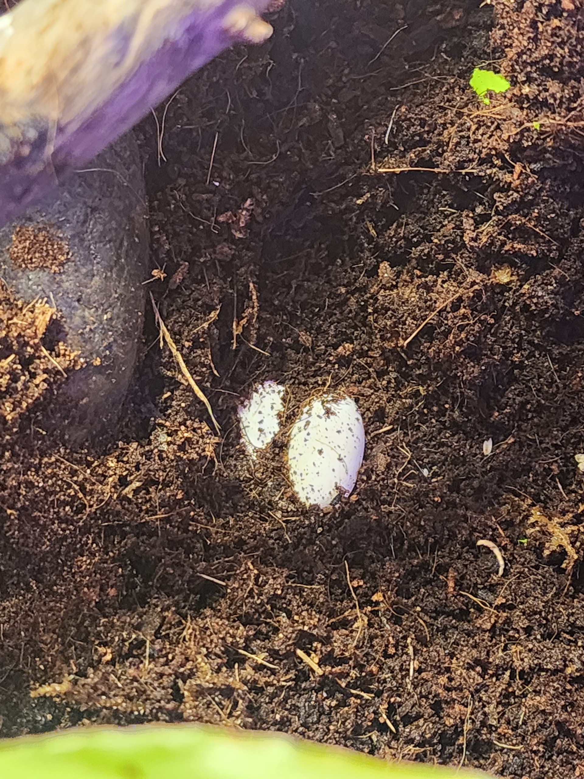 Hi im new to this app and the hobby but these are my breeding pair of crested geckos. (Momma Chungus- Harlequin) ( Cerbus- charcoal or atleast thats what the person said😅) & their first cluch of eggs found 8/5/23🥰