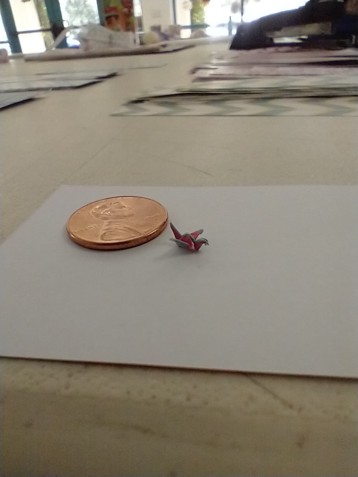 I told one of my coworkers that when I was a teenager, I used to be able to fold teeny tiny paper cranes. She challenged me to see if I could still do it and made me a miniscule square of paper to work with (this piece of paper was roughly the width of one of the lines on a college ruled piece of lined paper, for reference). I still got it!