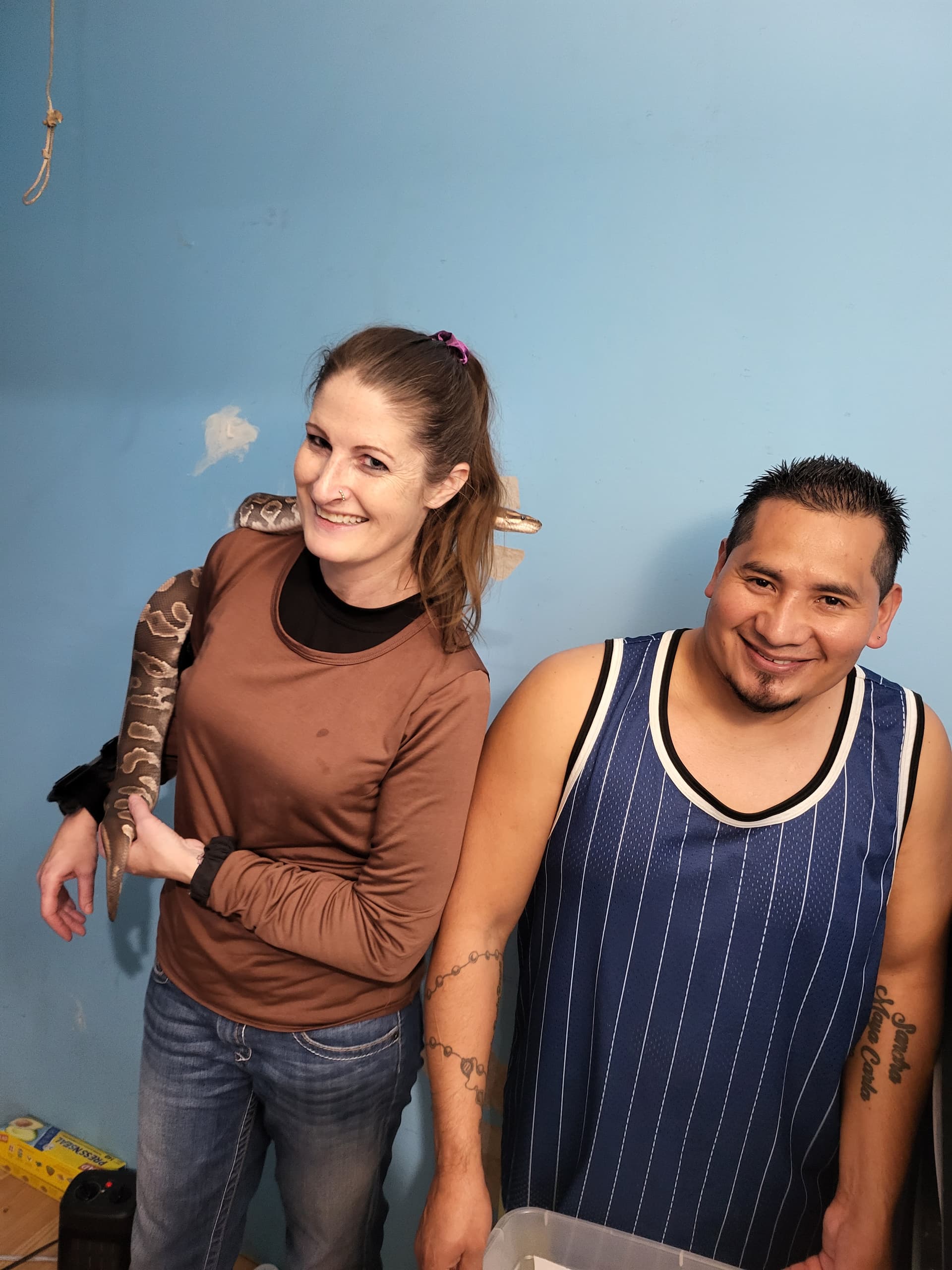 Here’s a silly one. Our girl Wednesday sizing up my husband and realizing she’s taller than him. Him not realizing that snakes eat people in their sleep