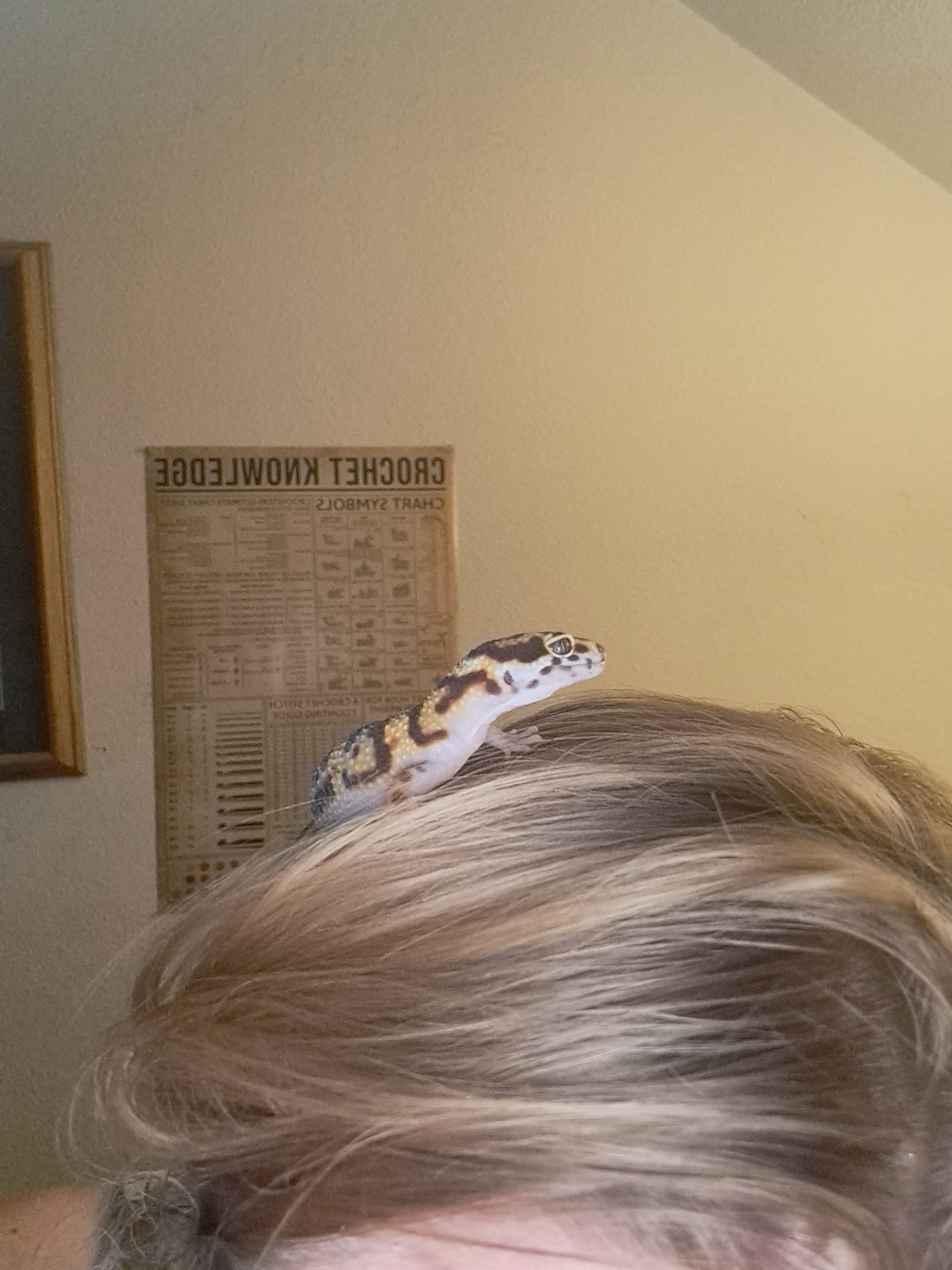 Now for the story. Every day I spot clean his enclosure and weekly change out the paper towels. This is the time we socialize with the family. I take him out and put him on my shirt. Then he climbs up into my hair and supervises my work. Then we go visiting the family while i hold him. We sit on the bed, and he climbs back up into my hair and watches the fish. Lol. Love this guy