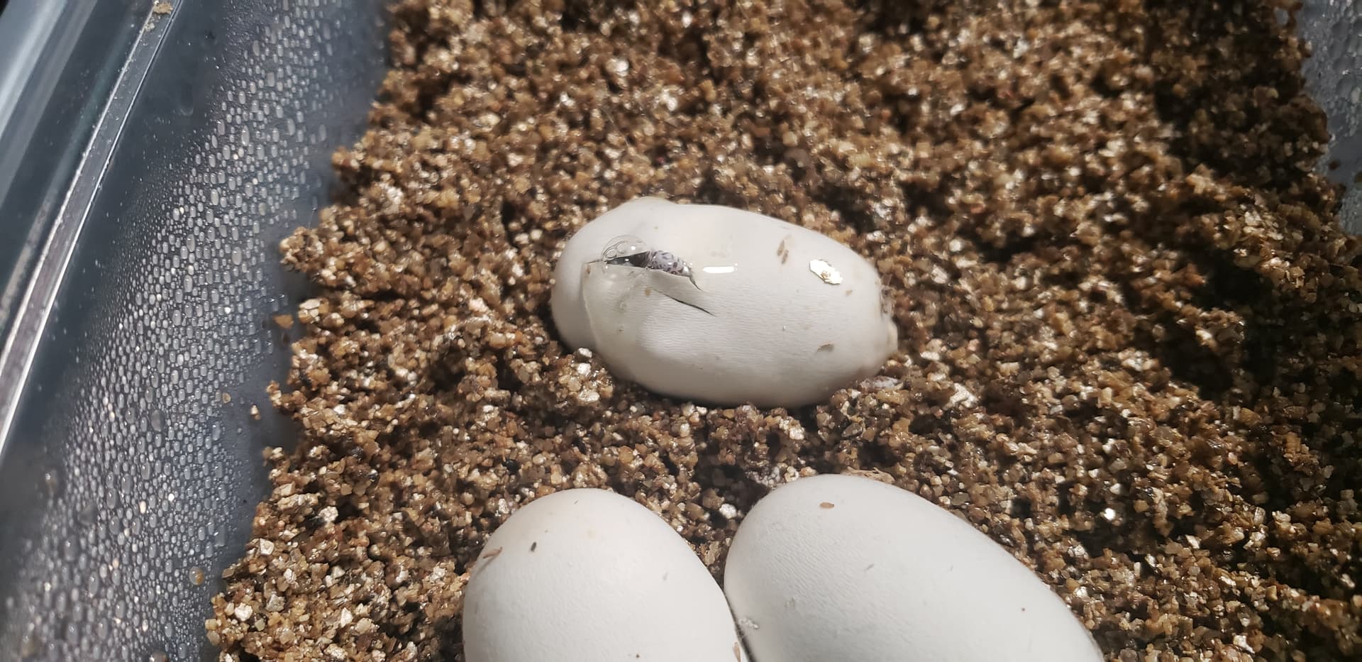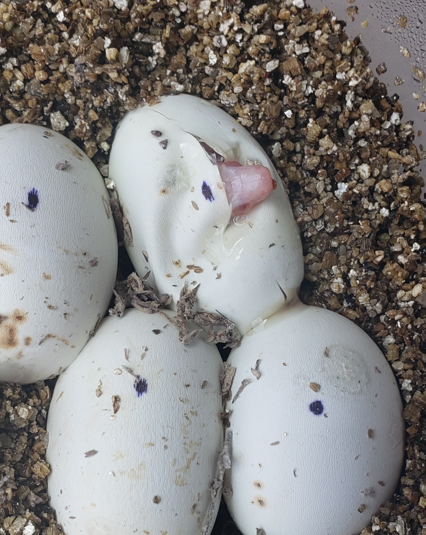 First pip of the year! Kirby and Cicada’s three eggs, day 68: