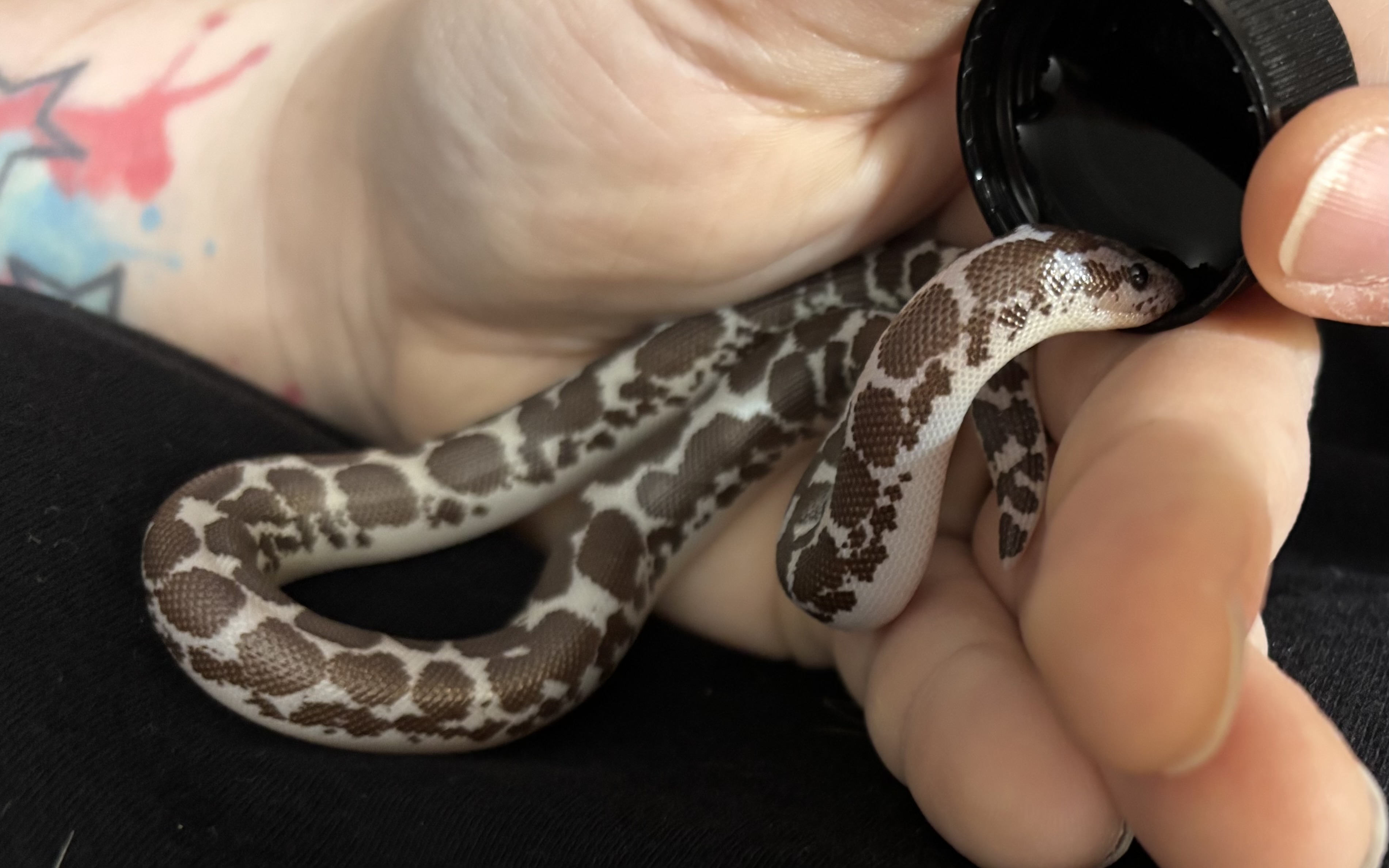 I told the vet the same thing I asked about here, talked to him about the double pinkies and that I had a shipment of “peach fuzzies” on the way from Perfect Prey. He agreed with the vitamin powders (with a “he still eats it covered in powder? Damn, then yeah, keep it up!”) and gave me a calcium to inject into the fuzzies/pinkies.