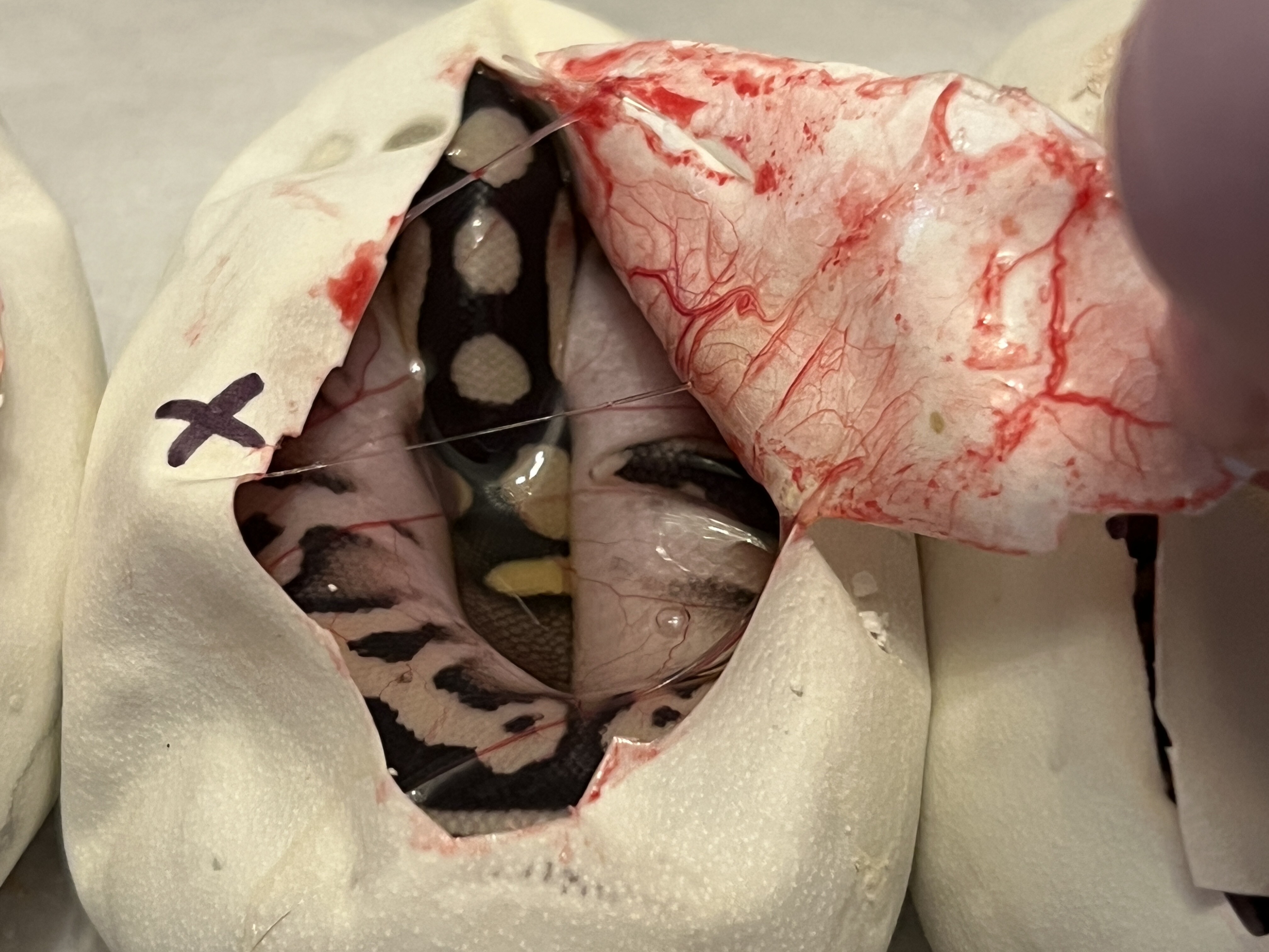 And the underdeveloped baby (it was still alive in these pics, just extremely weak and unresponsive. Seems like it didn’t absorb any of the yolk, but I also didn’t see anything wrong with the umbilical cord either.) :